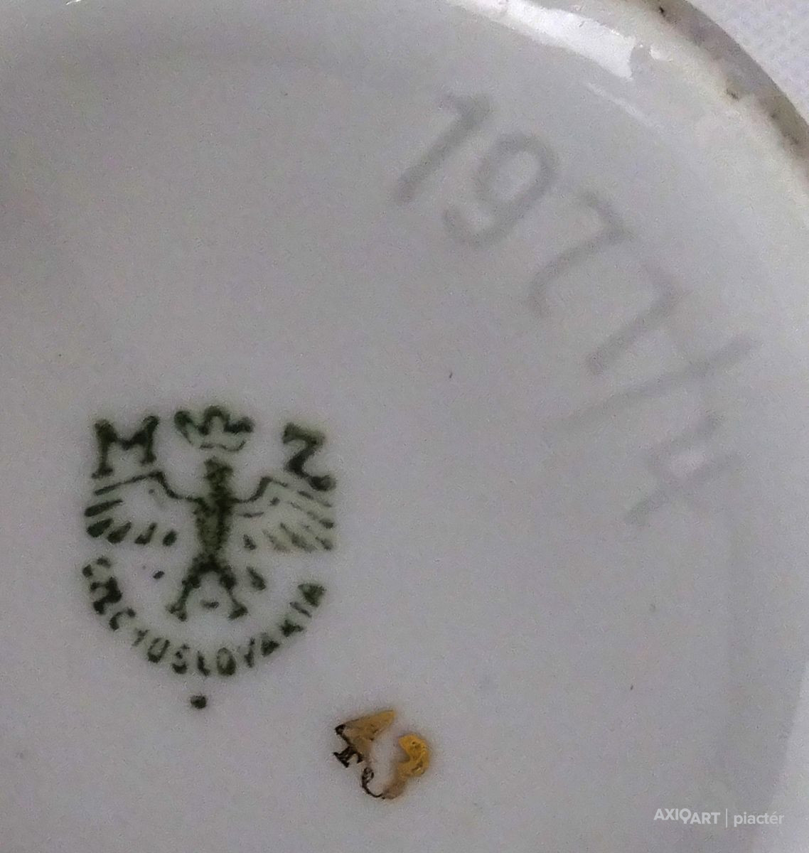 [1T558/X102] Szép állapotú, aranyozott, virág motívumokkal díszített porcelán kávéskészlet. Alján zöld koronás, címerállatos márkajelzés: MZ CZECHOSLOVAKIA A készlet darabjai: - 1 darab kávéskanna (18 x 10.5 x 18.8 cm) - 1 darab cukortartó (9.6 x 9.8 x 13.5 cm) - 1 darab tejszínes kiöntő (10 x 7.5 x 11.7 cm) - 6 darab kávéscsésze (4.2 x 7.3 x 9 cm) Egyik csésze peremén kisebb sérülés, lásd fotó. - 6 darab alátét tányér (10.8 cm) Súly: 1.31 kg