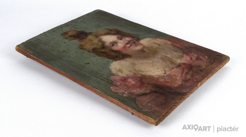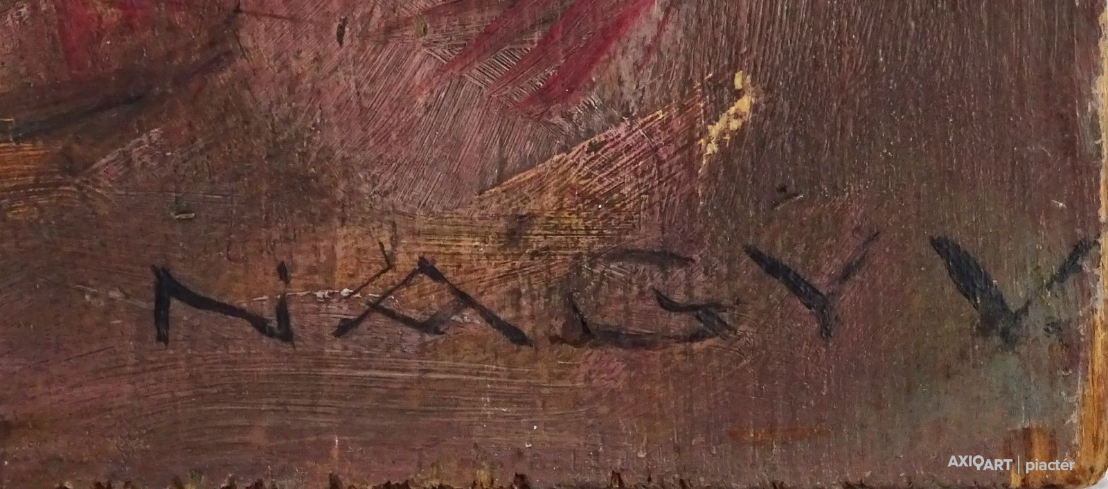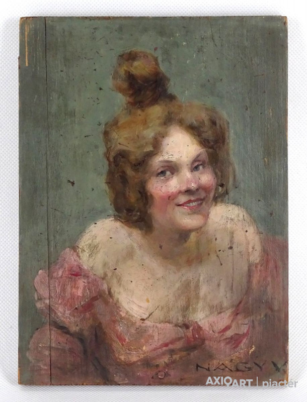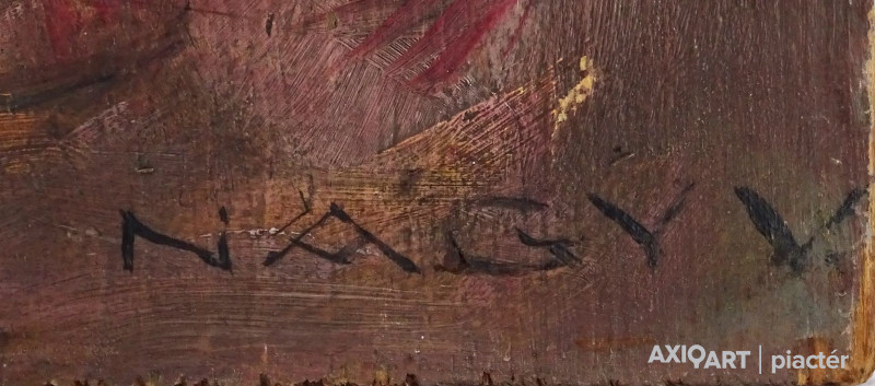 [1I057/033] Olaj fa deszka festmény, keret nélkül, akasztási lehetőséggel. Jelezve jobbra lent: NAGY V. Magasság: 23.5 cm Szélesség: 17 cm Súly: 0.25 kg NAGY VILMOS BUDAPEST, 1874 - 1953, BUDAPEST   Festő, grafikus. A budapesti Mintarajziskolában tanult, majd Hollandiában és Párizsban képezte magát. Mestere: Lotz Károly. Nyaranta Nagybányán dolgozott, ahol Hollósy Simon korrigálta. 1895-től szerepelt a Műcsarnok kiállításain. 1909-ben a Klotild-palotában mutatkozott be, 1910-ben gyűjteményes kiállítást rendezett műveiből a fővárosban. Szerepelt londoni, müncheni kiállításokon, több más európai nagyvárosban is bemutatkozott. 1908-ban Londonban aranyérmet nyert, 1922-ben Halmos-díjjal, 1923-ban a Műbarátok nagydíjával jutalmazták. Több képe található a Szépművészeti Múzeum gyűjteményében.
