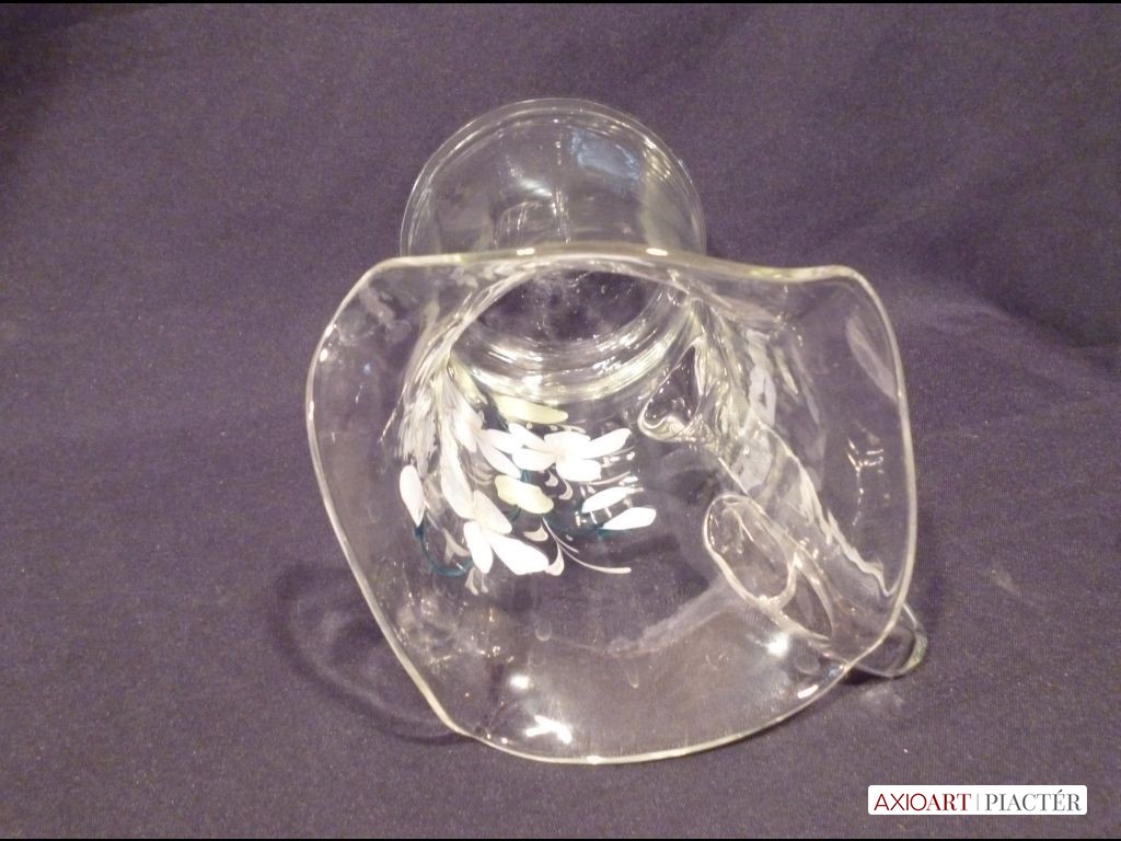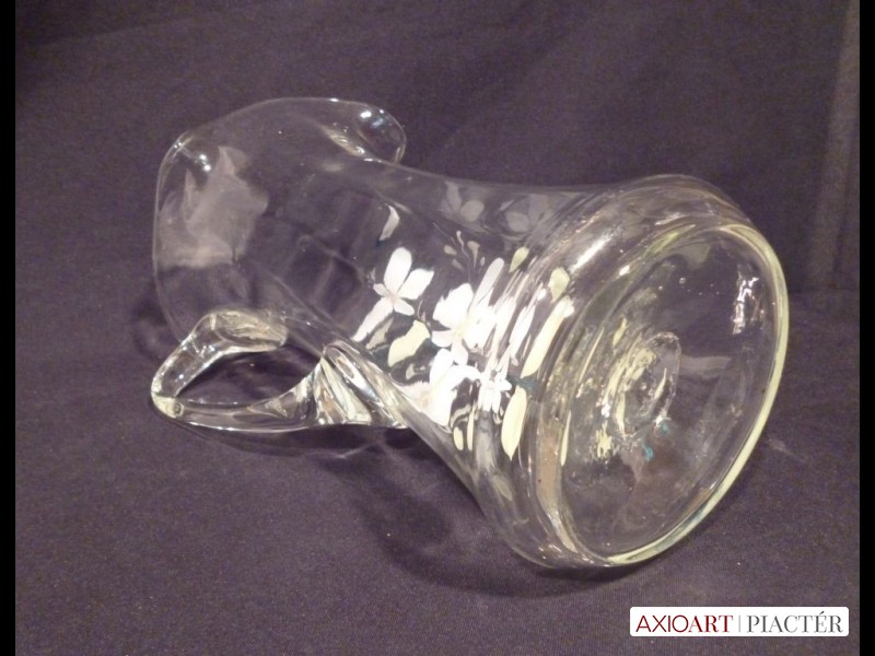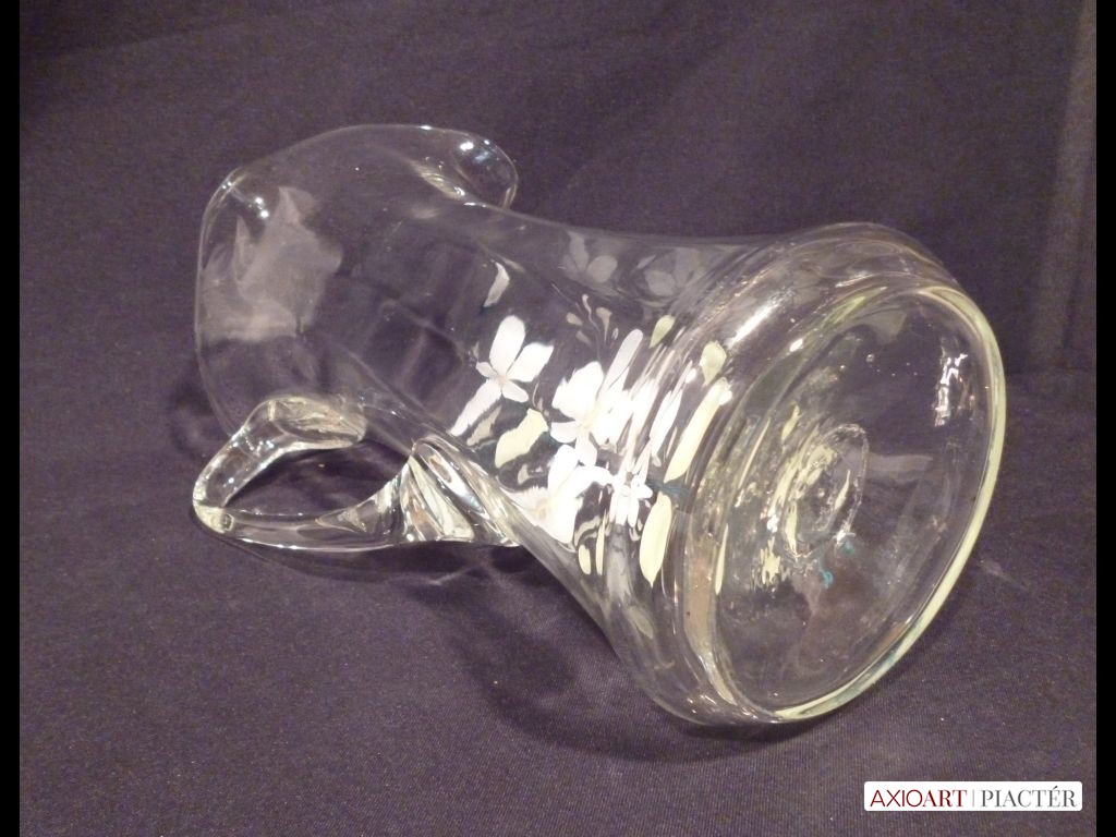 [1230/VTR-10] 1800-as évekbeli festett fehér hibátlan üvegkancsó, díszkancsó. Alján láthatóan szakított üveg. Kora 1870-80 közötti. Lepattanás mentes, hibátlan darab. Gyűjteménybe való darab. Magasság: 21 cm Szélesség: 17 cm   Magassága 21 cm, szélessége 17 cm füllel együtt.