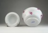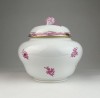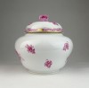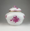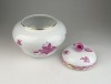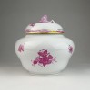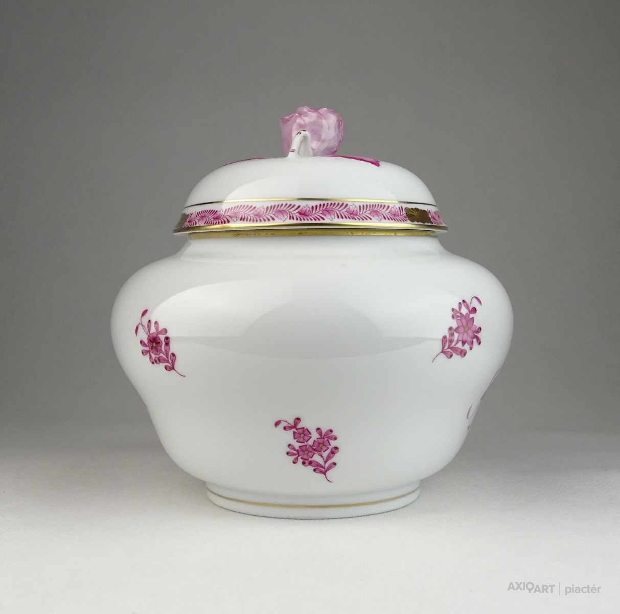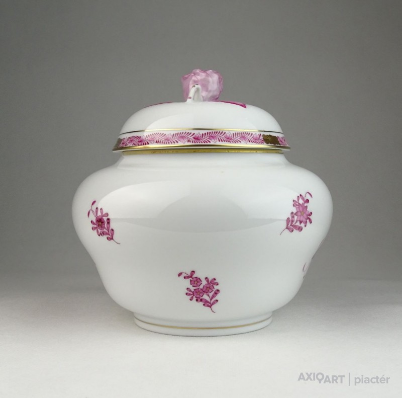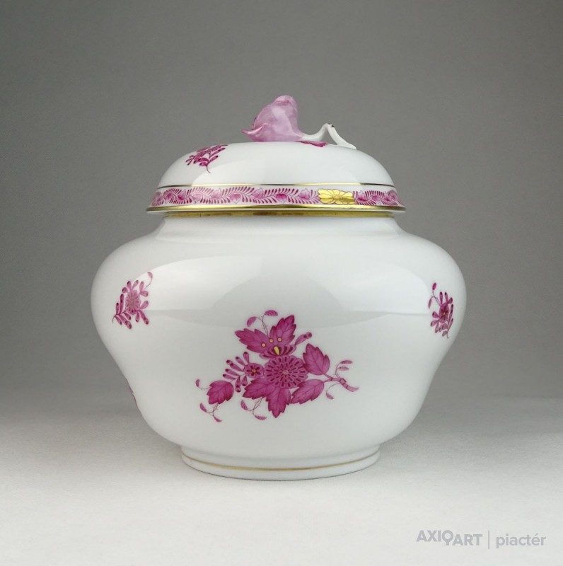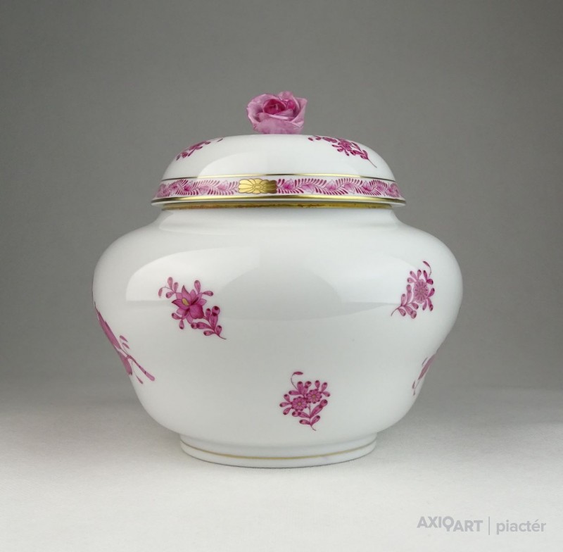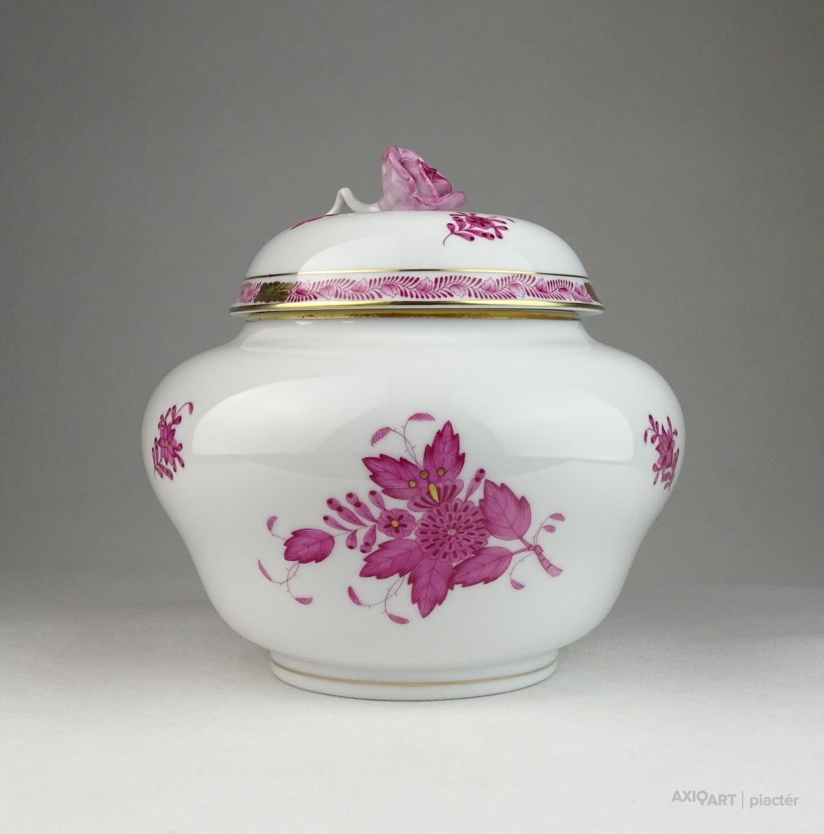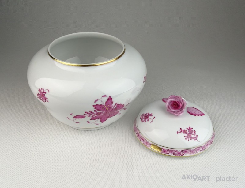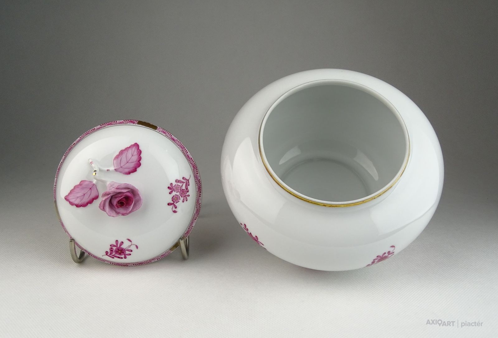 Hibátlan állapotú, jelzett, aranyozott, kézzel festett, nagyméretű, lila Apponyi mintás Herendi porcelán bonbonier. Tetején plasztikus rózsa dísz látható.