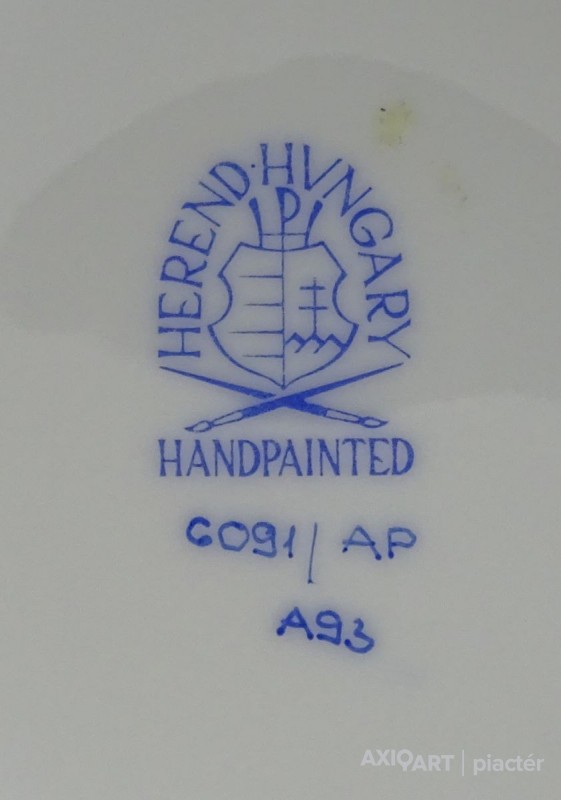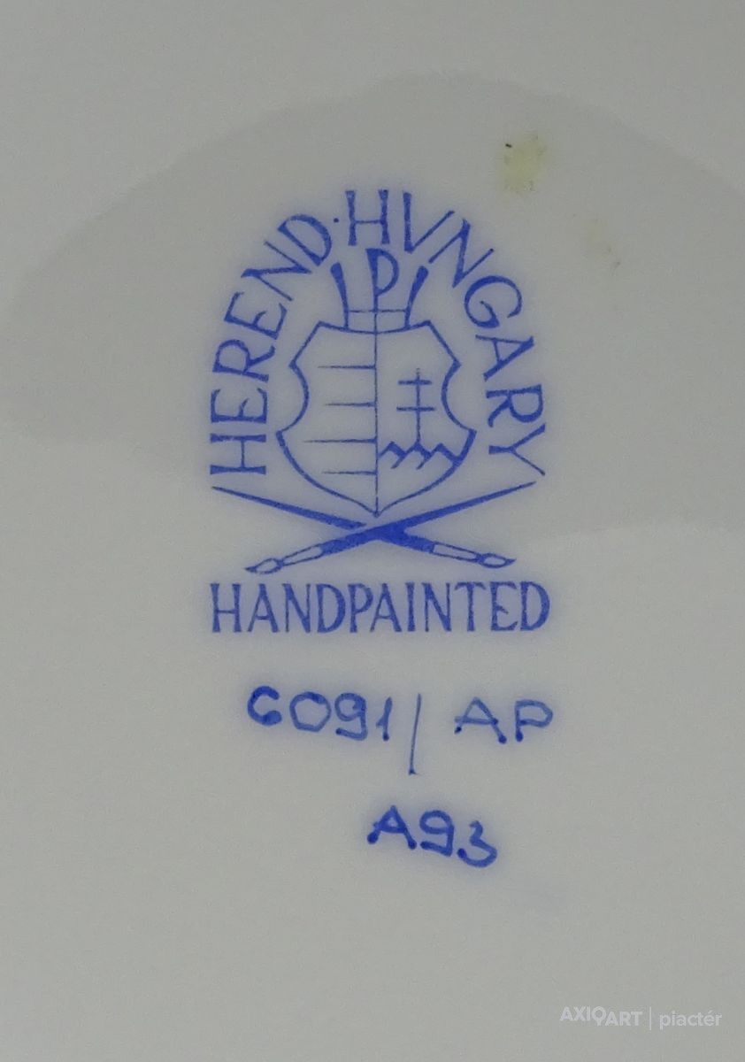 [0U702/BX-8] Hibátlan állapotú, jelzett, aranyozott, kézzel festett, nagyméretű, lila Apponyi mintás Herendi porcelán bonbonier. Tetején plasztikus rózsa dísz látható. Alján kék Herendi jelzés: HEREND HUNGARY HANDPAINTED Mélynyomással: HEREND Formaszám pirossal: 6091/AP Teljesen hibátlan, aranyozása is kopásmentes, azonnal ajándékba adható állapotban van. Magasság: 16 cm Szélesség: 16 cm Súly: 0.651 kg