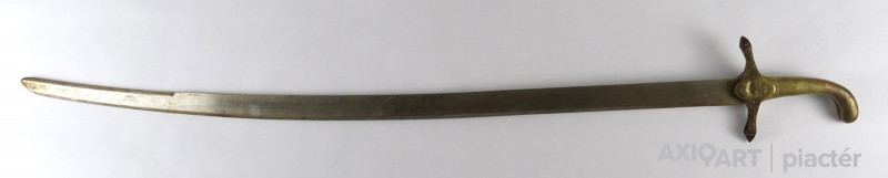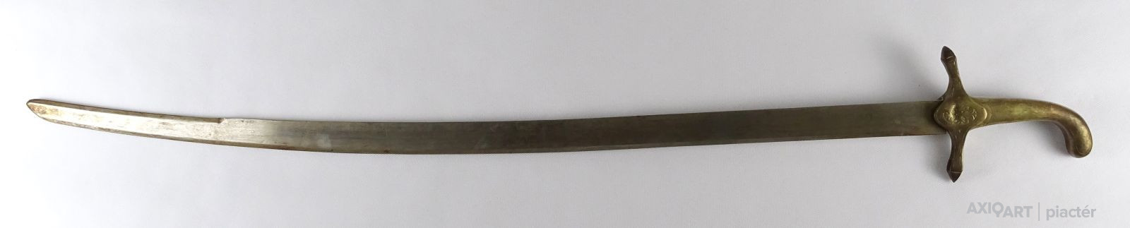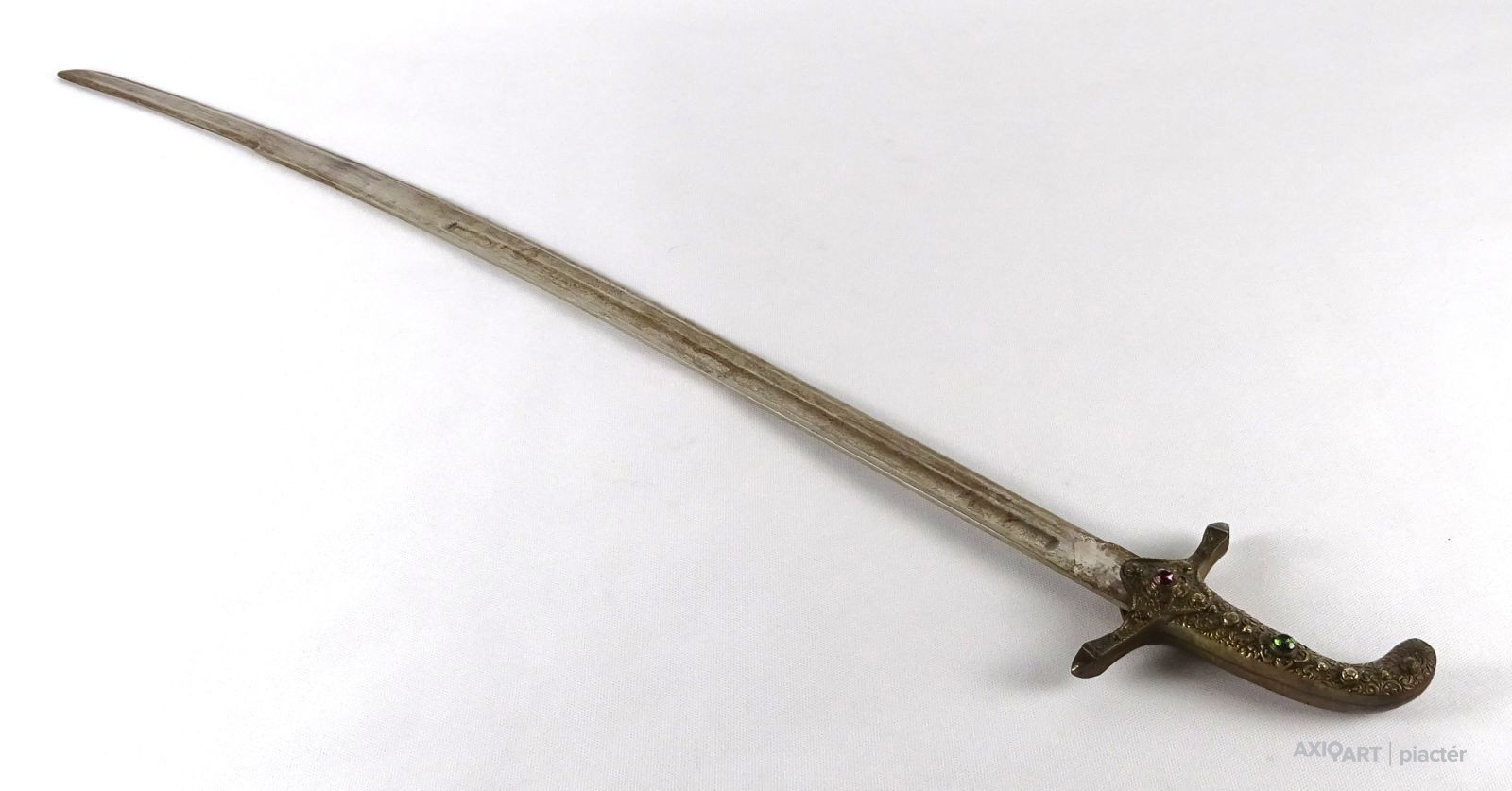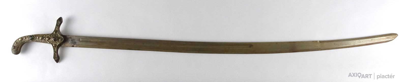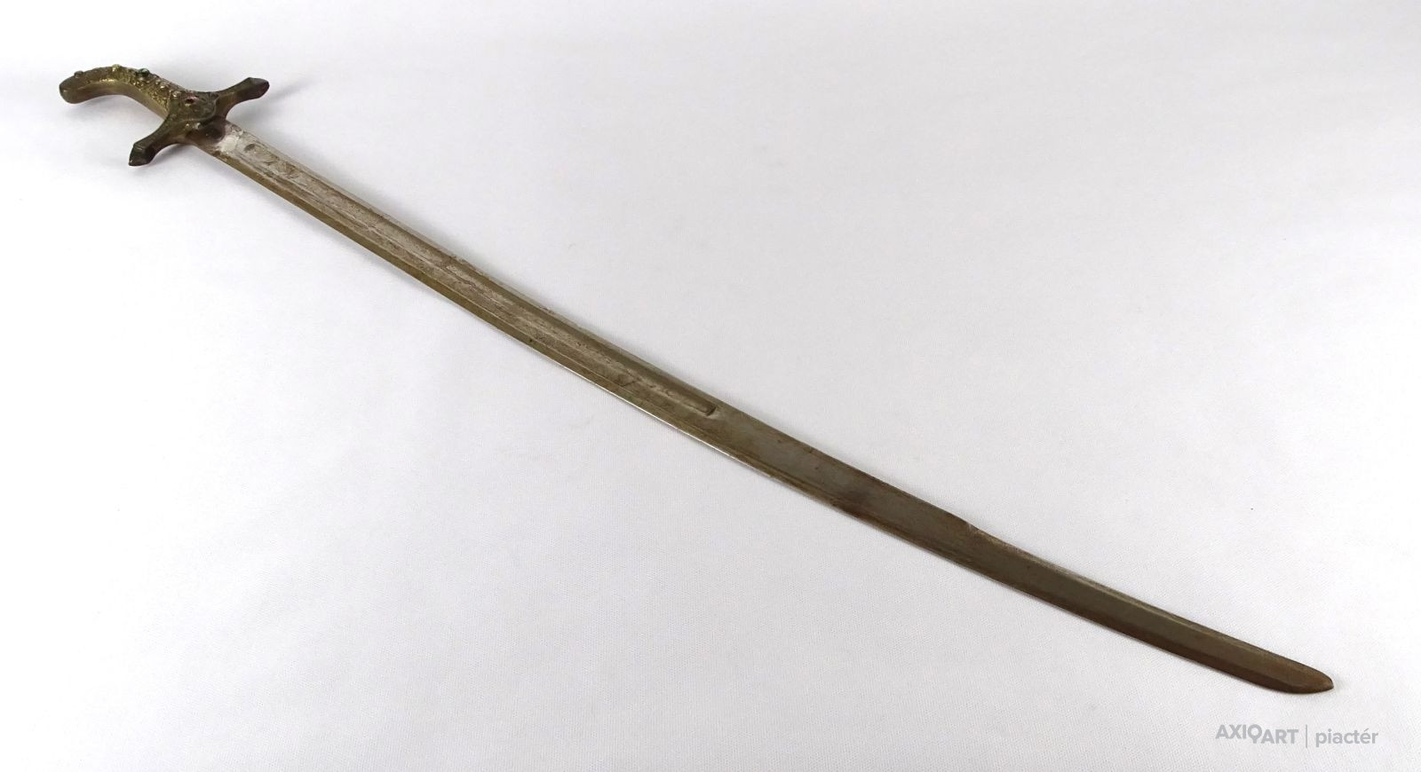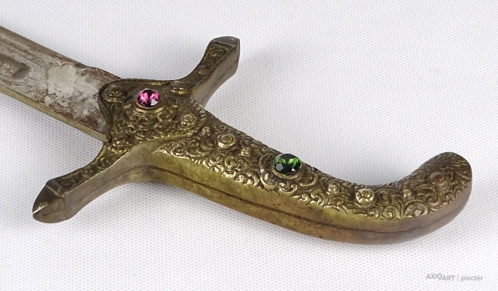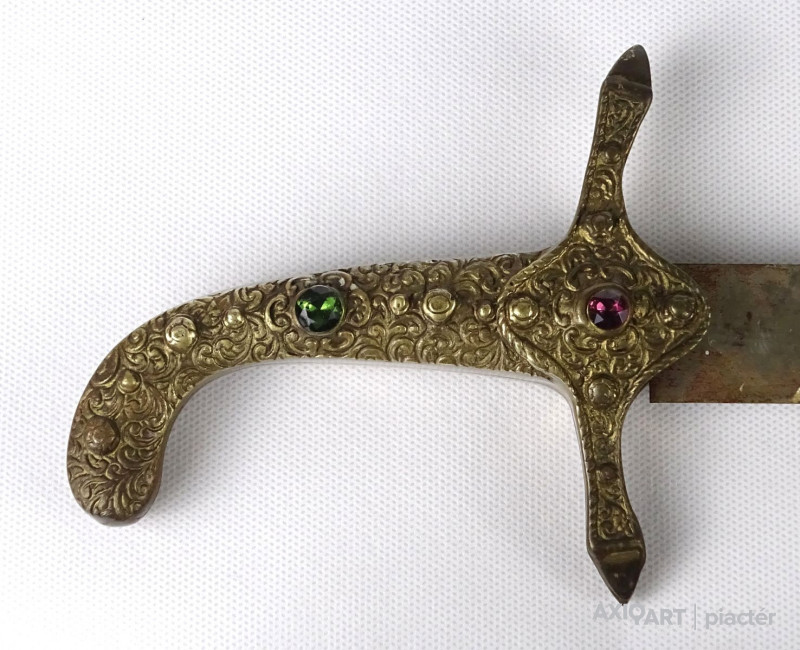 [1Q288/UZ-K] Antik hatású nagy méretű díszkard, replika, acél pengével. Színes kövekkel díszített réz markolattal rendelkezik. Hosszúság: 97 cm Súly: 0.99 kg   A kard teljes hossza 85 cm, a penge 65 cm, a teljes hossza tokkal együtt 88,5 cm. A penge 65 cm, a teljes hossza tokkal együtt 88,5 cm.