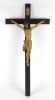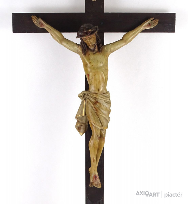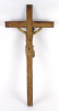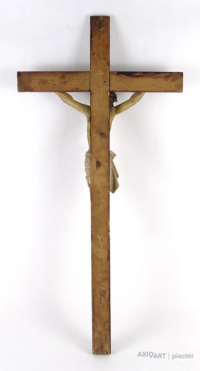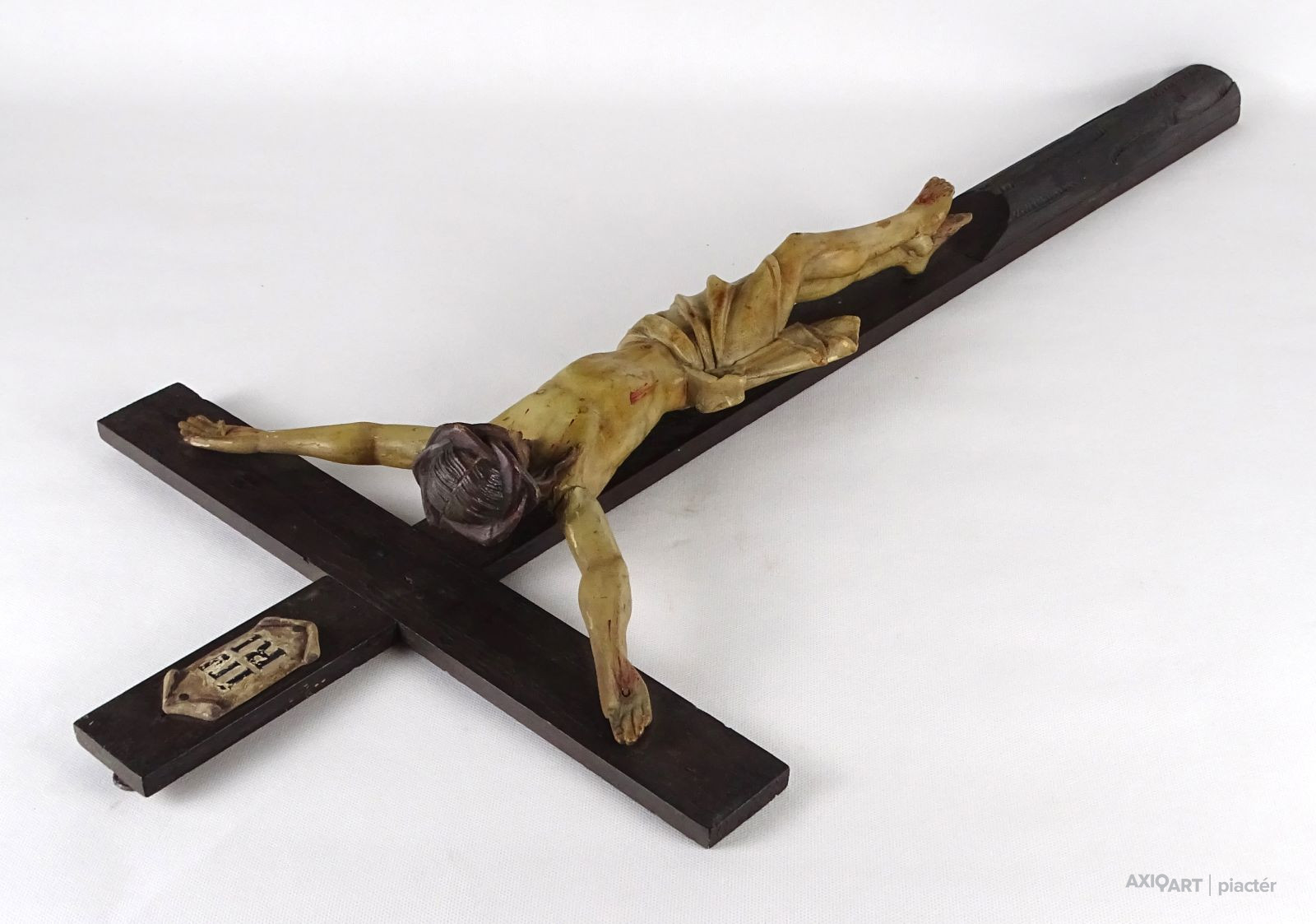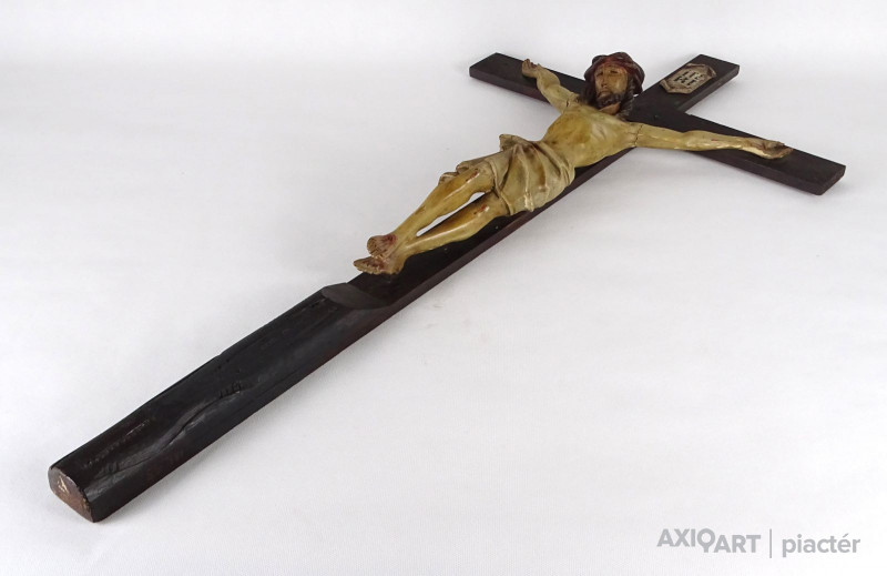 [1Q182/Z021] Antik nagy méretű faragott fa feszület, vallási kegytárgy, falra akasztási lehetőséggel. Rajta gyönyörűen faragott Jézus ábrázolás, Jézus szobor. A feszületen tábla, rajta felirat: INRI Magasság: 85 cm Szélesség: 40.5 cm Súly: 0.62 kg