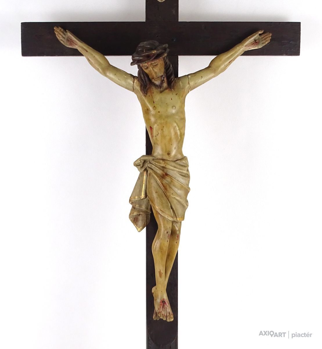 Antik nagy méretű faragott fa feszület, vallási kegytárgy, falra akasztási lehetőséggel.