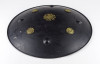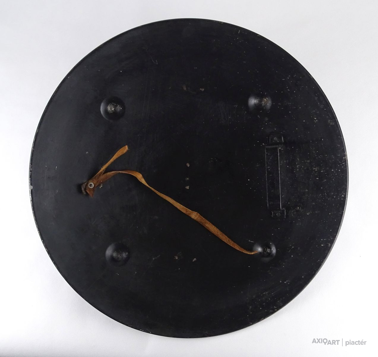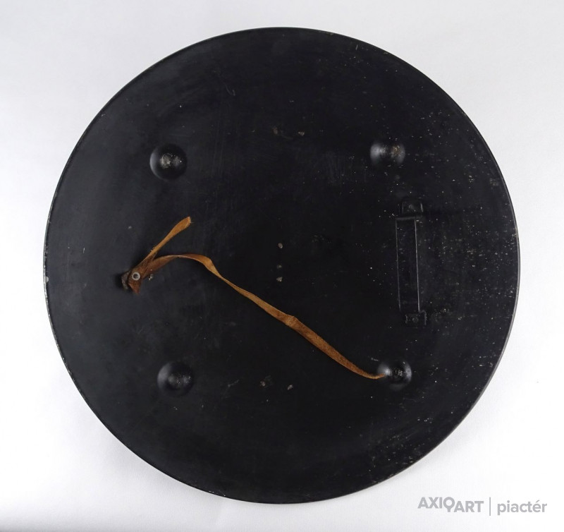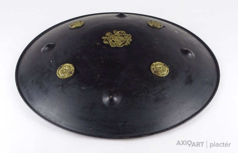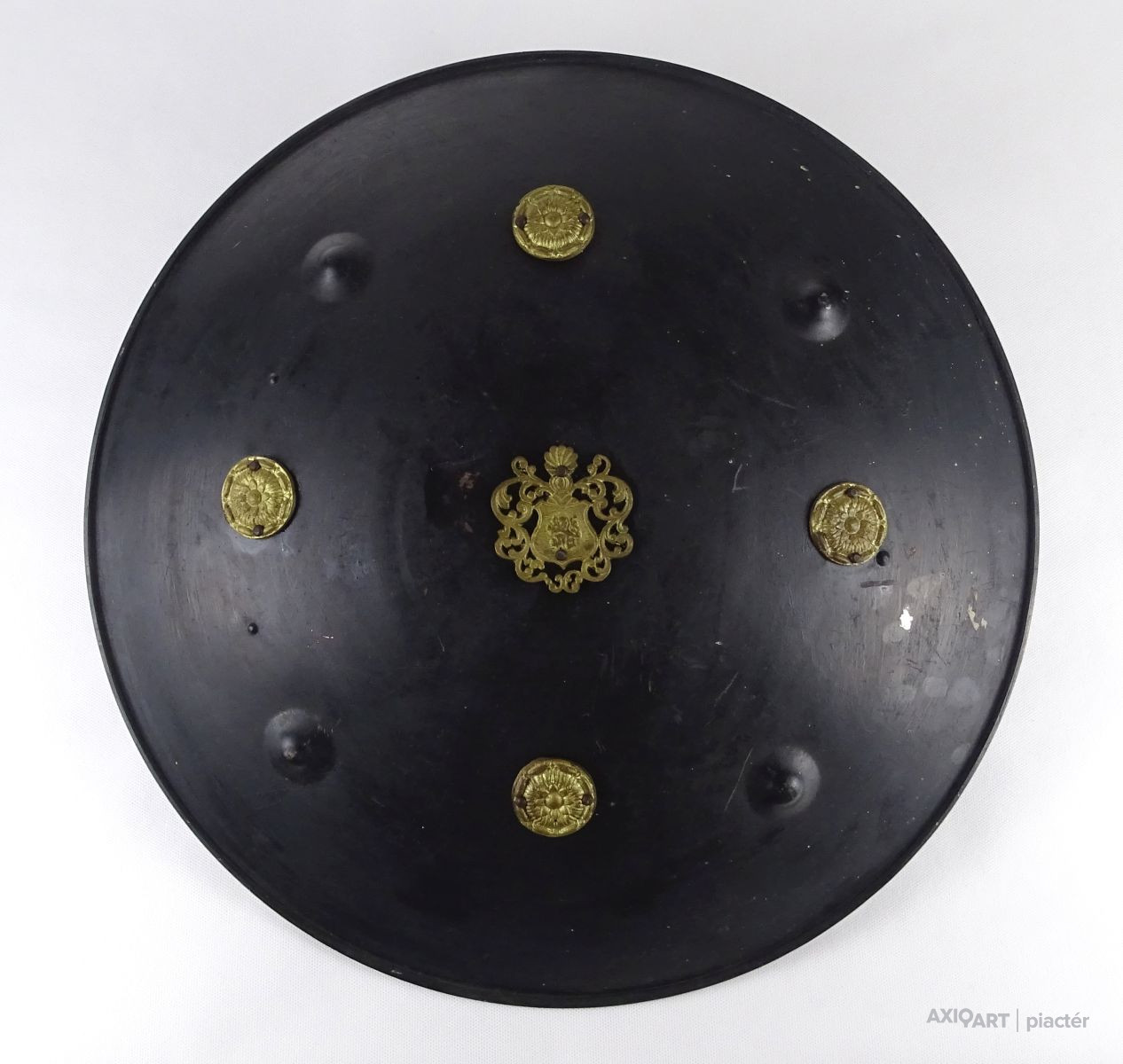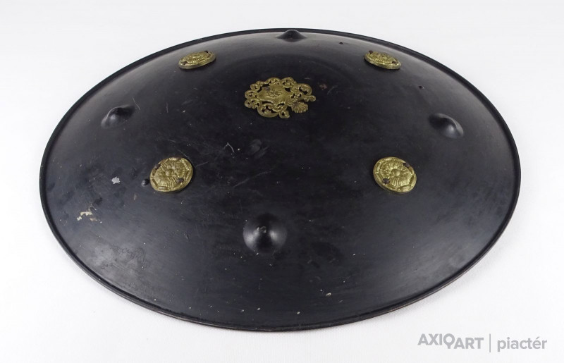 Nagyméretű fekete fém historizáló pajzs vért réz veretekkel 47.5 cm
