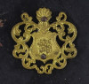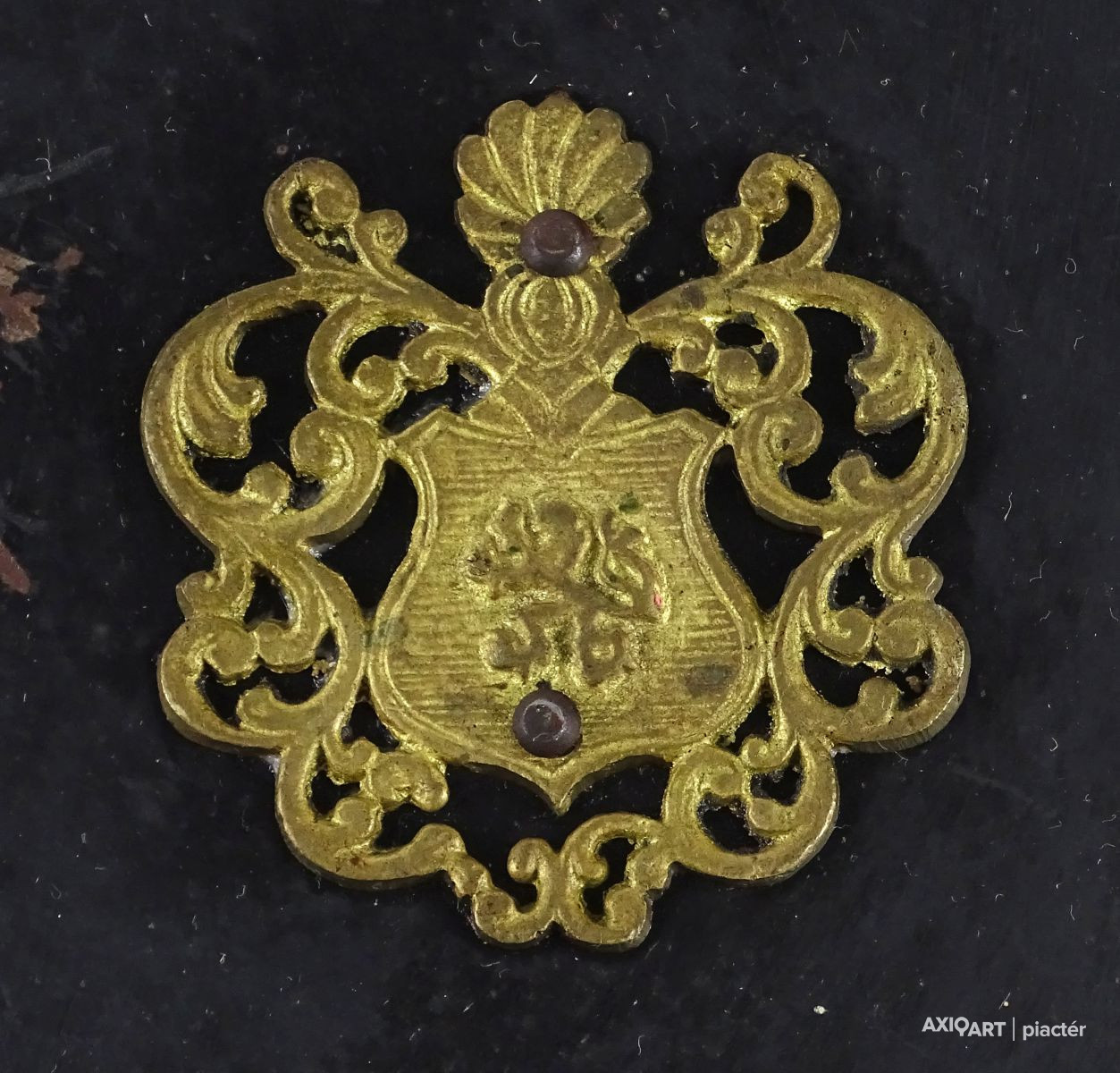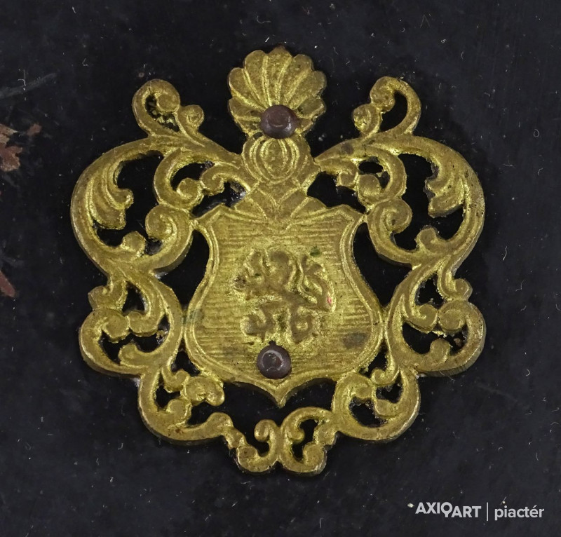 Szép állapotú, akasztási lehetőséggel rendelkező feketére festett fém pajzs. Felületén réz veretek, közepén oroszlános címer látható.