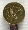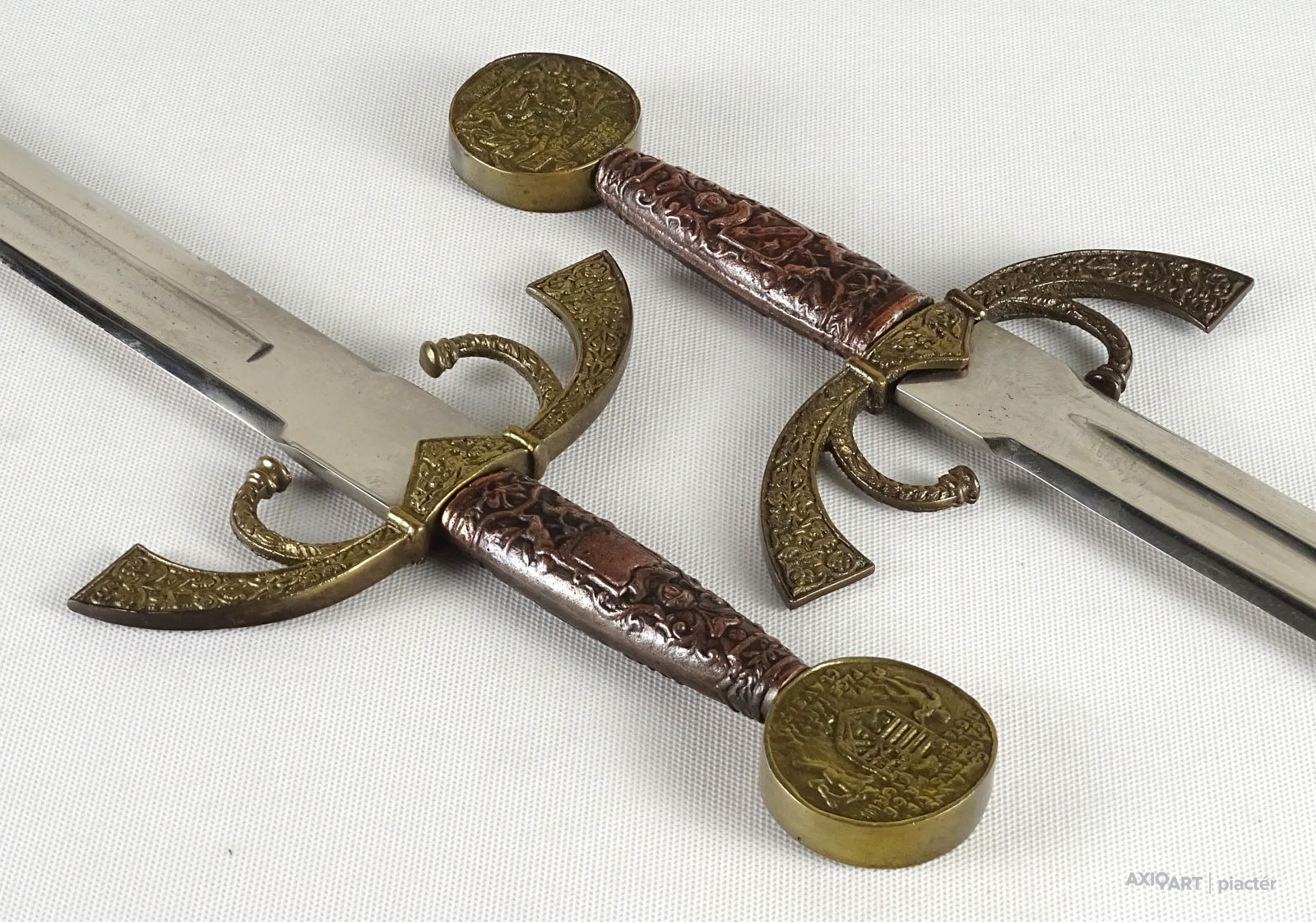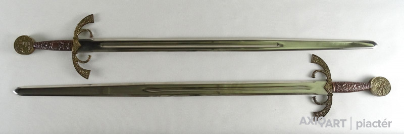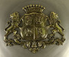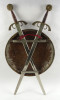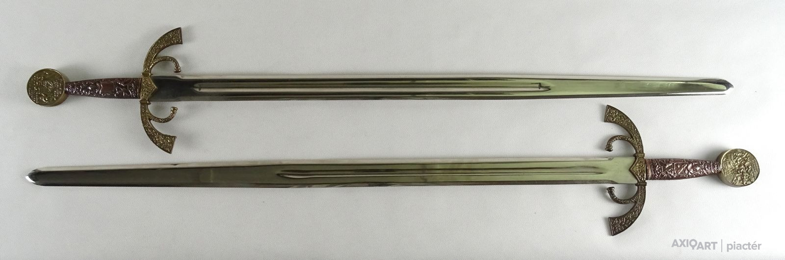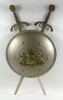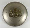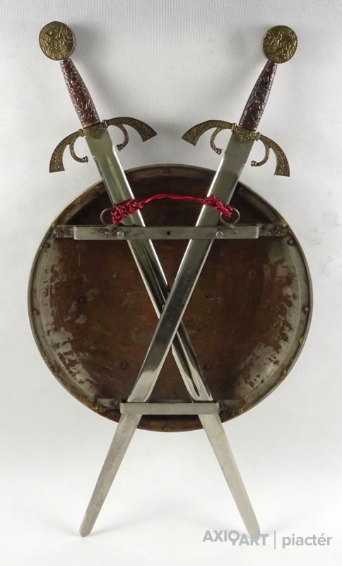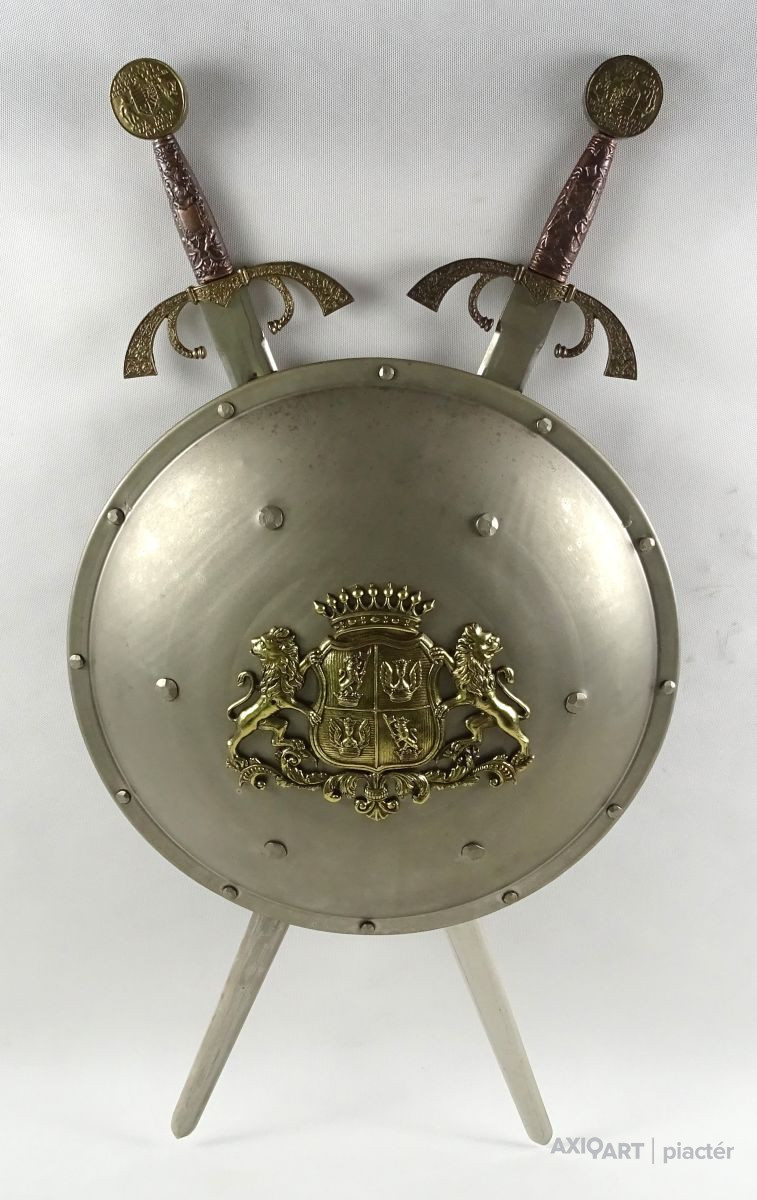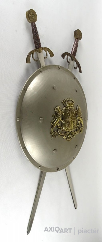 [1Q282/UZ-K] Szép állapotú, akasztási lehetőséggel rendelkező fém pajzs két karddal falidísz. A pajzson nagy méretű oroszlános címerpajzs látható korona alatt. A pajzshoz kettő darab nagy méretű kard, pallos tartozik. Súly: 5.875 kg
