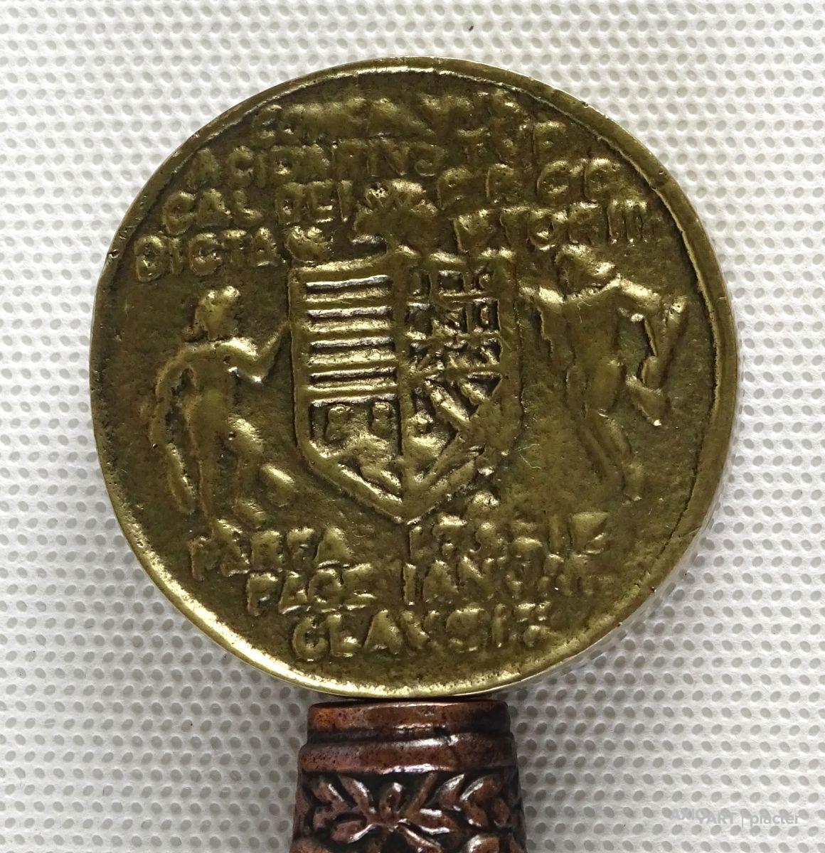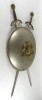 Nagyméretű fém historizáló pajzs réz veretekkel kard párral