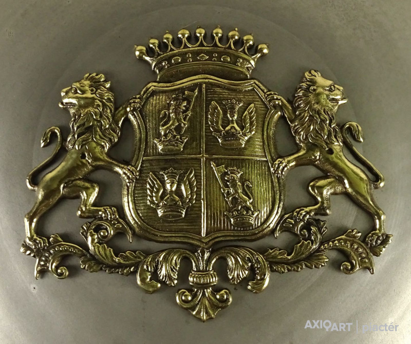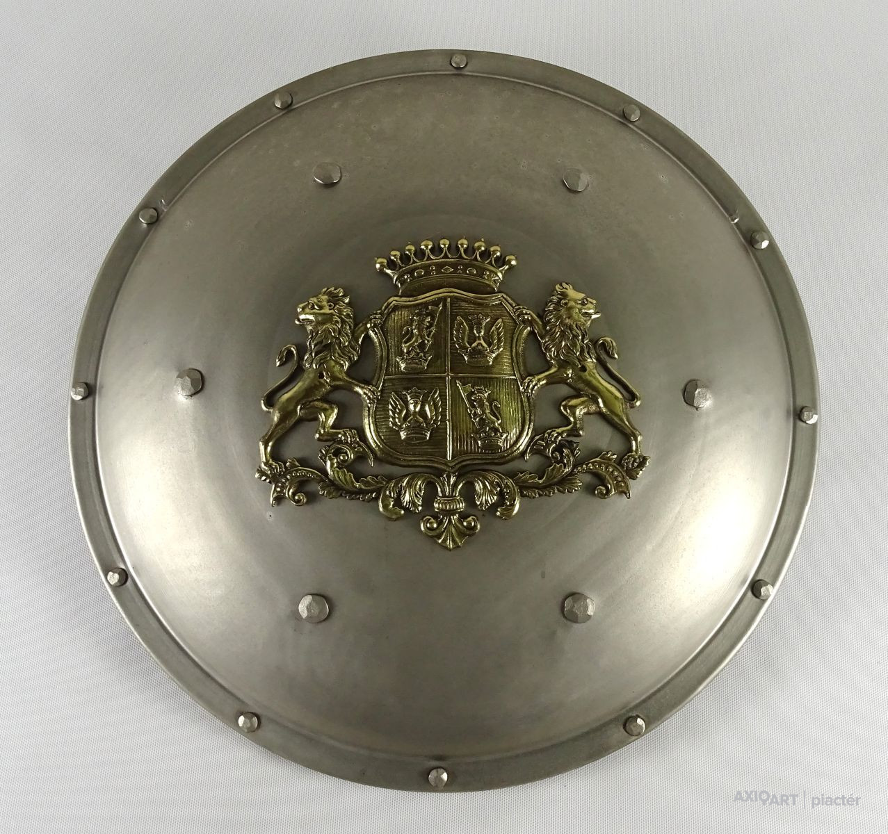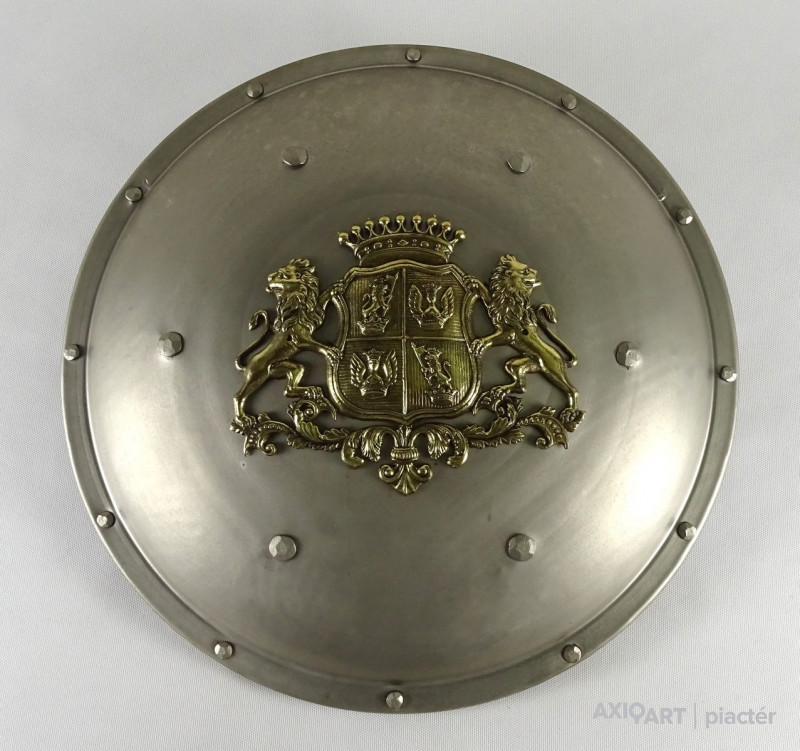 Szép állapotú, akasztási lehetőséggel rendelkező fém pajzs két karddal falidísz. A pajzson nagy méretű oroszlános címerpajzs látható korona alatt. A pajzshoz kettő darab nagy méretű kard, pallos tartozik.