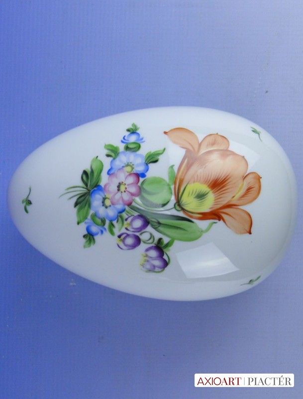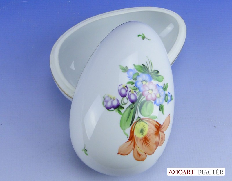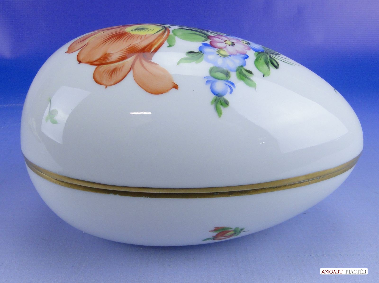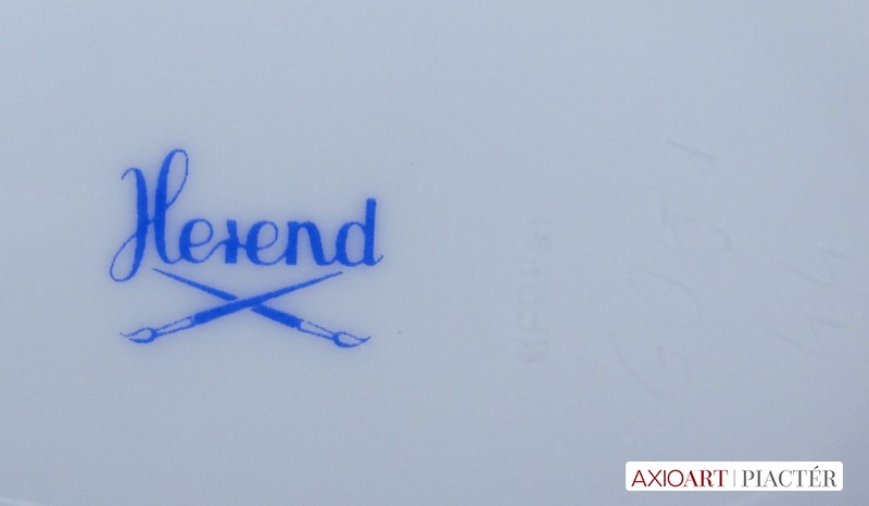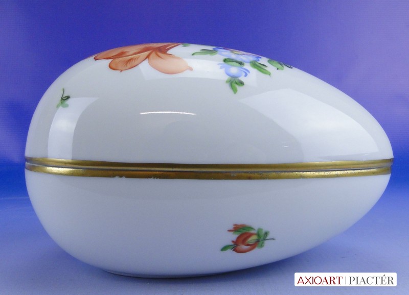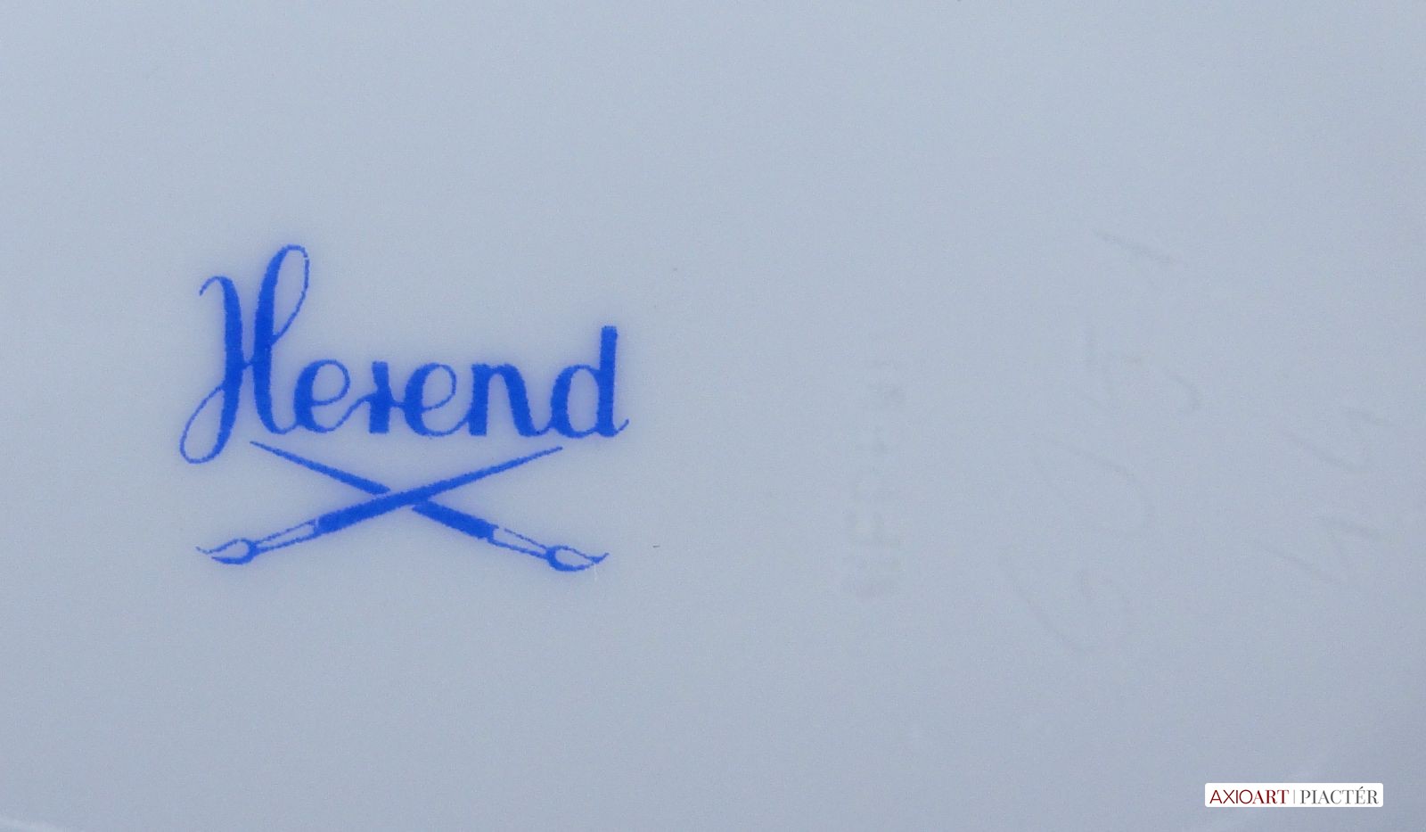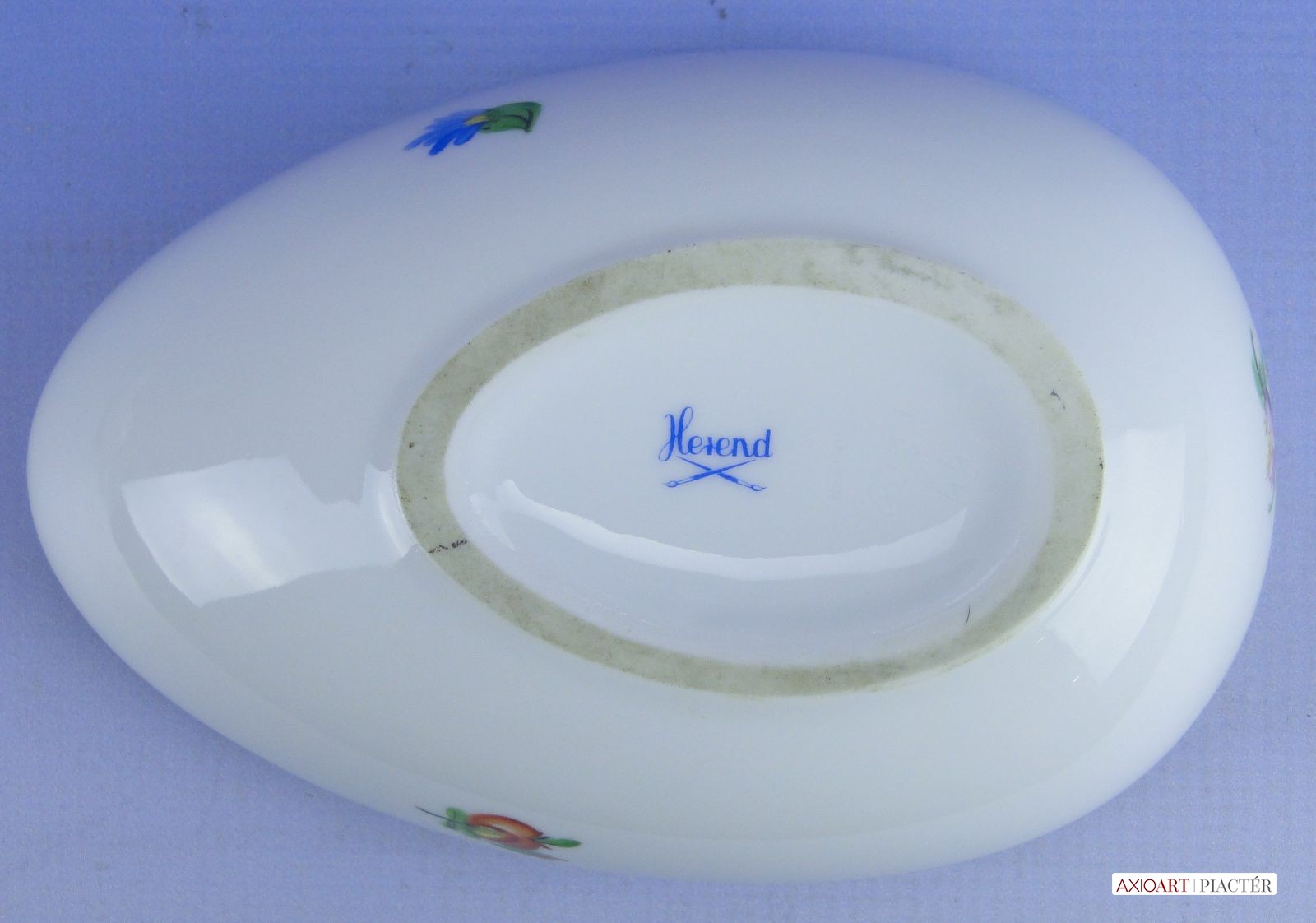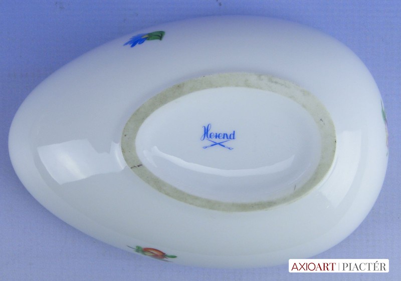 [0E052/VTR-12] Hibátlan állapotú, extra nagyméretű Herendi porcelán gyűrűtartó, ékszertartó, bonbonier. Alján kék herendi ecsetes jelzés: HEREND Mellette mélynyomással: HEREND. Formaszám: 6051 Magasság: 10 cm Szélesség: 11 cm Hosszúság: 17 cm Súly: 0.5 kg