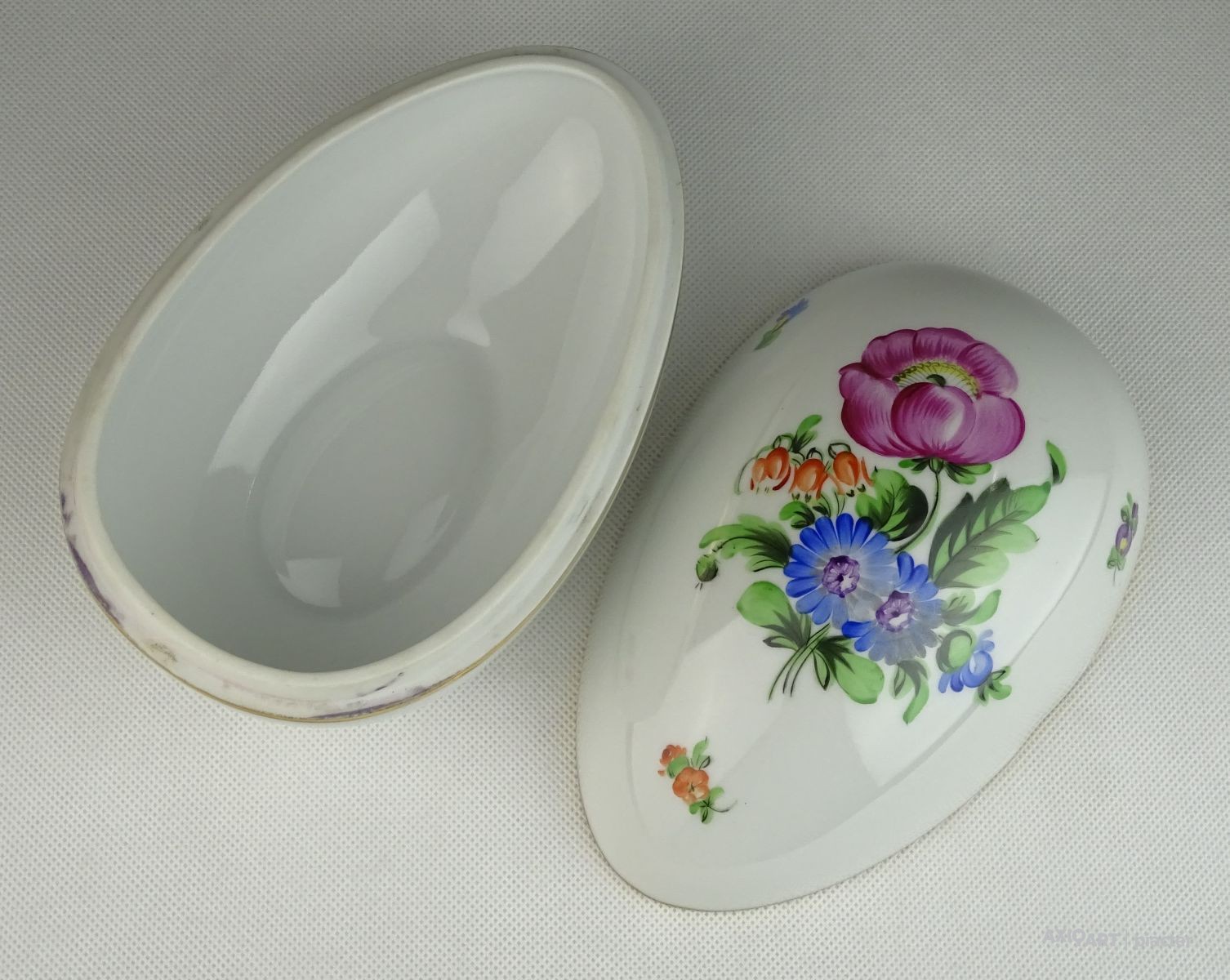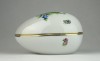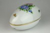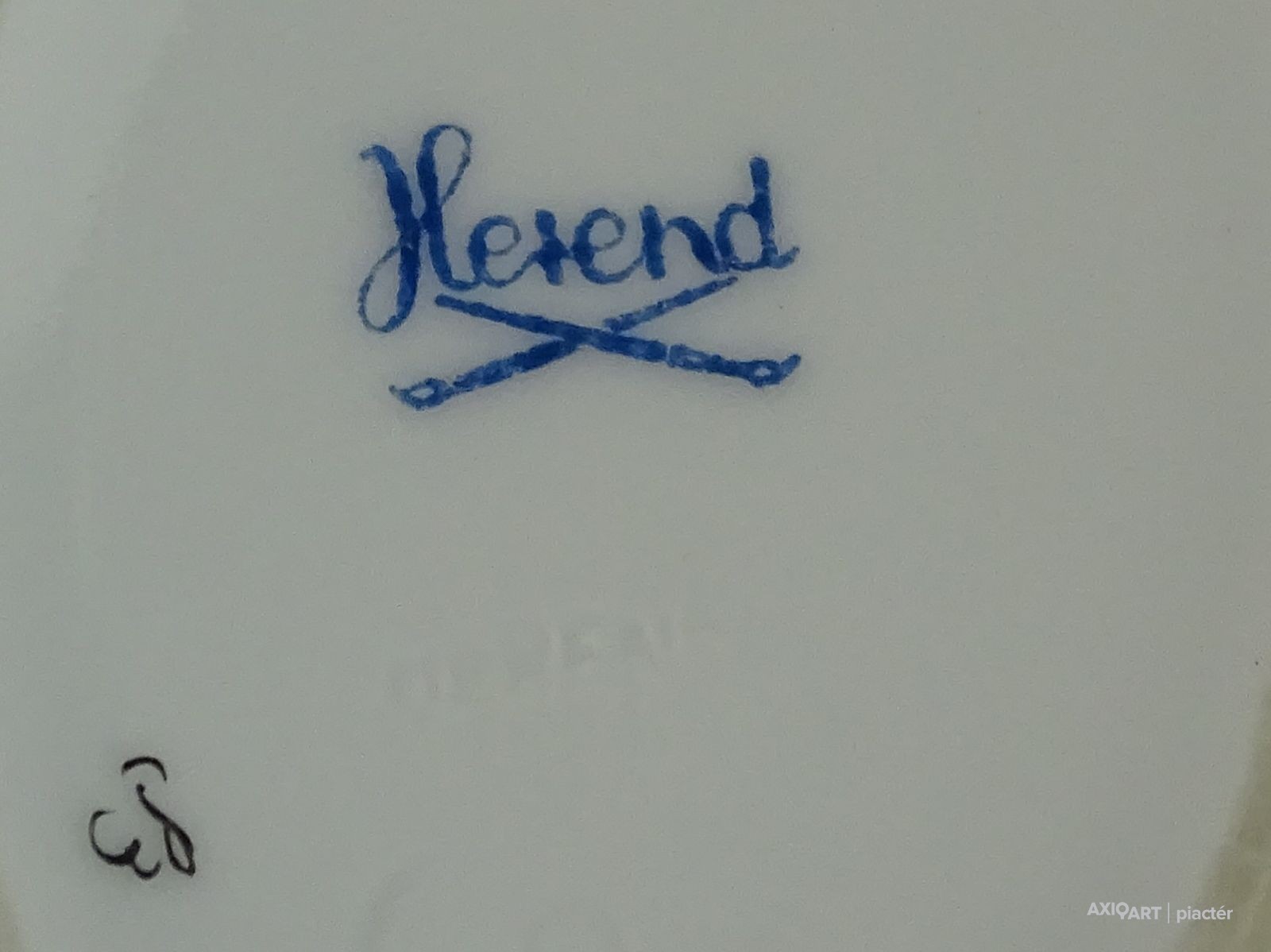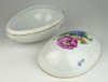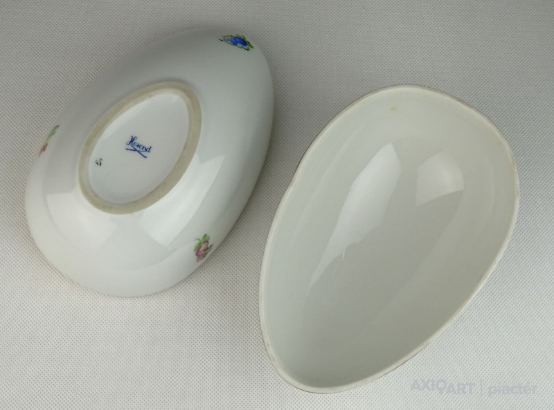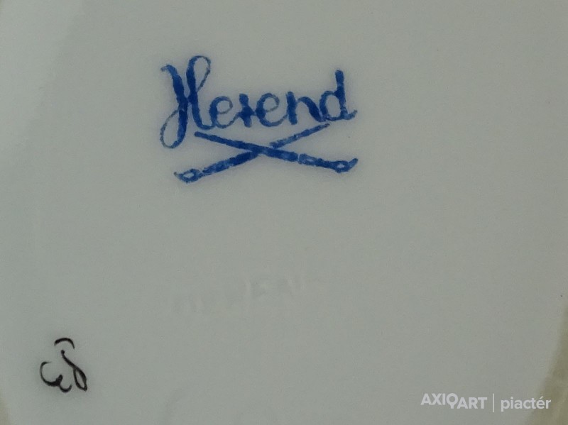 [0U589/VTR-12] Hibátlan állapotú, jelzett, extra nagyméretű, kézzel festett, virágmintás, aranyozott szegélyű Herendi porcelán gyűrűtartó, ékszertartó, bonbonier. Alján kék Herendi ecsetes jelzés: HEREND Mellette mélynyomással: HEREND Formaszám: 6051 11 Magasság: 10.5 cm Szélesség: 11 cm Hosszúság: 16.8 cm Súly: 0.46 kg