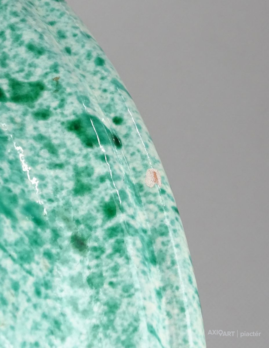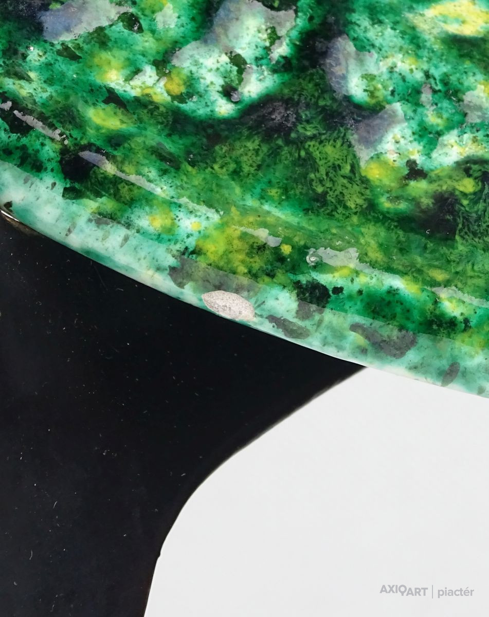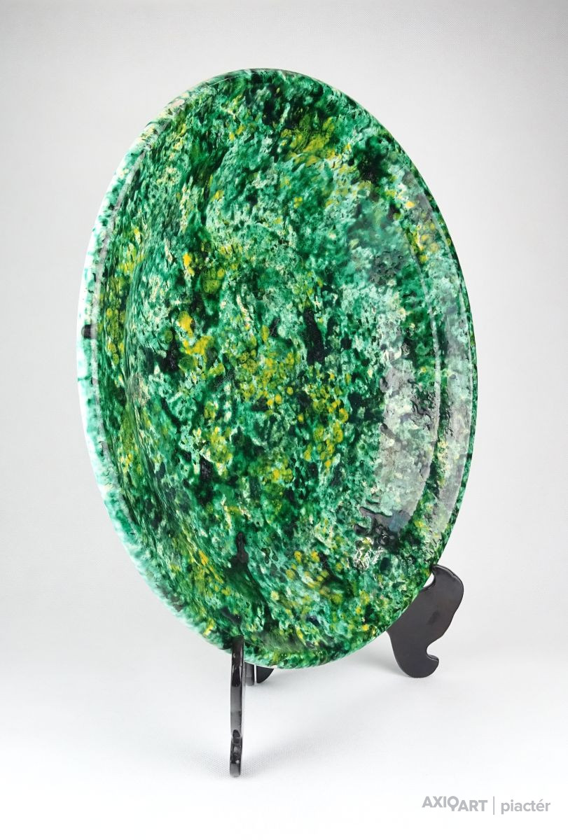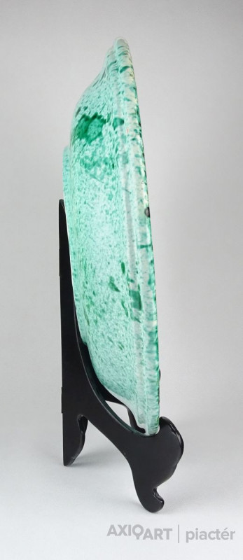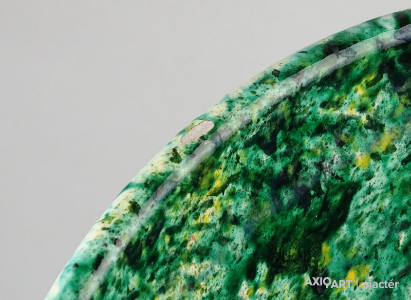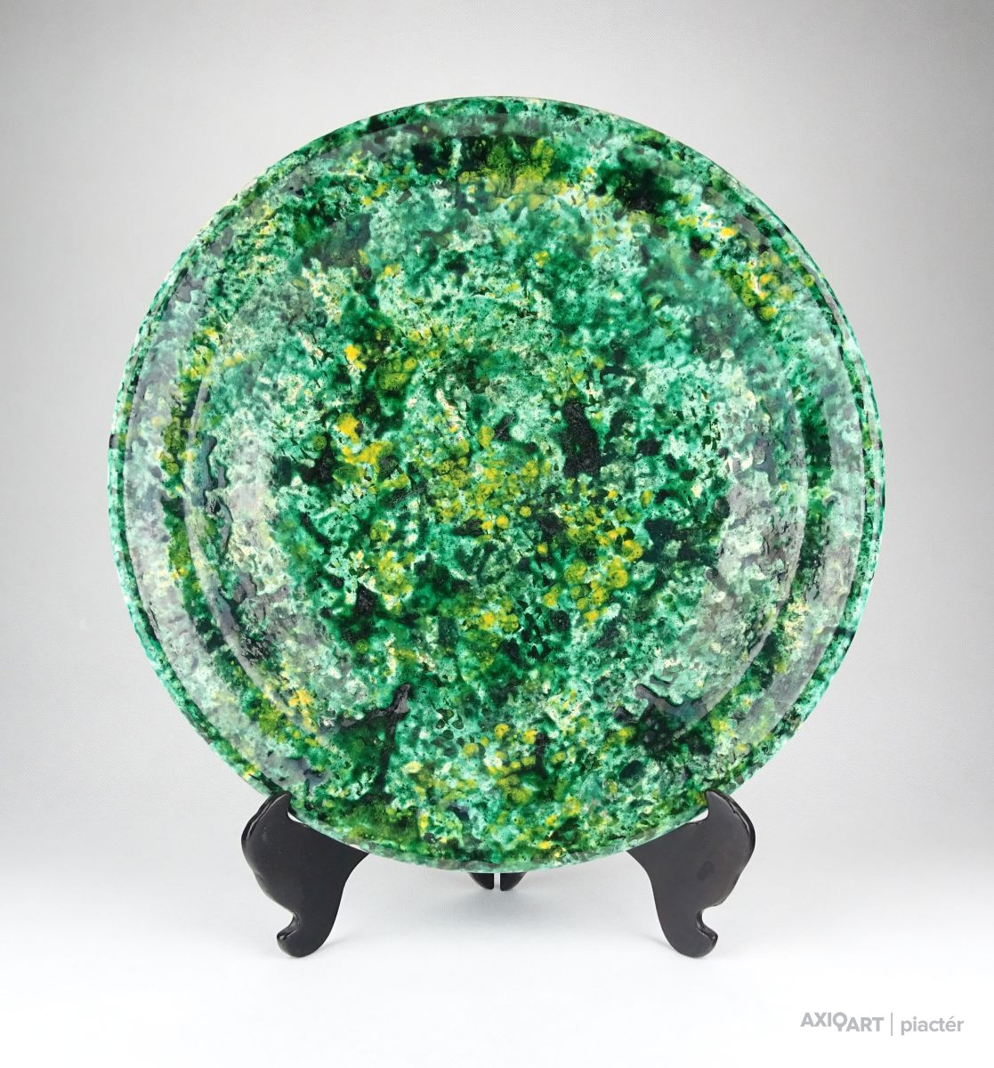 Jelzett nagyméretű, csorgatott mázas kerámia tál, dísztál. Falra akasztási lehetőséggel rendelkezik.