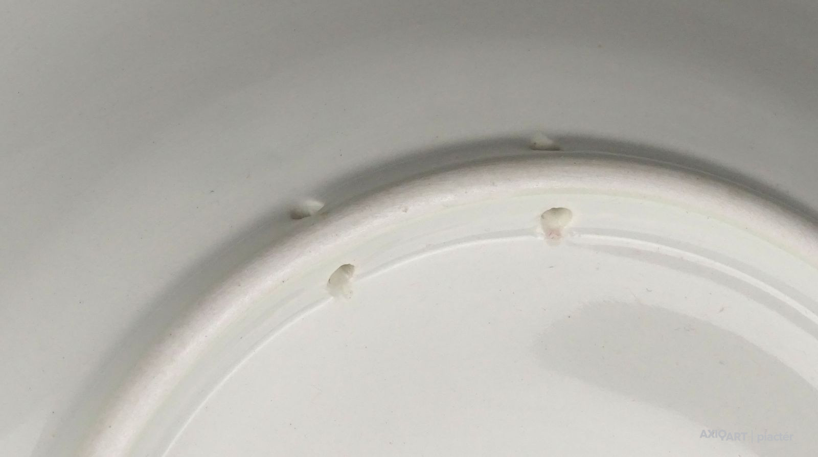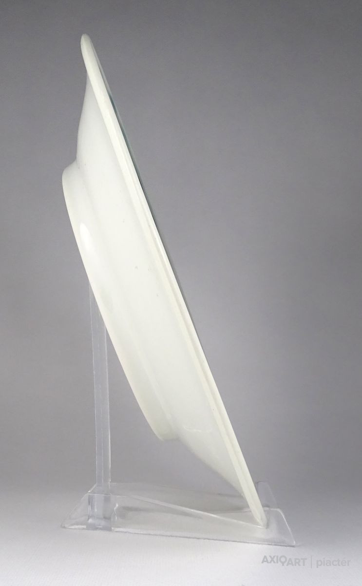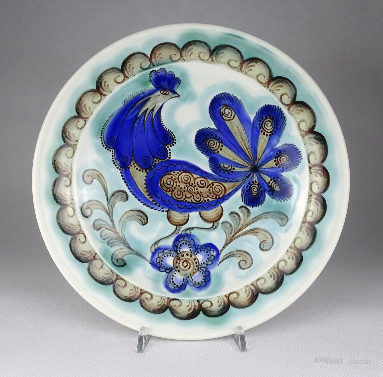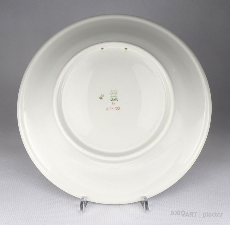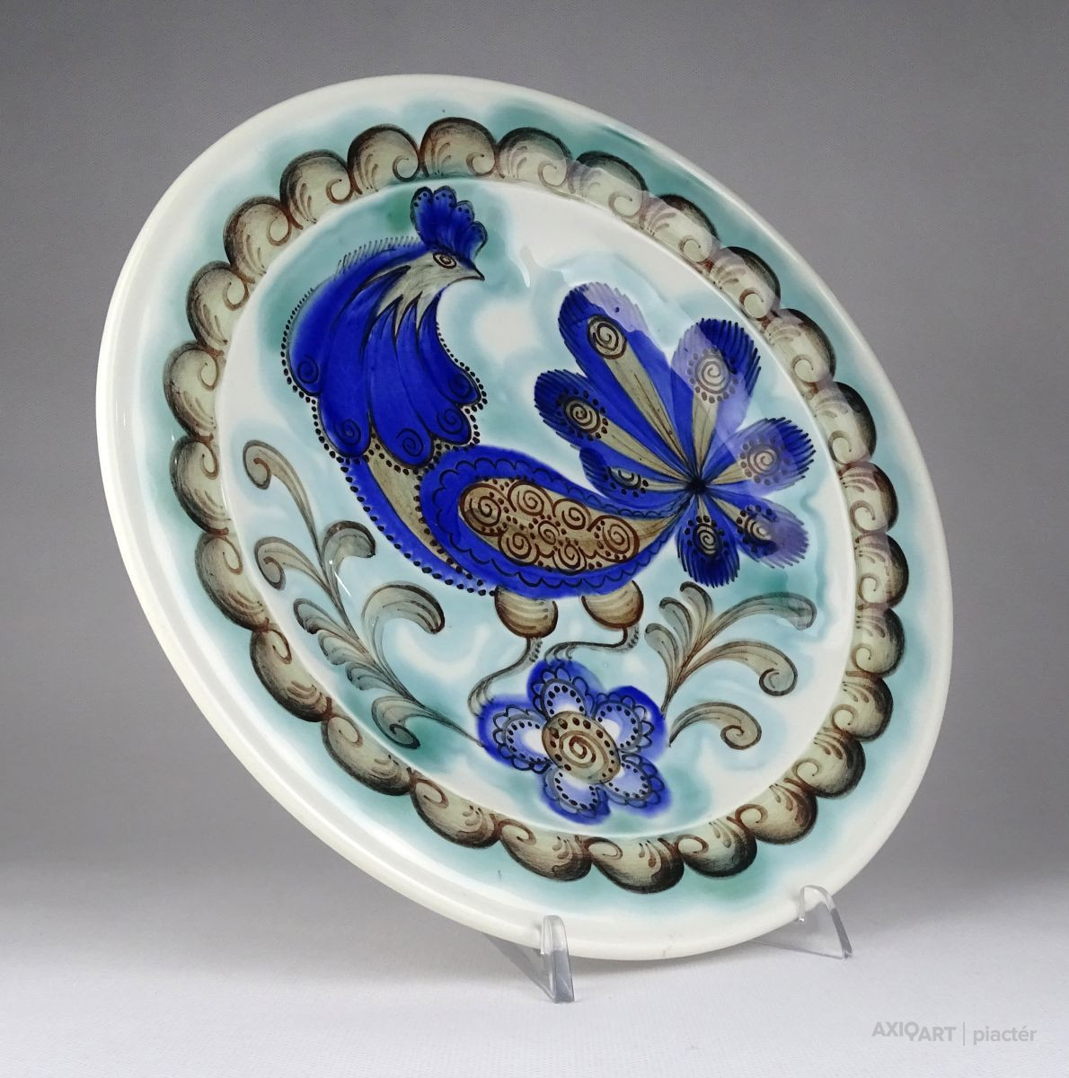 [1R204/X298] Hibátlan állapotú, nagy méretű, kézi festéssel díszített porcelán tál, dísztál, fali dísz tányér. Nagy méretű kakasos vagy páva díszes tál. Akasztási lehetőséggel rendelkezik. Hátoldalán jelzés, lásd fotó. Szélesség: 28.5 cm Súly: 0.64 kg
