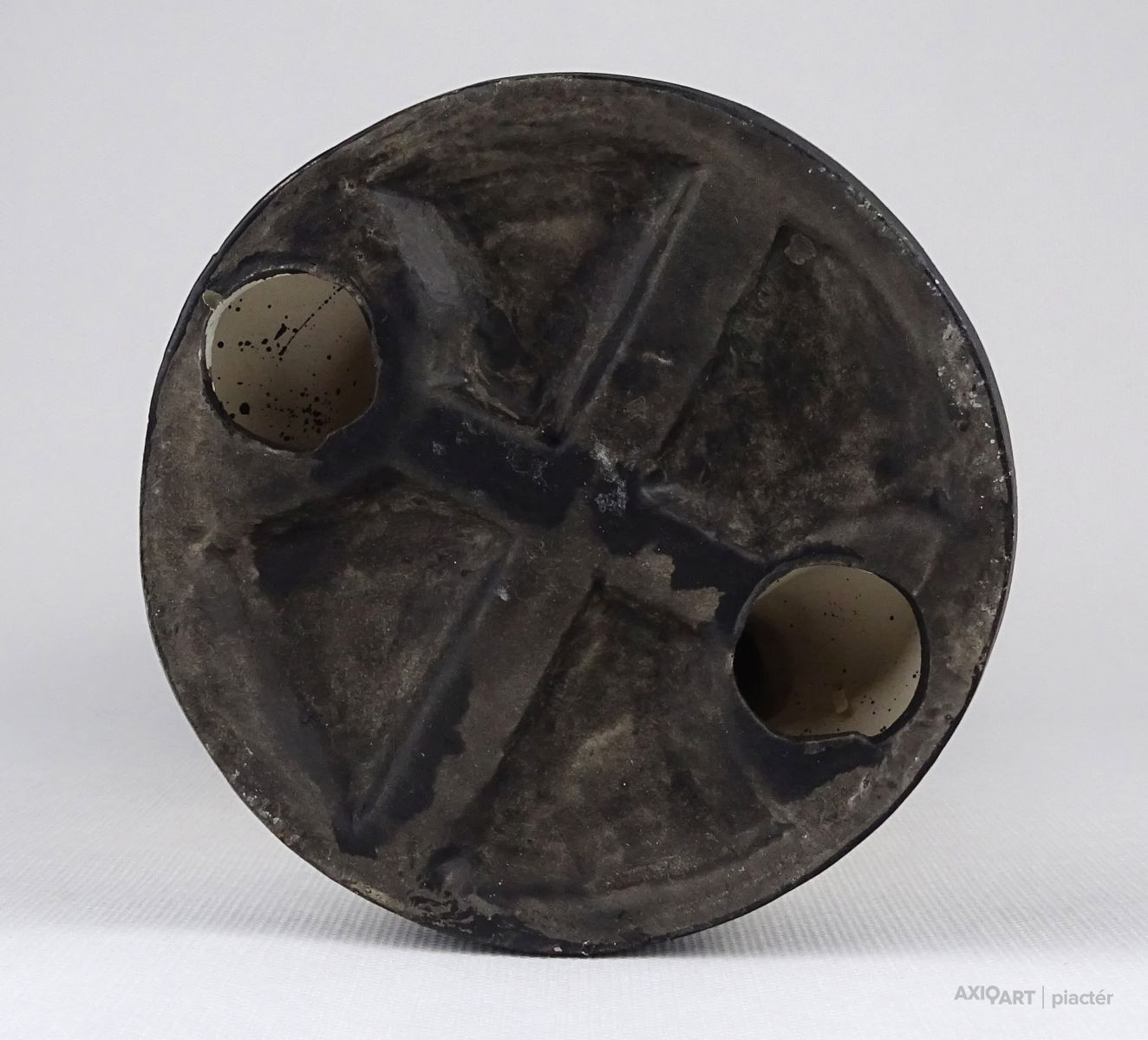 [1D015/X121] 25% ÁRENGEDMÉNY MINDEN TERMÉKÜNKRE Dec. 14-ig Hibátlan állapotú, jelzett, kerámia figura. Csuhás kerámia figura kezében gyertyának hely. Hátoldalán karcolt jelzés: SÖVEGJÁRTÓ Magasság: 22 cm Súly: 0.54 kg Sövegjártó Mária keramikus Budapest, 1942-07-30 Névváltozat: Husztik Lászlóné 1967: Magyar Iparművészeti Főiskola, mestere: Csekovszky Árpád. 1997-ben a kecskeméti Nemzetközi Kerámia Stúdió Századvég-szimpozionán dolgozott. Kezdetben hagyományos fazekas agyagból, színes mázakkal kerámia figurákat, használati tárgyakat, fali- és térplasztikákat készített korongozással és mintázással, préseléssel. Később magas tűzön égő félporcelán anyagot munkált meg, amelyet egyéni technikával, oxidokkal színezett. Fali- és térplasztikáin utazási élményei jelennek meg. Irodalom TANDI L.: ~, Tükör, 1977. augusztus 21. LOSONCI M.: ~, Új Tükör, 1980. szeptember 28. Egyéni kiállítások Egyéni kiállítások 1978 • Csepel Galéria, Budapest 1980 • Művelődési Központ, Szentendre 1983 • Művelődési Ház, Kiskunhalas • Kemenesaljai Művelődési Ház [Varga Máriával, Kopcsányi Ottóval], Celldömölk 1987 • Oberpullendorf 1993 • Magyar Apátság Kiállítóterem, Köln. Válogatott csoportos kiállítások Válogatott csoportos kiállítások 1968 • Iparterv I., IPARTERV, Budapest 1968, 1978, 1980 • I., V., VI. Országos Kerámia Biennálé, Pécs 1969, 1971, 1980 • Nemzetközi Kerámia Verseny, Faenza 1980 • Nemzetközi Kerámia Biennálé, Vallauris 1985 • Idea-kiállítás, Vigadó Galéria, Budapest 1996 • A szabadban, Petőfi Művelődési Központ, Gödöllő • Őszi Kerámia kiállítás, Csók Galéria, Budapest 1997, 1998 • Őszi Kerámia kiállítás, Palme Ház, Budapest 1998 • Szolgáló tárgyaink, Iparművészeti Múzeum, Budapest. Művek közgyűjteményekben Művek közgyűjteményekben   Forrás: artportal.hu
