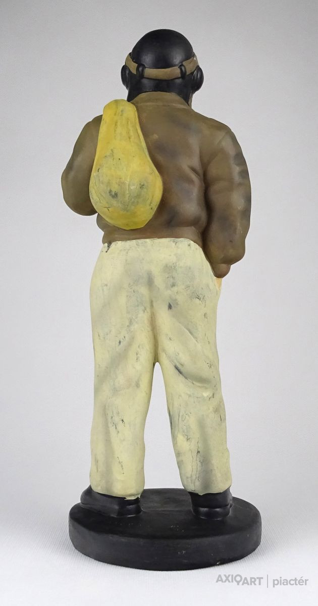 [1T107/Z029] 25% ÁRENGEDMÉNY MINDEN TERMÉKÜNKRE Dec. 14-ig Régi, szép állapotú kézzel festett három darab orientalista terrakotta kisplasztika, mellszobor. - 1 darab sárga ruhás, turbános szerecsen férfi büszt (20 x 12 x 23 cm) Vállán jelzés: IFJ. VASTAGH GY. - 1 darab kék ruhás, turbános szerecsen férfi büszt (17.5 x 15 x 23.5 cm) Vállán repedés, lásd fotó. - 1 darab barna ruhás szerecsen férfi büszt (19 x 15 x 23.5 cm) Vállán pecsételt és kopottas jelzés: IFJ. VASTAGH GY. ALGIR 1898 Súly: 3.945 kg Vastagh György (szobrász) Vastagh György Született 1868. szeptember 18. Kolozsvár Elhunyt 1946. június 3. (77 évesen) Budapest Állampolgársága magyar Nemzetisége magyar Házastársa Benczúr Olga Gyermekei Vastagh Éva Vastagh László Szülei Vastagh György Foglalkozása szobrász Sírhelye Fiumei Úti Sírkert (37/1-1-32) A Wikimédia Commons tartalmaz Vastagh György témájú médiaállományokat. Sablon • Wikidata • Segítség Ifjabb alsó-torjai Vastagh György (Kolozsvár, 1868. szeptember 18. – Budapest, 1946. június 3.) magyar szobrászművész. Az erdélyi Háromszékről származó Vastagh művészcsalád különböző műfajokban alkotó tagjai három generáción keresztül, százhúsz éven át voltak jelen a 19-20. század magyar képzőművészetében.  Családja Alsó-torjai székely lófő eredetű családból származott. Ősei 1661 körül a tatárdúlást követő pestis elől menekülve Szegeden telepedtek le, az ottani anyakönyvekben először 1667-ben fordul elő nevük. Nagyapja Vastagh János szegedi hajósgazda, apja id. Vastagh György festőművész, édesanyja Schell Jozefin, bátyja Vastagh Béla jogász és Vastagh Géza festőművész, sógora Kenyeres Balázs orvosprofesszor. Ifjabb Vastagh György 1900-ban kötött házasságot Benczúr Gyula lányával, Benczúr Olga képző- és iparművésszel. Három gyermekük született. Lánya, Vastagh Éva és fia, Vastagh László szobrászművészek voltak, kisebbik fia, Pál (közlekedési mérnök) a második világháborúban halt meg.  Tanulmányai Első mestere a nála mindössze egy évtizeddel idősebb Zala György volt. 1889 és 1891 között Münchenben a Képzőművészeti Akadémián tanult, előbb rajzot Gabriel Hacklnál, majd mintázást Syrius Eberlénél. 1893-ban tanulmányúton járt Párizsban, ahol Emmanuel Fremiet és Alexandre Falguere  szobrászokkal állt kapcsolatban. 1898-ban  négy hónapot töltött Algériában és Tunéziában, állami ösztöndíjjal ott tevékenykedő bátyjához, Gézához csatlakozva. Itt mintázta arab és néger portréit, továbbá egy teveszobrot.  Művészi pályafutása Tevehajcsár, 1893. Ifj. Vastagh György műtermének részlete az Árpád szoborral Első nyilvánosan felállított munkája a Pápai honvédemlék (1889), az ihászi csatát idéző bronz reliefjével és oszlop tetején szétterjesztett szárnyú turulszobrával. Részt vett a Kolozsvár város által kiírt Mátyás király szoborpályázaton, melyet Fadrusz János nyert meg. A Millenniumi kiállításra ötven tenyészállatszobor készítésével bízta meg a Földművelési Minisztérium. Ezeket az állami ménesbirtokokon – Bábolna, Kisbér, Mezőhegyes, Fogaras – mintázta. Az 1900-as párizsi világkiállításra a minisztériumtól újabb megrendelést kapott, a legkiválóbb nagy- és kistenyésztők állatainak megmintázását. Szobrait aranyéremmel jutalmazták. 1902-ben avatták fel a Budavári Palota területén, a lovarda előtt felállított másfélszeres életnagyságú Csikós szobrát, egyik főművét. Talapzatát a palota építésze Hauszmann Alajos tervezte. A II. világháborúban megsérült szobor restaurálás után 1983-ban került jelenlegi helyére, a Magyar Nemzeti Galéria B épülete előtti Hunyadi-udvarra. Fél életnagyságú változatát Párizsban a világkiállításon aranyéremmel díjazták. A londoni British Museum is vásárolt állatszobraiból, ezek egy része ma a Londoni Természettudományi Múzeum (Natural History Museum) gyűjteményében található. 1901-ben kapott megbízást Bethlen Gábor szobrának elkészítésére, melyet 1903-ban a Köröndön állítottak fel, ma a Hősök terén a millenniumi emlékmű egyik alakja. Ez időszakban az Állatorvosi Főiskolán lóanatómiai tanulmányokat készített grafikában és plasztikában, ezeket Zimmermann Ágoston szemléltető tananyagként alkalmazta. Ekkor készültek anatómiai tanulmányai Kincsemről, ott őrzött csontváza alapján. A nemzetközi vadászati kiállításon (1910, Bécs) kutyaszobraival aratott sikert. Részt vett a budapesti Bazilika szobrászati díszítésében (1905), a budapesti Széchenyi gyógyfürdő kupolacsarnokának egyik tritónja (1909–1913) is az ő nevéhez fűződik. II. Rákóczi Ferenc lovas szobrát Szegeden, a Széchenyi téren állították fel 1912-ben. Árpád fejedelem lovas szobrának felállítása Munkácson az I. világháború miatt meghiúsult, kisplasztikai változata a Magyar Mezőgazdasági Múzeumban látható. A múzeum felkérésére mintázta a Négyesfogat szoborcsoportot Dőry Vilmosné leperdi birtokán 1912-ben, a Négyökrös szántást Mezőhegyesen 1913-ban, továbbá szintén a Dőry-birtokon, a Mezőgazdasági kiállításon díjnyertes Cepedli tehén szobrát 1925-ben. Ez évben készült Pázmány Péter emlékszobra a nevét viselő tudományegyetem számára (központi épület), ma Piliscsabán a katolikus egyetemen található. Lourdes-i Mária szoborpályázaton nyertes alkotása (1925) a Gellért-hegyi Sziklatemplomban állt (eltűnt). A létrehozandó kairói Mezőgazdasági Múzeum számára 1931-32-ben közel 50 egyiptomi juh-, szarvasmarha- és lószobrot mintázott fiával, Lászlóval együtt. Görgey Artúr 