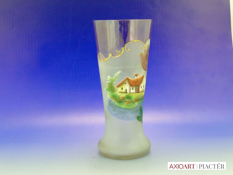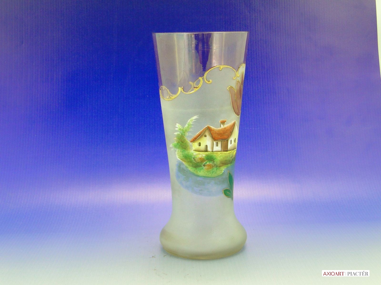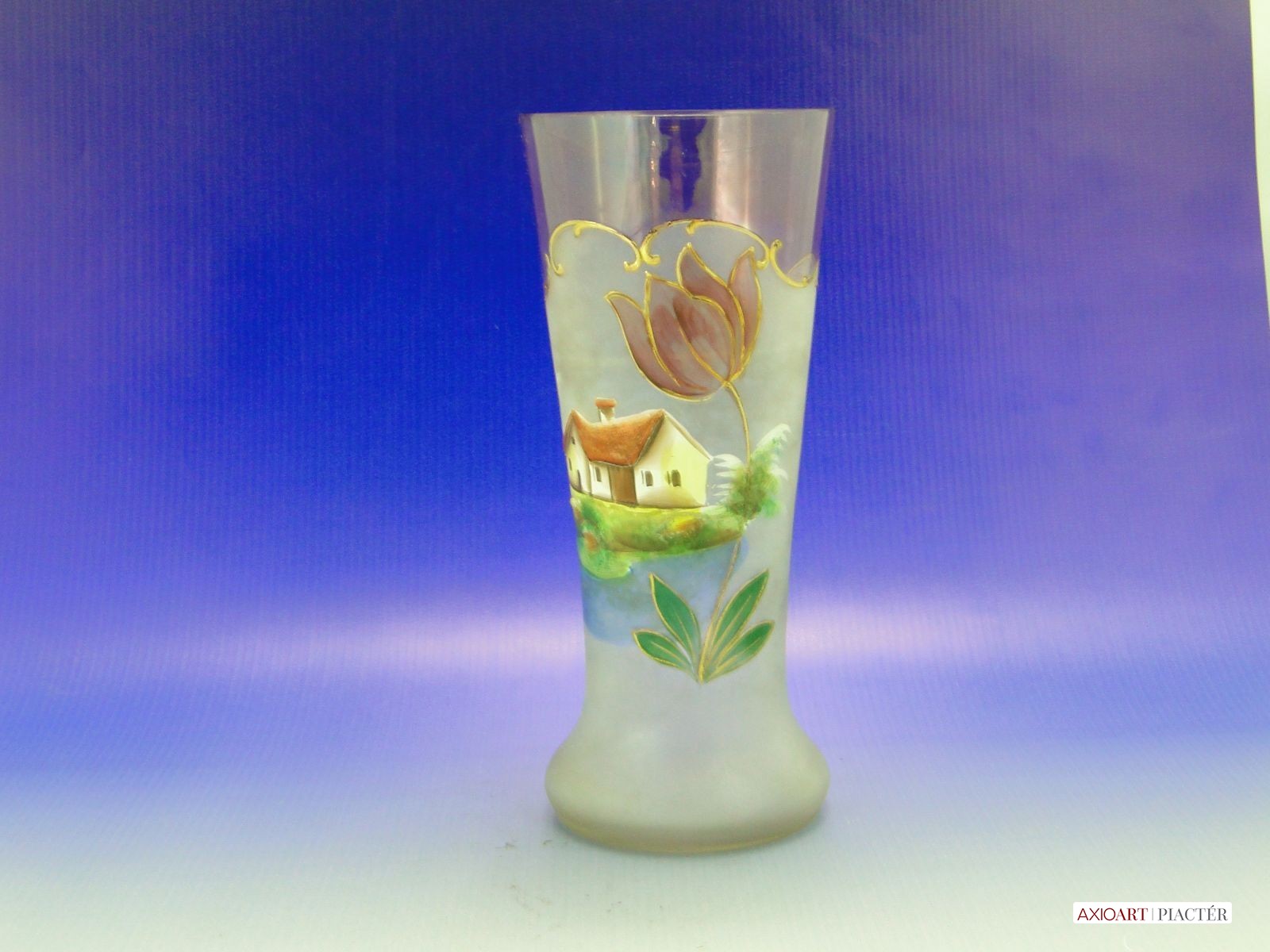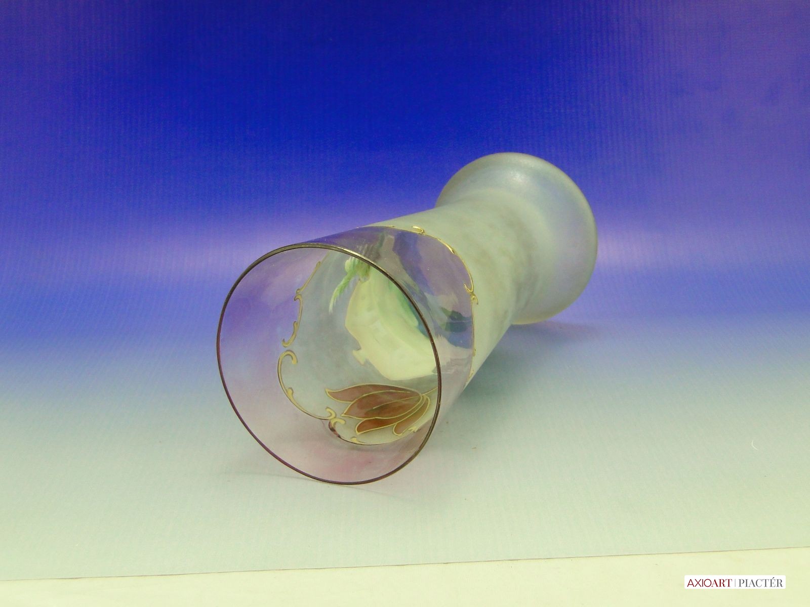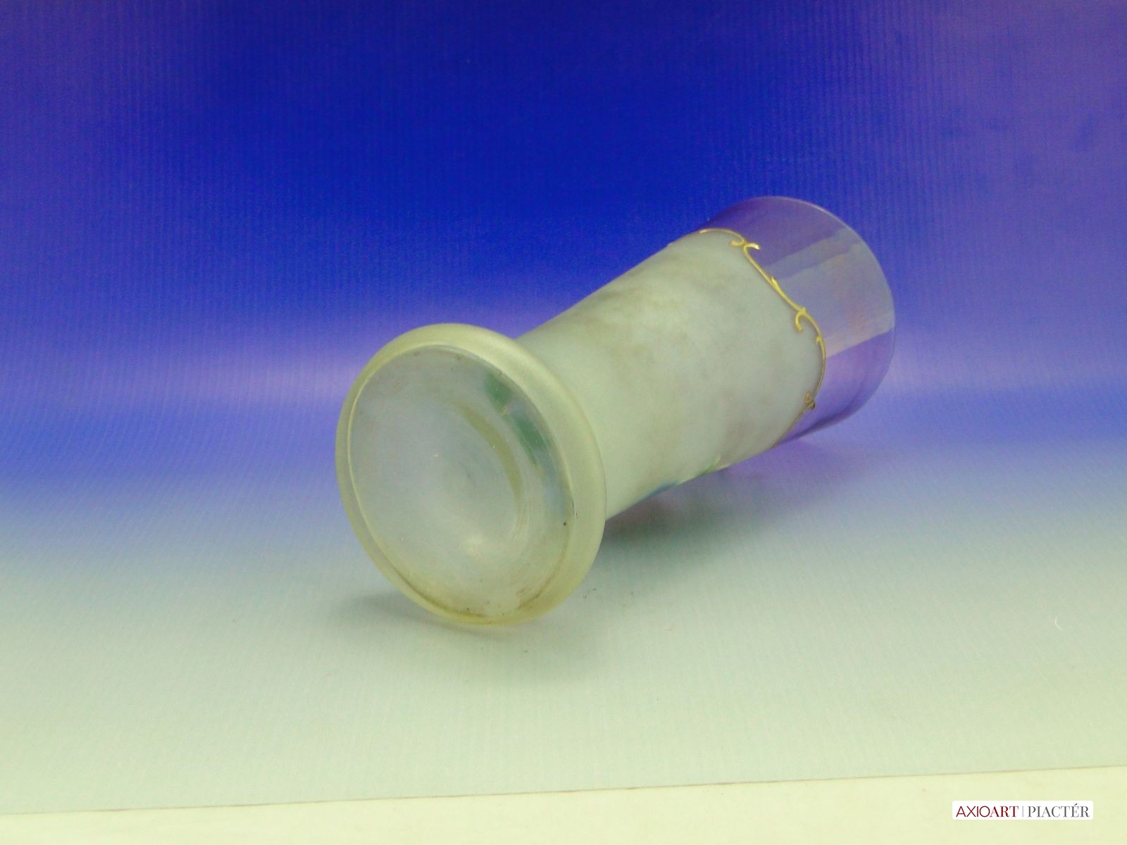 [0A777/VTR-14] Gyönyörű halványlila színű, hibátlan állapotú kézi festéssel gazdagon díszített vékony falú fújt üveg pohár az 1900-as évek elejéről. Magasság: 17.5 cm Szélesség: 7.5 cm Súly: 0.111 kg
