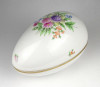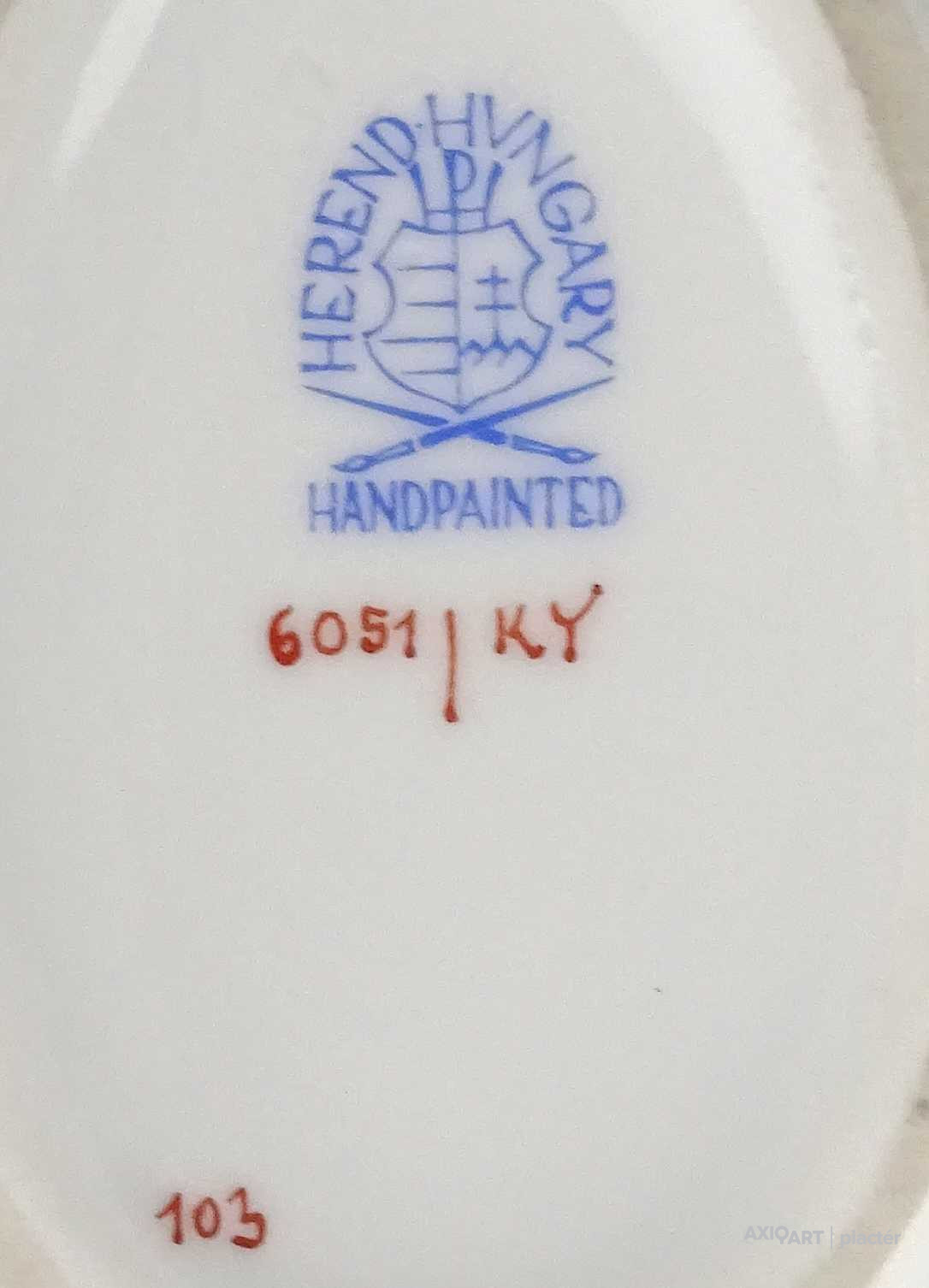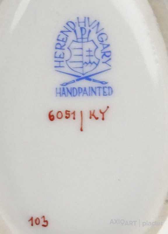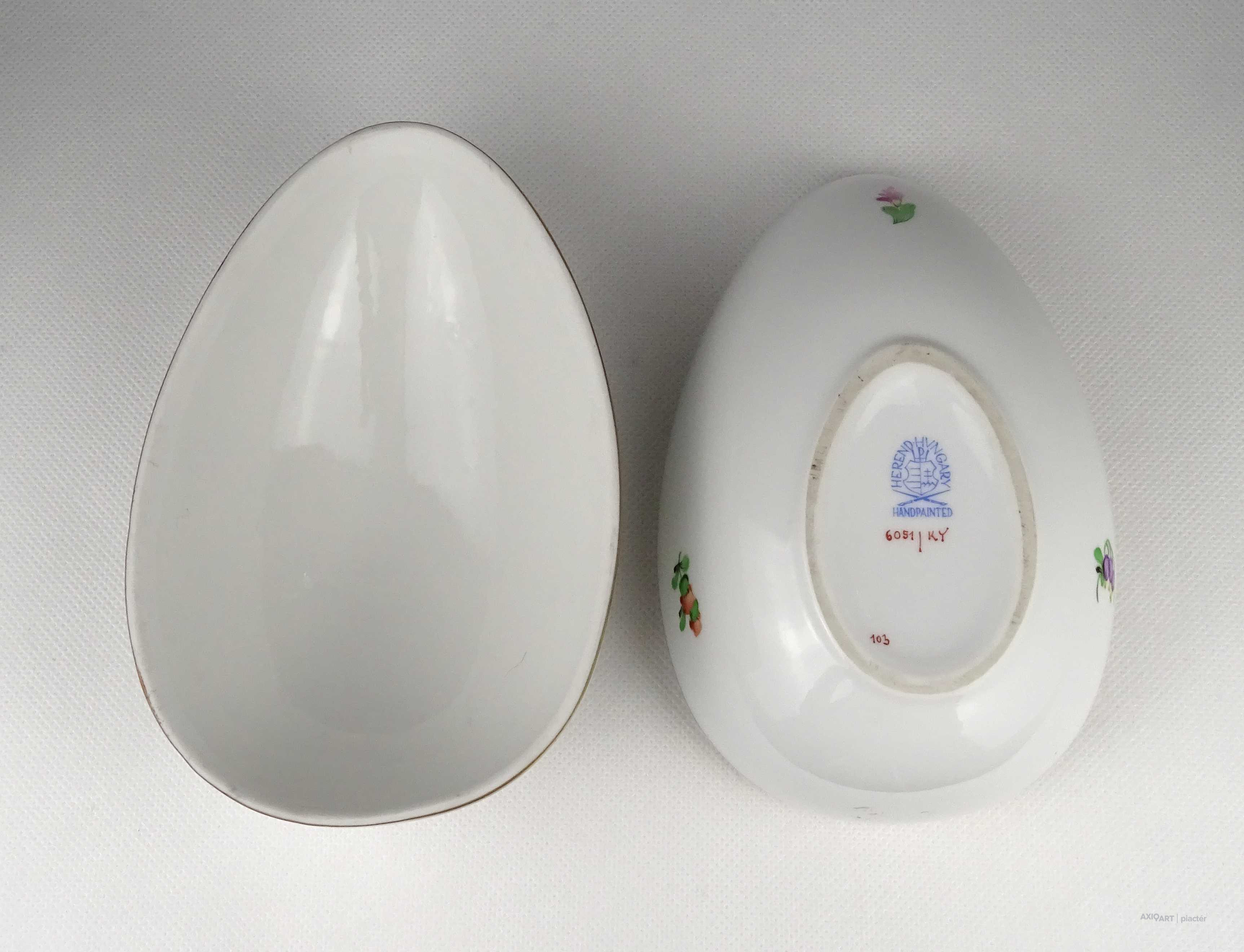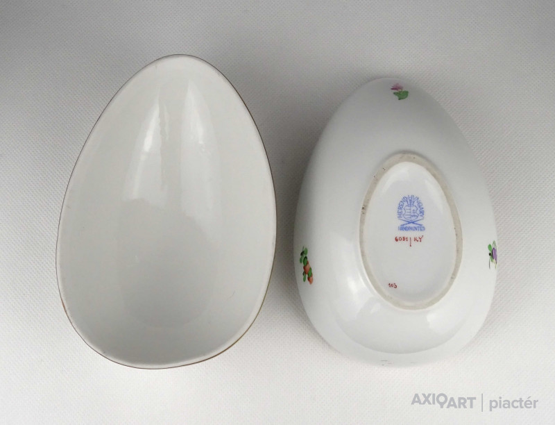 [1Y256/X304] Hibátlan állapotú, hatalmas méretű Kitty mintás, tojás alakú Herendi porcelán gyűrűtartó, ékszertartó, bonbonier. Aranyozása is kopásmentes, ajándékozható állapotban van. Alján kék Herendi jelzés: HEREND HUNGARY HANDPAINTED Mélynyomással: HEREND Formaszám pirossal: 6051/KY Magasság: 10.3 cm Szélesség: 11 cm Hosszúság: 16.7 cm Súly: 0.5 kg