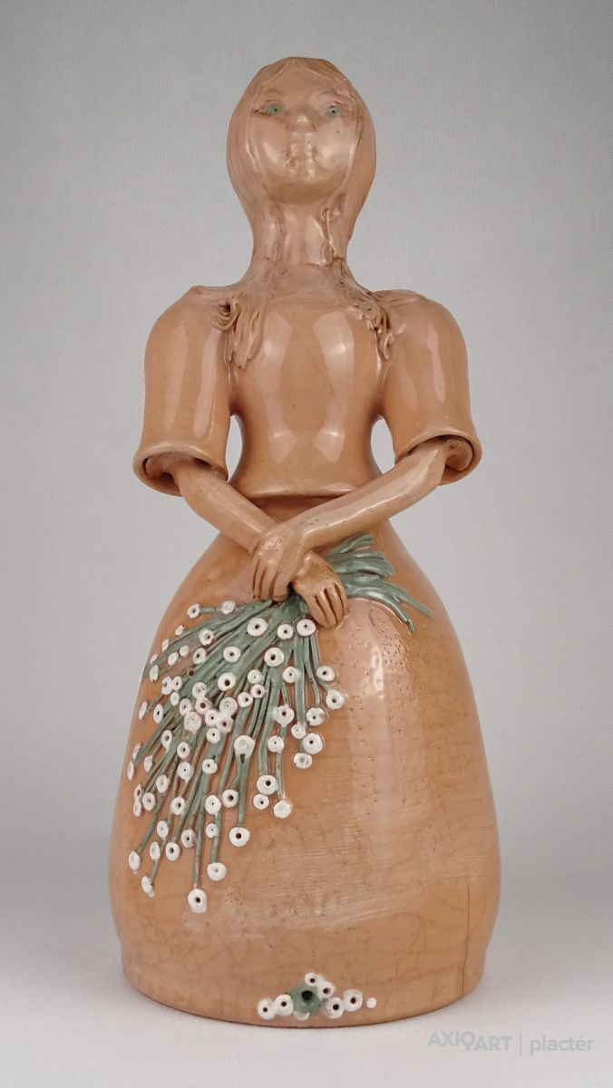 Hibátlan állapotú, nagy méretű kerámia nő figura. Jelzetlen mázas kerámia nő, kezében virággal.