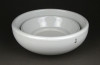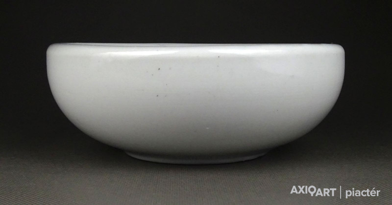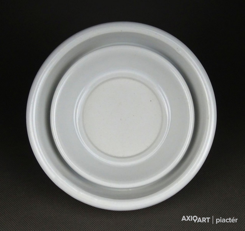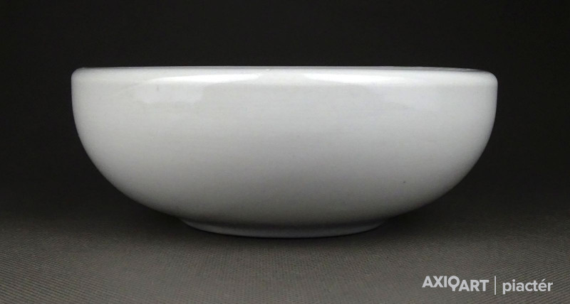 [1G920/UZ-N] Régi, hibátlan állapotú vastag falú porcelán tárgy. Érdekessége, hogy alakja a nagyfeszültségű szigetelőre hasonlít, bár nem lyukas a közepe. Elképzelhető, hogy akkumulátorgyári használati tárgy. Oldalán kívül régi Kőbányai porcelángyár jelzése található, lásd fotó. Magasság: 6.5 cm Szélesség: 17.5 cm Súly: 1.445 kg Egy kis történelem Kőbányai Porcelángyár a hatvanas években, fekete-fehér képekből összeállítva, színezve; Fotó: ismeretlen   Az ős gyár Alois Miesbach X. Külső Jászberényi út 41. téglagyárának kibővítése révén jött létre. A termelés 1846.-ban indult meg és 1908.-ig kizárólag tégla, tetőcserép és keramit útburkoló kockákat gyártottak. A társulat a fajansz- és porcelángyárat 1908.-ban hozta létre. A termelés főként falburkoló áruk, műszaki és egészségügyi porcelánok készítésével folyt. A díszmű gyártás, bár erről pontos adatok nem állnak rendelkezésre, a húszas évek elejéig tarthatott és 1936.-ig a Porcelángyár újraindításáig megint csak ipari és egészségügyi árut termelt. 1936.-tól ismét beindult a díszműgyártás. A gyárat 1941.-ben hadiüzemmé nyilvánították, majd 1944.-ben súlyos bombatalálat érte. A termelés a szovjet parancsnokság alatt 1945.-ben indult be újra. 1949.-ben a Kőszénbánya és Téglagyár Társulat Pesten (azelőtt Drasche) államosításakor három téglagyárra, egy tűzállógyárra és a Drasche Porcelángyár Nemzeti Vállalatra osztották.   A gyár profilja műszaki porcelán, edény és díszműporcelán lett. 1949. május 31-től a Nagybátony-Újlaki Téglagyár telepén működött elektrokerámiai üzemet átadták a Porcelángyárnak. Ezzel egy időben megkezdődött Kőbányán a szteatit szigetelők és pirolit nevü hőtechnikai szigetelők gyártása is. Az elektrokerámiai (híradástechnikai) üzemet először a megszűnt edénygyár területére helyezték, később 1953 végén külön épületet kapott. Fotó: ismeretlen, 1975, a kémény mögött a magas Drasche lakóházon jól látszik a később épített felső szint, az utca felé a gyár épületén még csak a vörös csillag van, nincs ott a nagy "Finomkerámiaipari Művek", aminek a helyére a KŐPORC felirat került később. Fotó: archivum.mtva.hu, 1961, Liget utcai telephely 1950-51-ben új laboratórium épült a gyárban. A modern 5 szintes épületben az anyagvizsgáló kémiai laboratóriumon kívül itt kapott helyet a híradástechnikai fejlesztés-, és vizsgálólabor, valamint új nagyfeszültségű vizsgálólabor is. A gyárban a termelést gyáregységekbe szervezték. Így alakult ki a porcelán, a híradástechnikai és gépészeti gyáregység. A gépészeti gyáregységben a folyamatos karbantartási munkák mellett jelentős helyet foglalt el a gépfejlesztés, azaz új célgépek és kemencék tervezése és kivitelezése. A híradástechnikai gyáregység részére terveztek és készítettek számos speciális gyártó és szerelő gépet, automatákat. Fotó: ismeretlen, a massza üzem eleje Fotó: ismeretlen, a mai Porcelán utca a 70-es években 1951 Kőbányai Porcelángyár lett a gyár neve. 1954-ben a megszűnt Solus Csiszolókoronggyár kőbányai Liget utcai telepét a gyárhoz csatolták, ahol sajtolt porcelánszerelési cikkeket, porcelán díszműárut, kordierit-, és pirolit hőtechnikai termékeket állítottak elő. 1969-ben a Budapesti Porcelángyár nógrádverőcei telepét a gyárhoz csatolták, ahol laboratóriumi porcelánokat gyártottak. A Liget utcai telepet 1969-ben átadták a Hollóházi Porcelángyárnak, ezzel megszűnt a díszmű gyártás. A festést végző dolgozókkal együtt a tervező csapat is a Hollóházi Porcelángyárhoz került. A széntüzelésű, szennyező kemencéket bezárták. Fotó: ismeretlen, 1976(?), főbejárat A híradástechnikai gyáregységben a kísérleti és kutatómunka alapján megkezdték a csőkondenzátorok gyártását. Ezek égetésére előbb egy periódikusan működő, gáztüzelésű (Pb-gáz), majd egy folyamatos üzemű gáztüzelésű, tolólapos kemencét építettek. 1957-ben megkezdték a trimmer kondenzátorok gyártását. Úgyszintén eredményesen végződtek a lágymágnes-ferrit termékek gyártására megindított kísérletek is és ferrit gyártó üzem létesült. Fotó: ismeretlen, 1982 előtt 1959-60-ban jelentős beruházások kezdődtek. Megkezdődött a porcelán gyáregység rekonstrukciója. Ennek keretében újjáépítették, ill. korszerűsítették a nyersanyagtárolót és a porcelánmassza üzemet. 1970-ben sajtolómassza előkészítésére porlasztószárítási (atomizer) technológiát vezettek be. Fotó: ismeretlen, 1976(?) A gyár 1960-ban új telephelyet létesített Balassagyarmaton, ahol saját tervezésű és készítésű célgépekkel kondenzátor termékeket gyártottak. A IV. ötéves terv keretében Debrecenben és Bernecebarátiban létesült híradástechnikai üzem. Fotó: Bognár József - KŐPORC 1836-1988, 1982(?)   1982 Átnevezik KŐPORC Elektronikai Alkatrész és Műszaki Kerámiagyártó Vállalat névre a gyárat. A kilencvenes évek felé az elektronika-technikai fejlődés annyira felgyorsult, hogy a hagyományos termékek folyamatosan kiszorultak a piacról. Ez és a KGST piac összeomlása azt eredményezte, hogy a gyár fokozatosan megszűntetni kényszerült először a vidéki telephelyeit, majd Budapesten is megszűnt a híradástechnikai termékek gyártása. A porcelánszigetelő gyártmányok iránt is csökkent a kereslet, ezért a porcelán gyáregység átszervezésére is sor került. Fotó: ismeretlen, 1982 előtt, még a FINOMKERÁMIAIPARI MŰVEK felirat látható 1990 Megkezdődött a privatizáció. A minisztériumi felügyelet átkerült az Állami Vagyonügynökséghez. Az új vevő a termelést leállította és nem is kívánta folytatni. Az érté