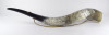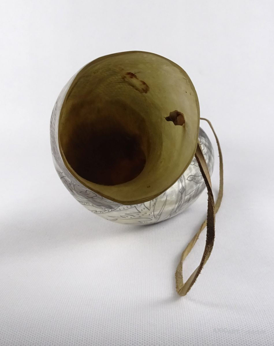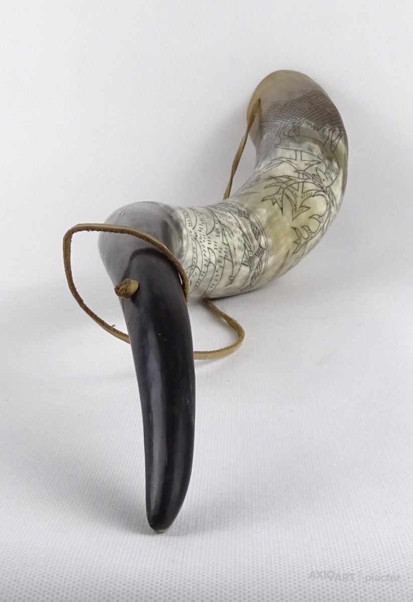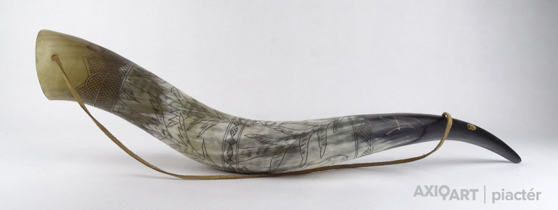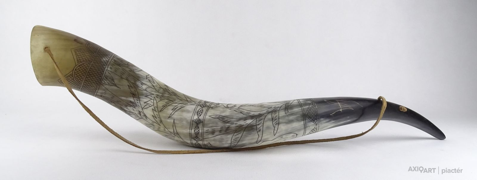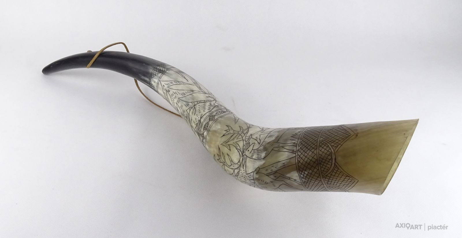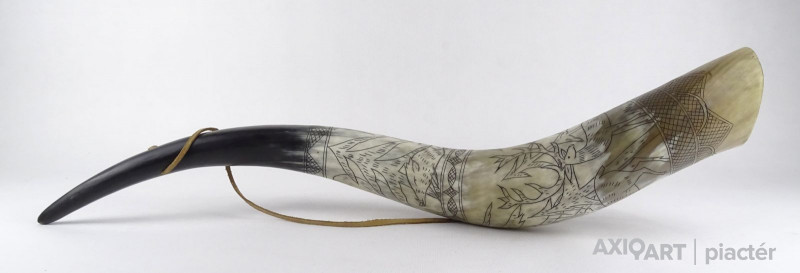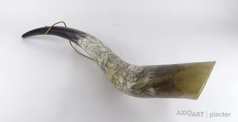 [1S632/X204] Szürkemarha szarvából készített szaru dísztülök. Körben karcolt, vésett vadász jelenetekkel díszítve. Őz, szarvas, fenyő erdő, vaddisznó ábrázolások láthatók rajta. Hasított bőr akasztási lehetőséggel rendelkezik. Rajta karcolt jelzés: LA (L.A.) Hosszúság: 63 cm Súly: 0.765 kg