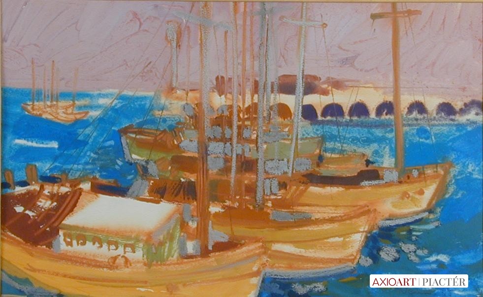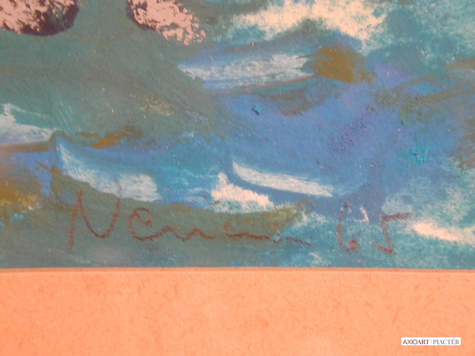 [FK0302/Bp44/23] A kép mérete: 42 x 60 cm keret nélkül. Készült: Tempera, Karton A kép Nemcsics Antal (Pápa, 1927) alkotása. Jelezve Jobbra lent "Nemcsics 65" A festmény jó állapotban van. Keret: Ép A festmény hátoldalán a Képcsarnokvállalat címkéje található. Magyar festők és grafikusok életrajzi lexikona I-II. Festő és grafikus. A budapesti Képzőművészeti Főiskolán Kontuly Béla, Kmetty János és Szőnyi István tanítványa volt. Ez utóbbi hatása maradandó: korai alkotásain felfedezhetők a nagy mesterek szuggesztivitásából kisugárzó remineszceniák. 1951-ben a fővárosi Műszaki Egyetem tanára lett, ahol mint adjunktus színkompozícióra, valamint színtanra oktatta a jövő építészeit. 1952 óta vesz részt kiállításokon. Derűs színharmóniájú tájfestményeit, karakteres portréit több mint 30 hazai és külföldi tárlaton mutatta be. A fővárosban és vidéken több sgraffittót készített. Munkásságára a legtovább és a legerősebben a természetelvű posztnagybányai hatásból táplálkozó atmoszférikus festésmód volt jellemző. A Cezánne-i kubizmus tanulságain és az expresszivitáson keresztül, a modern képi felfogás felé ösztönző úton a mozaikszerű folt- és színépítkezéshez jutott el. A falfestészettel foglalkozó elméleti munkássága is figyelemre méltó. Nemcsics Antal tudományos szinten foglalkozik a színek optikai törvényeivel. Számos előadást tartott több színelméleti kongresszuson, külföldi egyetemen. Rézkarcolással is foglalkozott. A Nemzetközi Színtudományi Akadémia és a Színtervezők Nemzetközi Szövetségének alelnöke, a Magyar Rajztanárok Országos Egyesületének elnöke. A Colorid színrendszer, a komplex színharmónia-elmélet, a színdinamikai környezetelméletet, a színreferencia indexszámrendszer kidolgozója. Díjak: VIT-díj; Giorgine-díj; Nemzetközi Színtervezési díj. A Ferihegyi Repülőtér, a budai Várnegyed,a budapesti metró színtervezési munkáit végezte. Mozaikok, falképek, kerámiaképek, színes üvegablakok (többnyire templomokban), többet között Erdélyben, Nyíregyházán, Pásztón és Lengyelországban az ő alkotásai. (ML, S. Szabó Katalin, E. E.: Műv. 1970/3) Magyar festők és grafikusok életrajzi lexikona I-II. Műgyűjtők és kereskedők kézikönyve Festő és grafikus. A budapesti Képzőművészeti Főiskolán Kontuly Béla, Kmetty János és Szőnyi István tanítványa volt. Ez utóbbi hatása maradandó: korai művein felfedezhetők a nagy mesterek szuggesztivitásából kisugárzó reminiszceniák. 1951-ben a fővárosi Műszaki Egyetem oktatója lett, ahol mint adjunktus színkompozícióra és színtanra tanította a jövő építészeit. 1952 óta kiállító művész. Derűs színharmóniájú tájképeit, karakteres portréit 1957-ben és 1959-ben Budapesten, 1965-ben a Derkovits Teremben, 1963-ban Rómában, 1966-ban és 1967-ben Münchenben mutatta be. A fővárosban és vidéken több sgraffittót készített. Munkásságára a legtovább és a legerősebben a természetelvű posztnagybányai hatásból táplálkozó atmoszférikus festésmód volt jellemző. A Cézánne-i kubizmus tanulságain és az expresszivitáson keresztül, a modern képi felfogás felé ösztönző úton a mozaikszerű folt- és színépítkezéshez jutott el. A freskófesztésettel foglalkozó elméleti munkássága is figyelemre méltó. Tudományos szinten foglalkozik a színek optikai törvényeivel. Előadott több színelméleti kongresszuson és külföldi egyetemen. Rézkarcolással is foglalkozott. Több kitüntetésben részesült. 1963-ban a "Caselfranco Veneto" című alkotásáért megkapta a Giorgione-díjat. (ML, E.E.: Műv.-1970/3) Magyar festők és grafikusok adattára A Képzőművészeti Főiskolán Kontuly Béla, Kmetty János, majd Szőnyi István növendékeként végzett. 1952 óta kiállító művész. Derűs színharmóniájú tájképeit, karakteres portréit 1957-ben és 1959-ben Budapesten, 1960-ban Pápán, 1961-ben Veszprémben mutatta be, 1965-ben a Derkovits Teremben, 1987-ben Pestlőrincen mutatta be. Külföldi kiállításai: Rómában (1963) és két alkalommal Münchenben (1966, 1967). Budapesten és vidéken több sgrafittót készített. A freskófestészettel foglalkozó elméleti munkássága is figyelemre méltó. Ugyancsak tudományos szinten foglalkozik a színek optikai törvényeivel, pszchofizikai hatásaival. 1963-ban az olaszországi Castelfranco Venetaben Giorgine-díjat kapott. A budapesti Műszaki Egyetemen a színelmélet tanára. Előadott több színelméleti kongresszuson (Luzern, Drezda, Stockholm stb.) és külföldi egyetemen. - ML Művészeti lexikon I-IV. Festő. A Képzőművészeti Főiskolán Kontuly Béla, Kmetty János, majd Szőnyi István növendékeként végzett 1950-ben. 1952 óta kiállító művész. Derűs színharmóniájú tájképeit, karakteres portréit 1957-ben és 1959-ben Bp.-en, 1960-ban Pápán, 1961-ben Veszprémben mutatta be, 1965-ben a Derkovits-teremben rendeztek műveiből gyűjt. kiállítást. Bp.-en és vidéken több sgraffitót készített. A freskófestészettel foglalkozó elméleti munkássága is figyelemre méltó. Ugyancsak tudományos szinten foglalkozik a színek optikai törvényeivel, pszichofizikai hatásaival. 1963-ban az olaszo.-i Castelfranco Venetóban Giorgione-díjat kapott. Művész életrajzok kortárs magyar képzőművészek Festő. 1950-ben végzett a főiskolán, mestere Szőnyi István volt. Tanulmányutakat tett számos kelet- és nyugat-európai országban, megfordult Amerikában. 1949 óta kiállító művész, fontosabb egyéni tárlata a Fényes Adolf Teremben (1959), Rómában (1963), a Derkovits Teremben (1965), Münchenben (1966, 1967), a Balatonfüredi Galériában (1982) és a Csepeli Iskolagalériában (1983) volt. 1951 óta a Műszaki Egyetem tanára, a színelmélet nemzetközi rangú