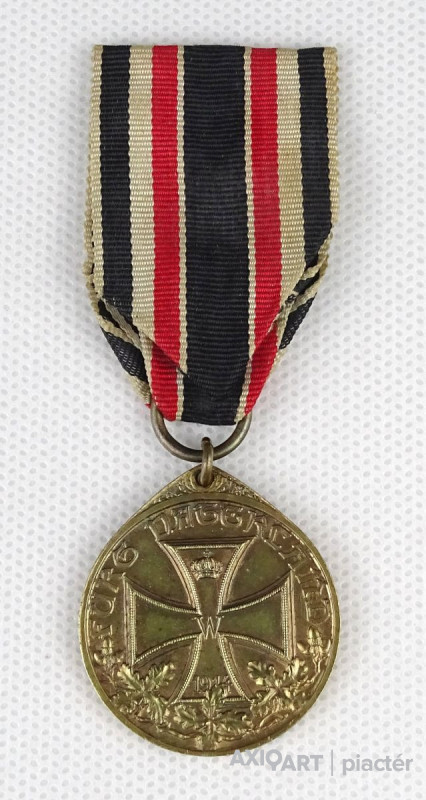 [1P464/FSZ] Régi, szép állapotú, világháborús kitűző, érem, emlékérem. Felirat: FÜRG DAGERLAND W 1914 Szélesség: 3.2 cm Hosszúság: 8.8 cm Súly: 0.015 kg Német Világháborús Emlékérem (Német Becsületlégió) Ugrás a navigációhozUgrás a kereséshez A világháborús német emlékérme, aranyozott változata, előlapja felhelyezett harci jelvénnyel.Az érem hátlapja, rézbevonatú változat. A német második világháborús emlékérem a Weimari Köztársaság egyik legismertebb, nem kormányzati, német második világháborús emlékérem . Őstörténet  A Német Birodalom hivatalos körei még a háború alatt, körülbelül 1917 őszétől tárgyaltak egy háborús emlékérme tervezett létrehozásáról. Miután a császár és a német szövetségi herceg jóváhagyta a tervet, 1918 júliusában megkezdődött a munka az érem konkrét tervén. A benyújtott pályázatok között szerepelt a neves festő, Franz Stassen terve . A projektet a háború eszkalálódása, a forradalom és a politikai helyzet teljes átrendeződése miatt nem folytatták tovább. A Weimari Köztársaságban különböző politikai okok miatt nem hoztak létre hivatalos emlékművet az 1914-18-as világháborúra, bár a legtöbb más állam (beleértve a vesztes oldalon lévőket is) megfelelő kitüntetéseket készített. A vesztes oldalon lévő államok számára a csalódottan hazatérő katonák ilyen kitüntetése szinte lélektani szükségszerűség volt. A megváltozott társadalomba és az új államba való visszailleszkedésüket szolgálta, és minden politikai megfontoláson túl az eredmények személyes elismerésének és elfogadásának érzését keltette. Ezt Németországban figyelmen kívül hagyták, ami nagy elégedetlenséget, az állammal való kiábrándulást és erős intellektuális vákuumot eredményezett a háborús veteránok körében. Ezt a hiányt számos kisebb-nagyobb egyesület töltötte be világháborús kitüntetésekkel és emlékjelképekkel, valamint "hazafias támogató programmal". Közülük a világháborús német tiszteletbeli emlékérme különleges helyet foglal el, nem csak azért, mert az egyik legnépszerűbb kitüntetés volt, hanem azért is, mert a kitüntető "Ordensrat" ezt tartotta az "egyetlen hivatalos"-nak, a kitüntetés pedig mindig "iV"; „a császár vagy a kormány nevében”. A sokszor nagyon művészien és igényesen megtervezett nem hivatalos világháborús érmek mindegyikét betiltották a (nagyon szerény és csak egyoldalú bélyegzővel ellátott) állami világháborús Becsületkereszt alapításával 1934-ben, adományozásuk ekkor leállt . legkésőbb a további viselést megtiltották. Előfordult, hogy ezeket a „magán” kitüntetéseket egy ideig (1935-ig) illegálisan ítélték oda, sőt gyakran hallgatólagos toleranciával vitték tovább a hivatalos rendek és kitüntetések mellett. Alapítvány és díj  szalagkapocs; a középső szalagon a világháború tiszteletbeli emlékéremére, felhelyezett miniatűr csatajelvénnyel.Kitüntetési oklevél az éremért a csatajelvénnyel. 1921-ben, az 1914-18-as világháború emlékére hivatalos, állami, német kitüntetés hiányában, a „Nemzeti Szemléletű Katonák Szövetsége” felvetette a már korábban tervezett háborús emlékérem adományozásának gondolatát. a háború alatt. Ezen a „nemzeti gondolkodású katonák egyesületén” belül intézményként „rendi tanács” jött létre, amely az i. kitüntetést adományozta. V., azaz a császár vagy az állam nevében. Nem sokkal azelőtt, hogy a „Nemzeti Gondolatú Katonák Szövetségét” betiltották, ez a rendi tanács kivált az egyesületből, és önálló intézménnyé vált. Ezzel egy időben Berlinből a bajorországi Buxheim an der Illerbe helyezte át székhelyét. 21-én megalakult a Rendi Tanács. 1921 szeptembere bejegyzett egyesületként, és a régi hadsereg minden rendű tagja képviseltette magát, nem csak tisztek. A rendi tanács élén a tiszteletbeli marsall, a kancellár és az igazgatóság állt. Először tiszteletbeli vezérezredesként működöttKarl von Einem , mint kancellár és az éremalap hajtóereje Hauptmann a. D. Rudolf Hering-Deutschwehr. Az érem birtokosai önkéntes alapon egyesültek az ún. „Német Becsületrendben”. Ez a megjelölés szándékosan a híres "Francia Becsületlégió " -n alapult, és az egyesületet kezdetben így osztották fel légiókra és kohorszokra, mint alcsoportokra. A Rendi Tanács igazgatósága automatikusan a „Német Becsületlégió” igazgatótanácsa is volt; egyébként a szervezetek függetlenek voltak egymástól. A világháborús német emlékérme rendjének 1922. december 1-jei alapszabálya kimondja: „ A Német Világháborús Emlékérem, a DEdW egy kitüntetés, amelyet a halottak emlékére, az élők tiszteletére és az eljöttek utánpótlására hoztak létre. Ez az a történelmi díj, amelyet átadtak volna, ha nem hiúsították volna meg alattomosan a dicsőséges német fegyverek győzelmét. A DEdW IV. Rendi Tanácsának kérelmére vagy javaslatára ítélik oda. A DEdW-t háborús díszként viselik fekete, fehér és piros szalagon, közvetlenül a német hadiérmek mögött. A DEdW-t minden olyan férfi és nő kaphatja meg, akinek a kitüntetésre való méltóságát a becsületére tett írásbeli nyilatkozat igazolja, miszerint a világháború és az azt követő világháború idején a legjobb tudásuk és hitük szerint igyekeztek tenni kötelességüket a német hazáért. . Azok a férfiak, akik becsületük és lelkiismeretük alapján megerősítik, hogy frontharcosként harcoltak az ellenséggel, megkapják a DEdW harci jelvényt , amely egy kardból és egy tölgykoszorúból áll.” – Az érem rendszabályai Díjlevél a harci jelvény nélküli éremért.Kitüntetési oklevél