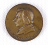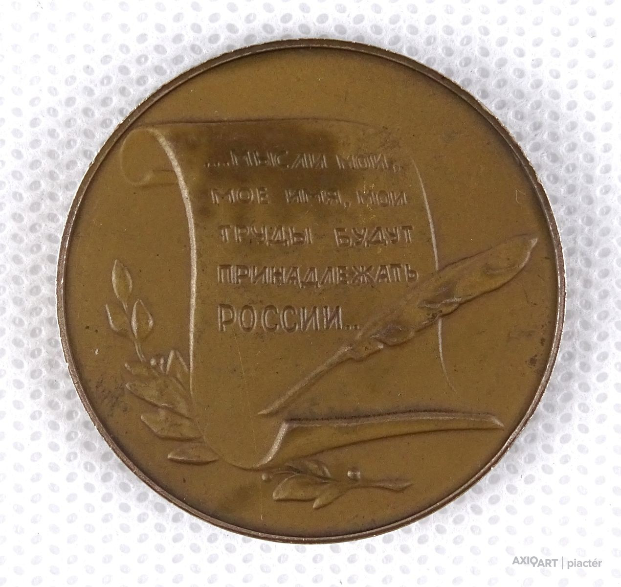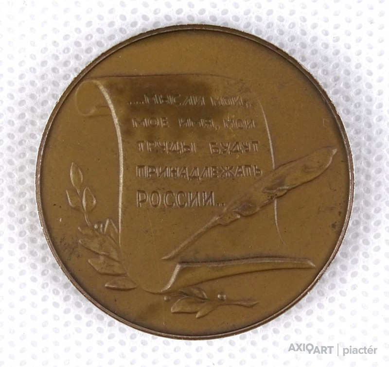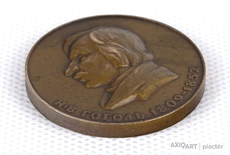 [1M149/X000] Kétoldalas bronz plakett, bronz emlékplakett. Egyik oldalán férfi portré, alatta cirill betűs felirat: Н.В. ГОГОЛЬ (N.V. GOGOL) 1809-1852 Jelzés: Ю ("Ju") Másik oldalán cirill betűs Gogol idézet : ... Мысли мои, мое имя, мои труды будут принадлежать России ... (... Gondolataim, nevem, műveim Oroszországé lesznek ...) Szélesség: 3.7 cm Súly: 0.03 kg Nyikolaj Vasziljevics Gogol    Ugrás a navigációhozUgrás a kereséshez Nyikolaj Vasziljevics Gogol Gogol arcképe A. A. Ivanovtól (1847) Élete Születési név Микола Васильович Яновський Николай Васильевич Яновский Született 1809. április 1. (március 19.) Szorocsinci, Orosz Birodalom Elhunyt 1852. március 4. (február 21.) (42 évesen) Moszkva Sírhely Novogyevicsi temető Danilov Monastery Nemzetiség ukrán Szülei Vaszil Panaszovics Hohol-Janovszkij Pályafutása Jellemző műfaj(ok) dráma próza Irodalmi irányzat kritikai realizmus Első műve Hans Küchelgarten (1827) Fontosabb művei A revizor (1836) Holt lelkek (1841) Hatása Csehov, Goncsarov, Andrej Belij, Bulgakov Nyikolaj Vasziljevics Gogol aláírása Nyikolaj Vasziljevics Gogol (orosz nyelven: Николай Васильевич Гоголь, ukrán nyelven: Микола Васильович Гоголь, Mikola Vasziljovics Hohol; Szorocsinci, 1809. április 1. – Moszkva, 1852. március 4.) ukrán származású orosz író. Az orosz irodalom klasszikusa, az orosz széppróza és drámairodalom egyik legnagyobb hatású alakja.  Élete Az Orosz Birodalomnak egy, ma Ukrajnához tartozó részén, a Poltavai kormányzóság Szorocsinci (ma: Veliki Szorocsinci) falujában született ukrán nemesi családban. Apja, Vaszil Panaszovics Hohol-Janovszkij kb. 1000 hektár földbirtokkal és 300-400 jobbággyal („lélek”-kel) rendelkezett, intéző volt a szomszéd nagybirtokosnál, mellesleg kedvtelésből ukrán nyelvű vígjátékokat írogatott. Régi kozák családból származott, de ősei között lengyelek is voltak; erre utal a Janovszkij név is, melyet később az író elhagyott. A férjénél több mint 10 évvel fiatalabb feleség mélyen vallásos, törékeny asszony volt, aki nem sokkal gyermekei születése után meghalt. A gyermekek közül csak Nyikolaj és négy nővére érte meg a felnőtt kort. Nyikolaj Gogol kezdetben egy poltavai iskolába járt, majd kilencéves öccse halála után, 1821-ben Nyezsin város líceumába íratták be, ahol hét évig tanult. Az iskolai színielőadásokon kitűnt komikumra hajló előadói tehetségével, részt vett a diákfolyóirat készítésében; szépirodalmi műveket is írt, ezek azonban nem maradtak fenn. 1825-ben apja meghalt. Bár így ő lett a család egyetlen férfi tagja, mégis folytathatta tanulmányait és 1828-ban elvégezte a líceumot. Ez lehetőséget adott arra, hogy hivatalnoki állást vállaljon. Az unalmas ukrajnai kisvárosi élet és az iskola egyre fojtóbb kötöttségei után végre ajánlólevéllel zsebében a fővárosba utazhatott. Forrás: wikipédia