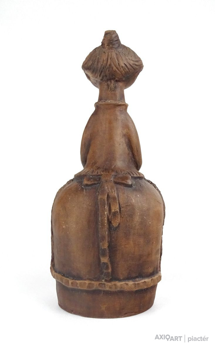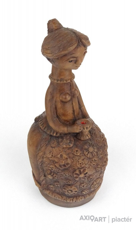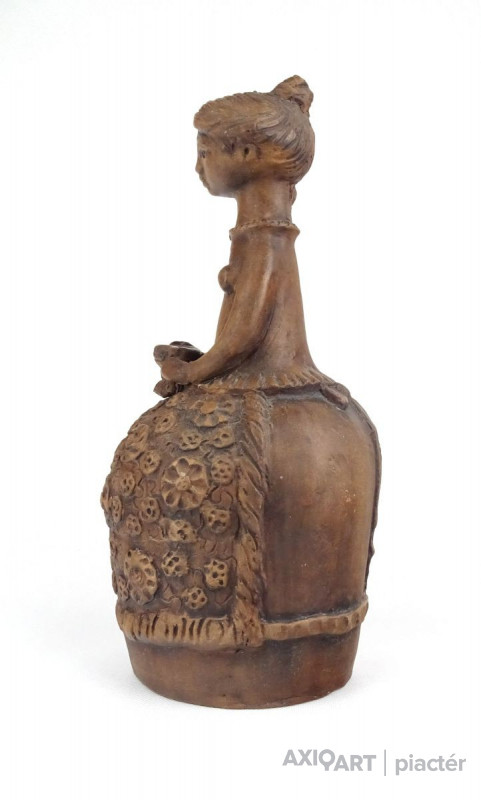 Hibátlan állapotú, nagy méretű, máz nélküli kerámia figura. Menyecske, népviseletben, kezében gyertyatartó.