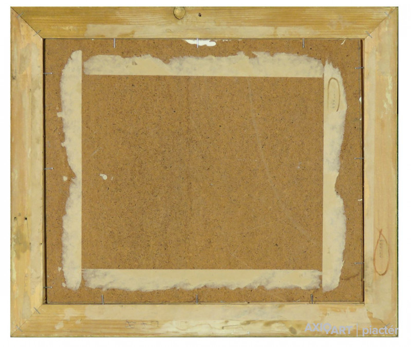 [1Y029/Z018] Olaj farost festmény, üveglap mögött, hibátlan képcsarnokos keretben. Hátoldalán Képcsarnok Vállalat papír címkéje: A művész neve: SCHÉNER MIHÁLY A kép címe: TÁJ Magasság: 66.5 cm Szélesség: 86 cm Súly: 6.54 kg Schéner Mihály festő, grafikus, szobrász, keramikus, bábtervező Medgyesegyháza, 1923-01-9 Elhalálozott: Budapest, 2009. május 11. Honlap: http://www.kormendigaleria.hu/kiadvany.html 1942-1947: Magyar Képzőművészeti Főiskola, tanára: Rudnay Gyula. 1978: Munkácsy-díj; 1984: érdemes művész; 1989: kiváló művész; 1995: Kossuth-díj. 1992-től a Magyar Művészeti Akadémia, 1993-tól a Széchenyi Irodalmi és Művészeti Akadémia tagja. 1956-ig tanított. 1982: Nagyatádi Faszobrász Alkotótelep, 1985: Nemzetközi Acélszobrász Alkotótelep, Dunaújváros. A stílusában felismerhető, mégis sokféle műtárgyat létrehozó ~ gazdag, állandóan alakuló életműve a folyton változó világban helyét kereső, az alkotói szabadságot megvalósító XX. századi képzőművész példázata lehetne. Magát expresszív-szürrealista alkotónak nevezi. Egyaránt dolgozik festékkel, textillel, fával, fémmel. Rajzol, szerkeszt, farag, épít, gyúr, varr és ragaszt, felhasználja a mézesbábok öntőformáit. Festő, rajzoló, textilszobor- és bábkészítő, fazekas, asztalos, esztergályos. Háromlépcsős folyamatban gondolkozik: rajzban tervez, majd fest, szobrot készít, “formába önt”, mindig a végső plasztikai megoldást keresi. Ami állandó és mégis játékosan változékony megjelenésű Schéner művészetében, az a gyermekkori emlékek által meghatározott népi mesterségek iránti tiszteletet kifejező motívumkincs, a tárgyi folklór formakészlete, amely már-már kézjegyként ismétlődik munkáin. Mitologikussá nőtt képzelete új lényeket teremt, pl: a Pigulát, amely disznótestű, emberfejű teremtmény. Schéner festményein a szürrealista motívumokat konstruktív szerkezetbe rendezi, a geometriát és az organikus természeti motívumokat egyaránt beépíti műveibe. A népi, népművészeti formakincsből merített lovas huszárok, betyárok, szegénylegények cifra szűr mentéje, piros csákója, fekete csizmája, az önálló életet élő zsinórdíszek és mézeskalács bábok, a kiskocsik a gyermekkori vásárok, búcsúk színes forgatagába vezet. A primér motívumokat aztán felváltják a vastagon felhordott felületbe karcolt jelek, vonalhálózatok, amelyek a játszó gyermek homokba rajzolt ábráit, a pásztorember fába vésett üzeneteit, az ősember barlang falába rótt mágikus jeleneteit idézik meg. A művész pillanatnyi érdeklődésének megfelelően a színek búvópatakként tűnnek el és jelennek meg ismét. A 60-as években leginkább a formákkal való játék érdekelte, a festmények felülete egyre gazdagodott: a táblaképek felületén applikációk jelentek meg, vagy lemállasztott rétegek hagyták maguk után hiányukat, motívumok nélküli ősformák, archetipikus képzetek bukkantak fel művészetében. A véletlenszerűnek látszó rétegekkel való játék azonban tudatos komponálás eredménye, amely később nyilvánvaló ritmusnak és formai szerkesztettségnek adja át a helyét, mint a Törvénytáblák c. sorozaton. A különböző művészi kifejezési formák egymásra termékenyítő hatással vannak, át- meg áthatják egymást. Textilszobrai, amelyekkel új műfajt teremtett, ugyanazzal az automatikus, expresszív-szürrealista módszerrel készülnek, mint festményei. A hagyományosan a népművészetben alkalmazott anyag, a filc lehetőséget ad a népi formakincs felelevenítésére, amely azonban a művész különös szürrealista átiratában jelenik meg. A szívekkel kivarrt, zsinórdíszes Posztókotlós c. művén mézesbábok lógnak, hátán huszárok lovagolnak. Egész sor textilből készült kéz-plasztikát alkot, amelyeket az ujjakra rávarrt díszekkel öltöztet, személyesít meg. A színes-különös világból aztán ~ újra puritán képi és formai rendbe juttatja el a nézőt, majd nemsokára tépett, gyűrt, vágott, csorgatott, repedezni hagyott szenvedélyesen vonagló képi felületeket hagy hátra. Schéner készített apró gyermekjátékokat, térstruktúra-tereket, mászókákat is. A magyar népi formák mellett szürreális játékaiban gyakran alkalmaz görög mitológiai alakokat, “elkentaurosodott” lovakat, Gorgó-fejeket, sellőket, hárpiákat, Pán-ábrázolásokat. Schéner nemcsak saját művészetéről publikál, hanem művésztársairól is számos írása jelenik meg, elsősorban az Új Auróra c. folyóiratban, amelynek egy ideig főmunkatársa volt. Irodalom kiállítása, Magyar Építőművészet, 1962/4. Húsz év után, Művészet, 1965/4. BOZÓKY M.: ~, Tiszatáj, 1968/5. PERNECZKY G.: Nincs uborkaszezon, Élet és Irodalom, 1969. augusztus 8. BARÁNSZKY-JÓB L.: ~, Művészet, 1969/9. LÁSZLÓ GY.: ~ kaposvári kiállítása, Jelenkor, 1969/4. MAJOR M.: Pásztorok, betyárok, huszárok - kezek, Tükör, 1970. szeptember 15. FRANK J.: Bemutatjuk ~t, Élet és Irodalom, 1972. május 6. ról kiállítása ürügyén, Képzőművészeti Almanach, Budapest, 1972 Sötétkék kokasok, Élet és Irodalom, 1973. szeptember 9. MAJOR M.: ~ játékai, Élet és Irodalom, 1974. július 27. BARTA J.: Egy különös művész, Alföld, 1974/6. VADAS J.: Szárnykészítők, Élet és Irodalom, 1975. október 4. JUHÁSZ F.: A halál ellen játszani, Élet és Irodalom, 1975. május 17. PAP G.: Kincsek és műkincsek, Művészet, 1975/6. P. SZŰCS J.: Az utak kettéválnak, Művészet, 1978/3. Békési művészet, Művészet, 1978/7. SZAMOSI F.: ~ [kismonográfia], Budapest, 1978 VADAS J.: Játék a játékkal, Élet és Irodalom, 1979. augusztus 18. NÉMETH L.: ~ műveiről, Művészet, 1979/4. MIKLÓS P.: Mit akar ez a múzeum?, Művésze