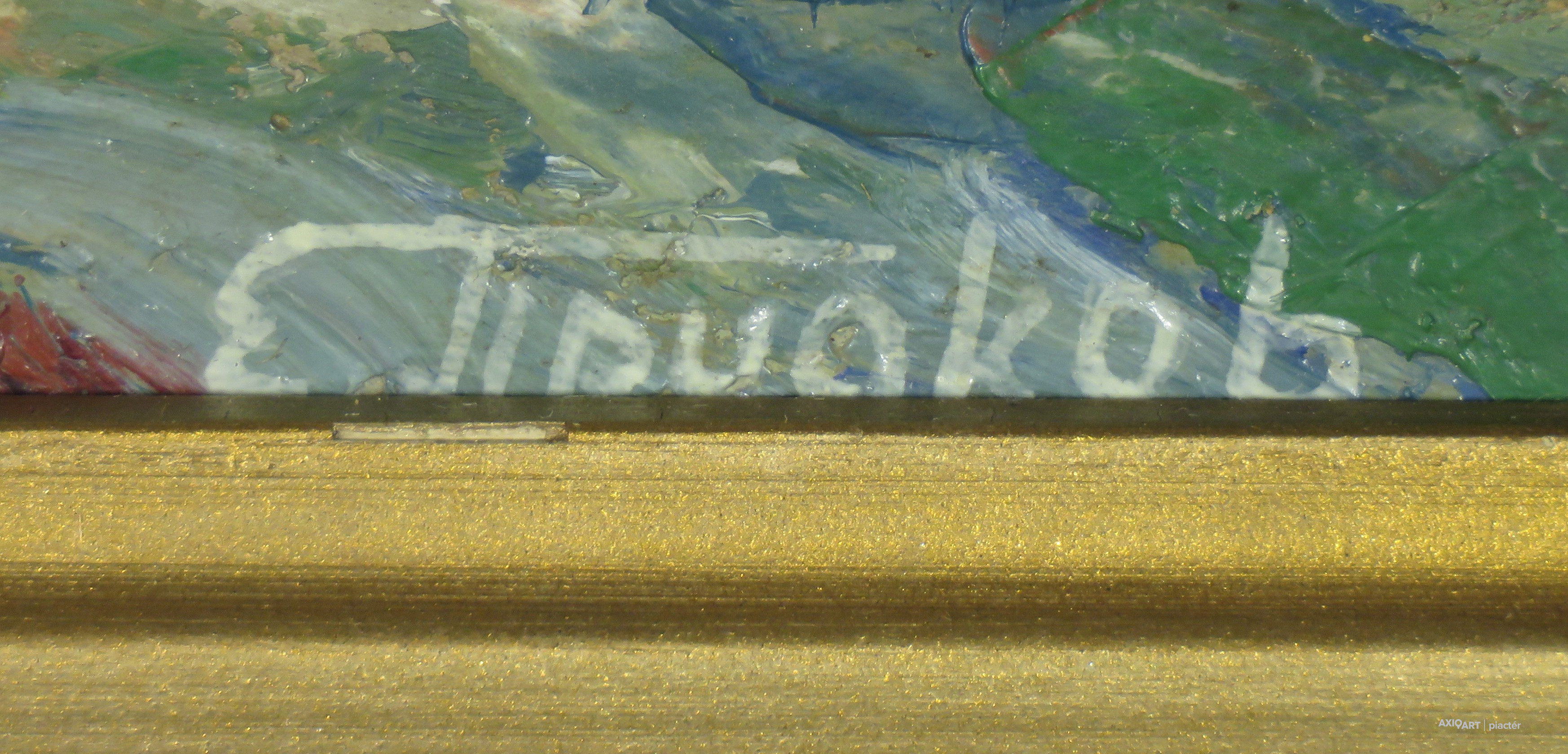 [FKB548/Bp40/40] A kép mérete: 31,5 x 37,5 cm keret nélkül. Készült: Olaj, Farostlemez A kép Orosz festő XX. sz. alkotása. Jelezve jobbra lent "ószláv írással E. Porujakov (?)" A festmény jó állapotban van. Keret: Sérült