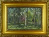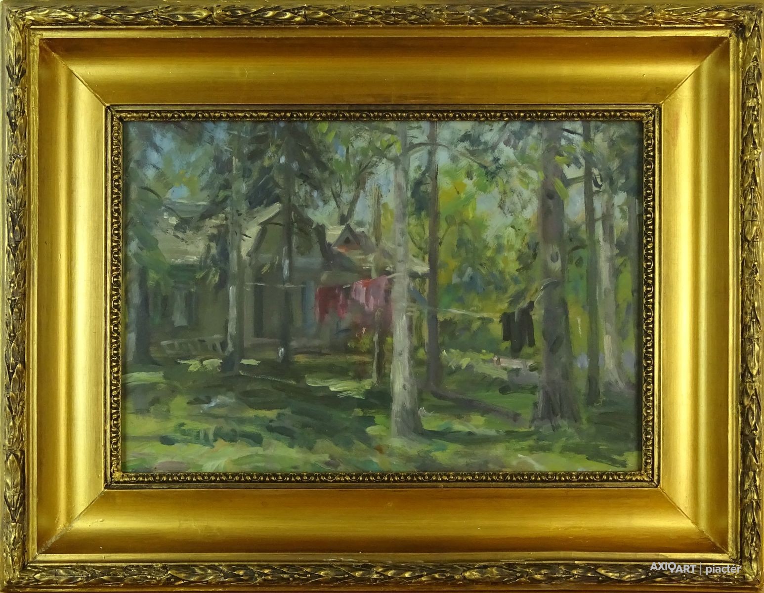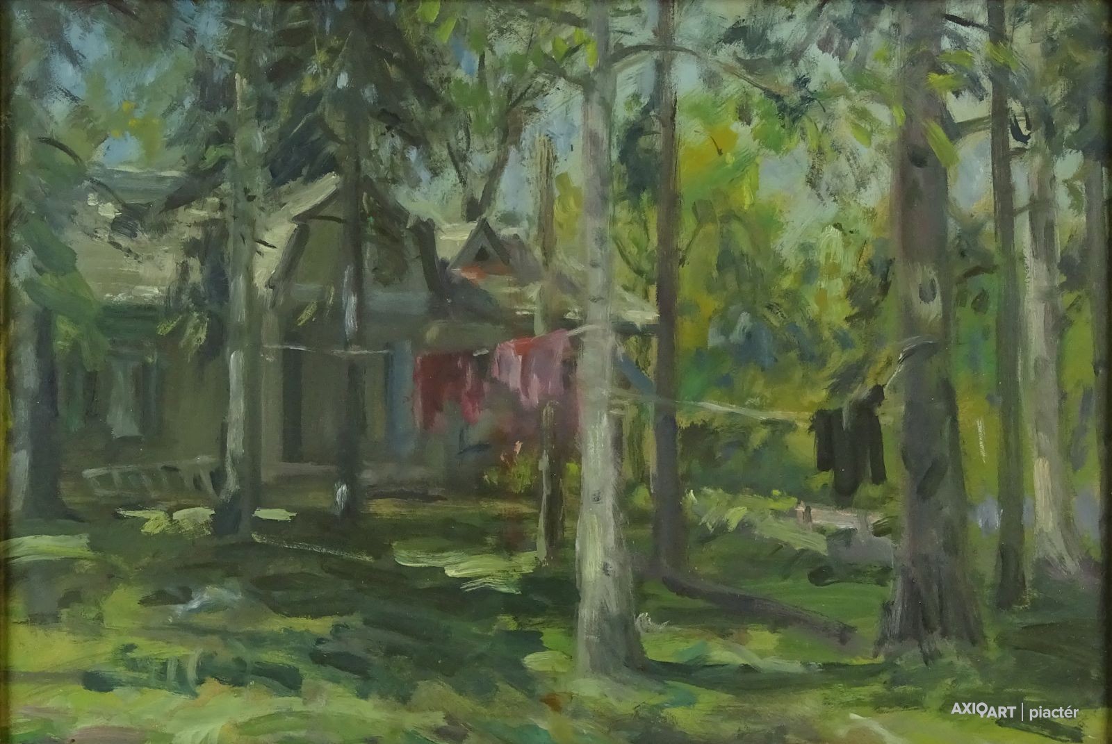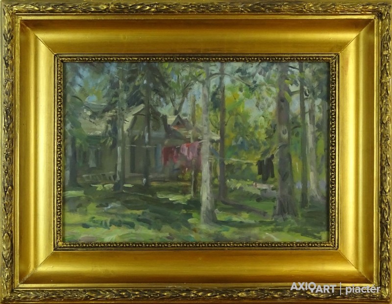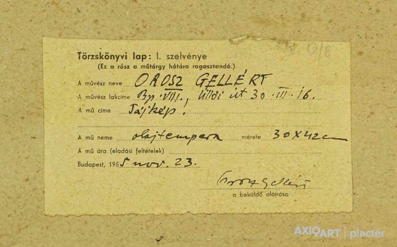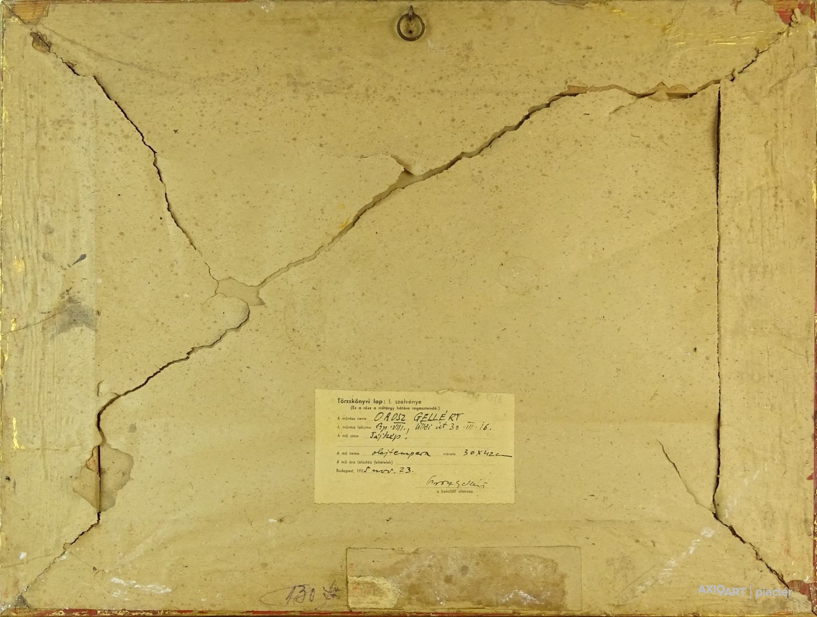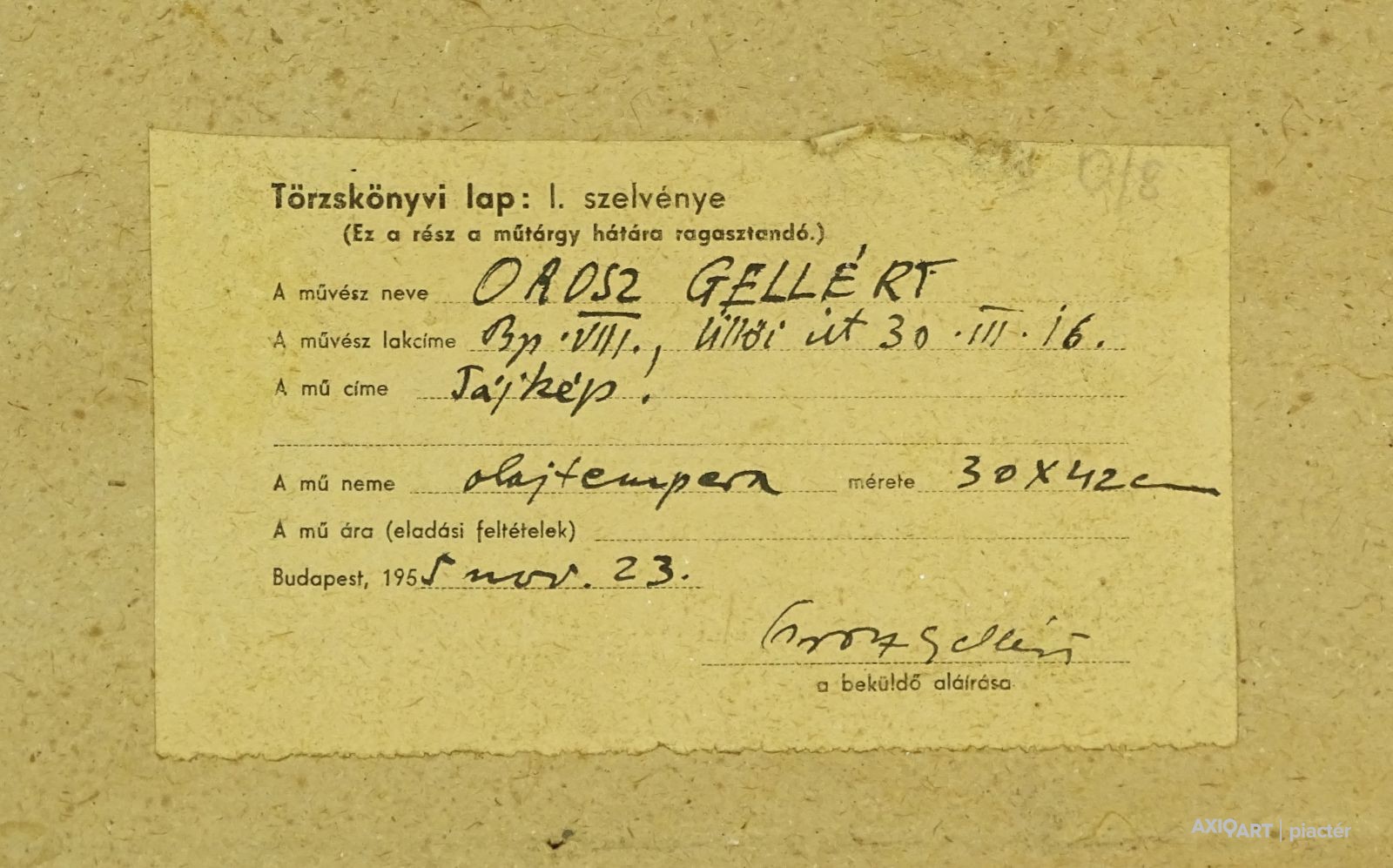 [0O683/W015] Papír olajtempera festmény, aranyozott hibátlan keretben, üveglap mögött. Hátoldalán címke és felirat: OROSZ GELLÉRT TÁJKÉP OLAJTEMPERA 1955. NOV. 23. Magasság: 43.5 cm Szélesség: 57 cm Súly: 2.7 kg