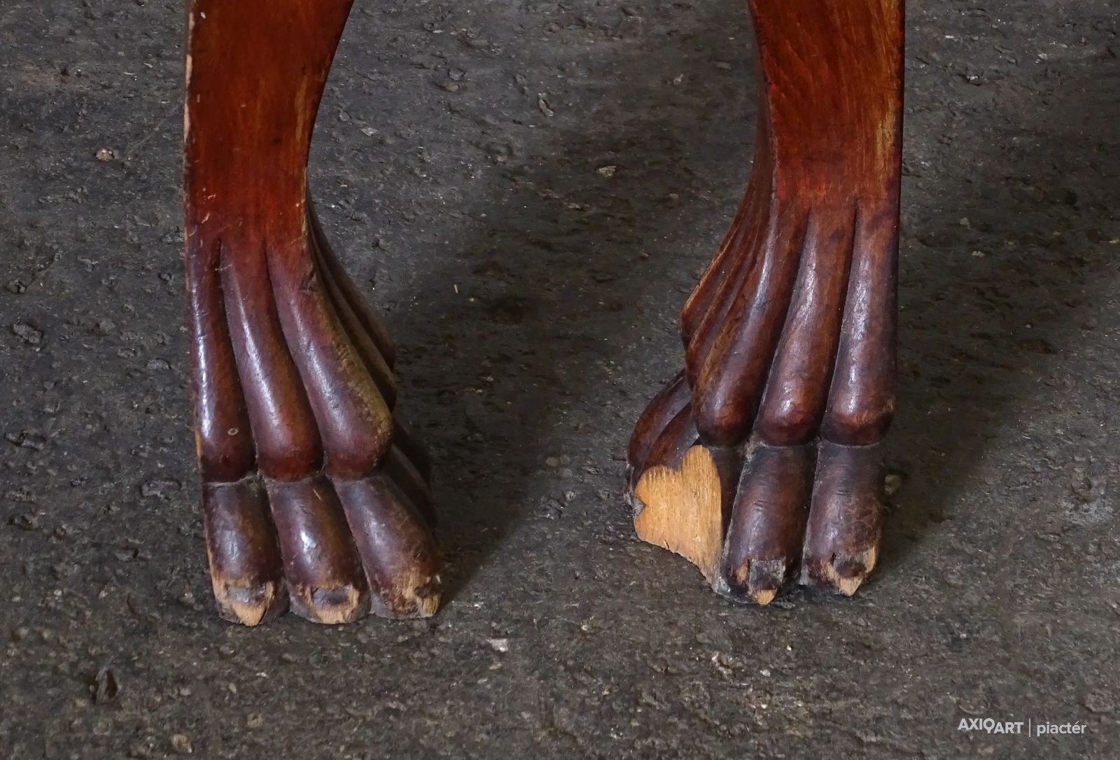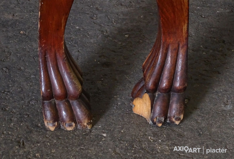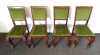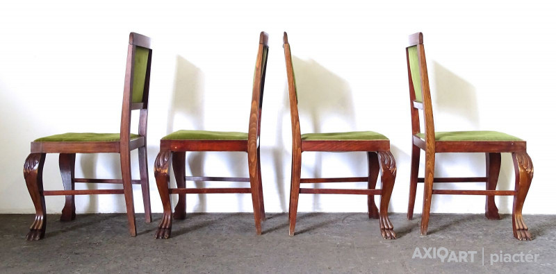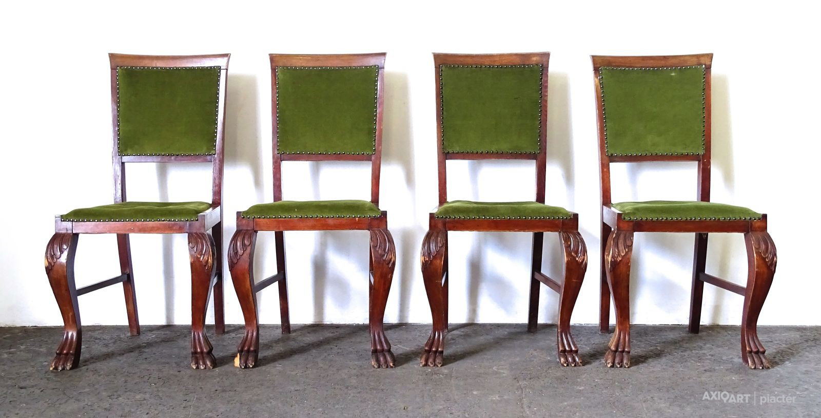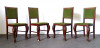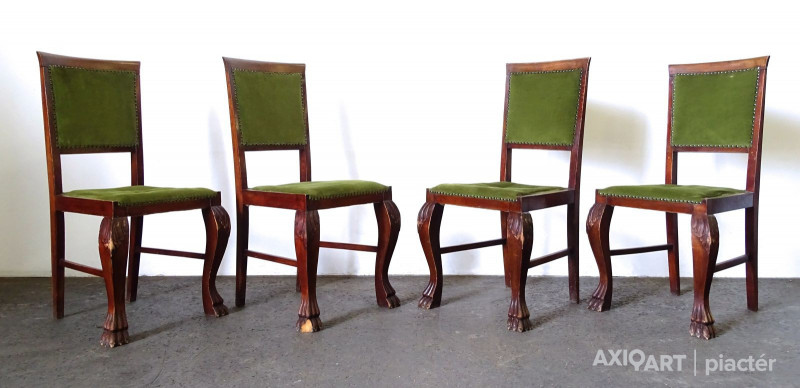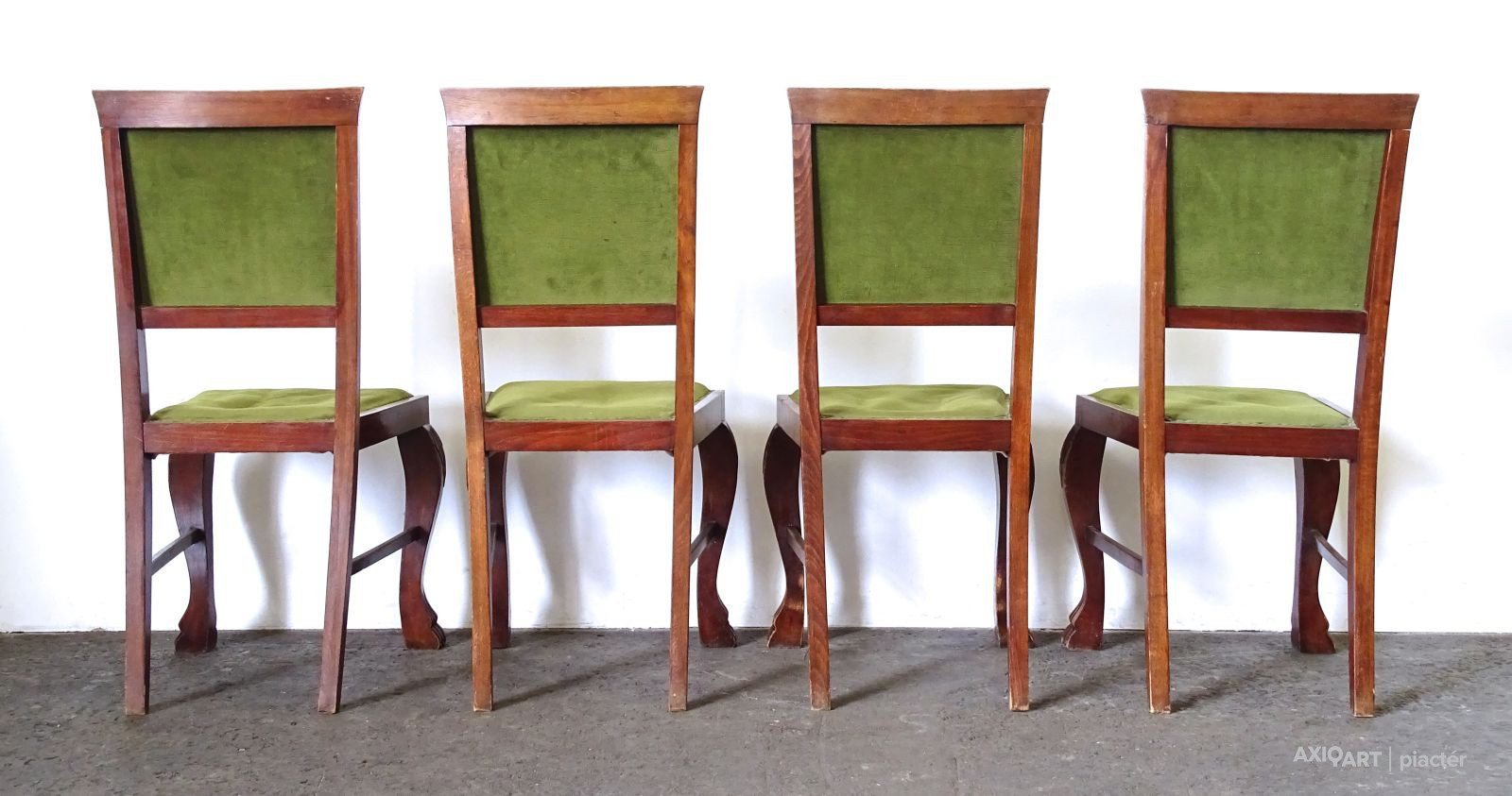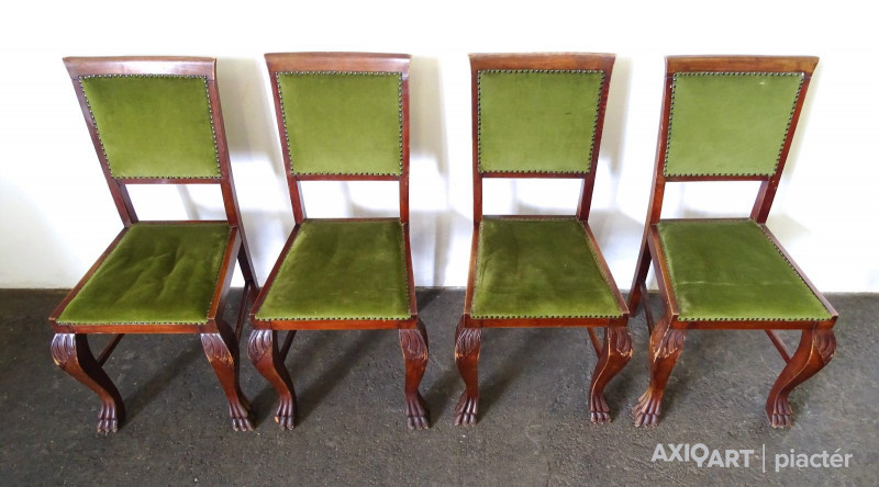 Szép állapotú, egységesen kárpitozott támlás, étkezőasztal szék garnitúrája, négy darab. Az egyik szép lába kissé sérült, lásd fotó.
