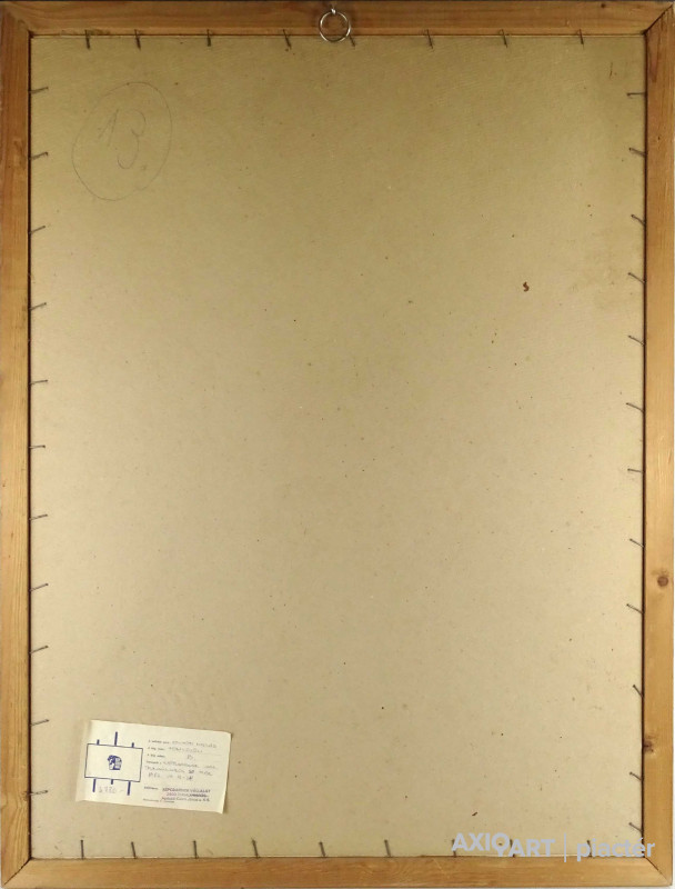 [FK0037/Z018] A kép mérete: 50 x 70 cm keret nélkül. Készült: Olaj, Vászon A kép Paizs László (Szentpéterúr, 1935) alkotása. Jelezve Jobbra lent "P. L." A festmény jó állapotban van. Keret: Ép A festmény hátoldalán a Képcsarnokvállalat címkéje található. Magyar festők és grafikusok életrajzi lexikona I-II. Festő. Tanulmányait a budapesti Iparművészeti Főiskolán végezte 1959-ben. Z. Gács György, Rákosy Zoltán és Szentiványi Lajos növendéke volt. A '60-as évek első felében hagyományosabb felfogású olajképeket festett, mozaikokat, freskókat, utóbb a pop-art körébe tartozó, a francia Arman munkáival rokon műveket alkotott. 1961 óta kiállító művész. Egyéni (Fényes Adolf Terem, Csók Galéria, Műcsarnok, Magyar Nemzeti Galéria, Halászbástya, Bástya Galéria, Vigadó Galéria, Budapest Galéria, Győr, Szombathely, Szeged, Zalaegerszeg, Duisburg, Aix-en-Provence, stb). és vegyes (Ernst Múzeum, Műcsarnok, Óbuda Galéria, Magyar Nemzeti Galéria, Csók Galéria, Vigadó Galéria, Székesfehérvár, Kaposvár, Pécs, Hódmezővásárhely, Firenze, Milano, Padova, Nápoly, Velence, Düsseldorf, Aachen, Genf, stb) tárlatokon vett részt. 1980-ban Munkácsy-díjjal jutalmazták, 1988-ban Érdemes Művész kitüntető elismerésben részesült. Munkáit őrzi a Magyar Nemzeti Galéria, a Fővárosi Képtár, a szombathelyi képtár, a pécsi Janus P. Múzeum, a székesfehérvári István Király Múzeum és a dunaszerdahelyi Kortárs Magyar Galéria. (H.B.: Műv, 1972/4, K.Gy.: Műv. 1977/2, K.G.: Műv. 1978/10, M.L.: Műv, 1983/5, R.G.: Műv, 1987/9, Sz.Gy.: Új Műv. 1995/4, MK) Magyar festők és grafikusok életrajzi lexikona I-II. Műgyűjtők és kereskedők kézikönyve Festő. Tanulmányait a bp.-i Iparművészeti Főiskolán végezte. Mozaikokat ferskókat, utóbb a pop-art körébe tartozó, a francia Arman műveivel rokon műveket alkotott. Mozaikok: a Szegedi Megyei Tanács, a Pécsi Óvoda, a Gödöllői Agrártudományi Egyetem. Freskók: Budapest - Csatárka úti Gyermekotthon. 1971-ben a Fényes Adolf Teremben volt kiállítása, 1983-ban pedig a szegedi Móra Ferenc Múzeumban nagyszabású tárlatokon mutatta be munkáit. 1988-ban érdemes művész kitüntető elismerésben részesült. (MK) Magyar festők és grafikusok adattára Az Iparművészeti Főiskolán végzett 1959-ben. Mozaikokat (Szeged, Megyei Tanács; Pécs, Óvoda; Gödöllő, Agrártudományi Egyetem), freskókat (Budapest, Csatárka úti Gyermekotthon), újabban a pop art körébe tartozó, a francia Arman műveivel rokon műveket alkotott. 1971-ben a Fényes Adolf Teremben nyílt kiállítása. 1983 februárjában a szegedi Móra Ferenc Múzeumban megrendezett nagyszabású tárlaton mutatta be alkotásait. 1988-ban érdemes művész kitüntető elismerésben részesült. - MK Művészeti lexikon I-IV. (Szentpéterur, 1935. dec. 26.- ): festő. Az Iparművészeti Főiskolán 1959-ben végzett Rákosy Zoltán, Z. Gách György és Szentiványi Lajos növendékeként. Épületdiszítő mozaikokat, (Szeged, Megyei Tanács, 1961; Pécs, Óvoda, 1964), műanyagfreskókat (Bp., Csatárka úti Gyermekotthon, 1964) és gobelinterveket készít. Kortárs magyar művészeti lexikon I-III. Festő, szobrász, grafikus. 1959: MIF, mesterei: Z. Gács György, Rákosy Zoltán, Szentiványi Lajos. 1980: Munkácsy-díj; 1988: érdemes művész. Főiskolás éveinek második felében, majd azt követően számos murális munka kivitelezésében vett részt, Fónyi Géza, Konecsni György, Z. Gács György, Rákosi Zoltán és Domanovszky Endre mellett dolgozva. A 60-as évek első felének hagyományosabb fölfogású olajképeket festett. 1964-ben a Velencei B.-n megismerkedett az amerikai pavilonban a pop art Európában akkor még újnak számító törekvésével, és részben ez inspirálta, hogy 1967-ben textil, fém, bőr anyagú "varrottas" képeket küldjön az FKS éves tárlatára; a megnyitó előtt többek között az ő munkáit is eltávolították a falról. A 70-es években pop art-os objekteket (A trónörököspár politikai gyilkosság áldozata lett, 1970, plexiüveg, újság, szarvasbogarak), majd konstruktív, átlátszó plexiüveg plasztikákat készített belső fénytörő határfelületekkel. A 80-as években készültek az anyagában színezett, konstruktív, nagyméretű poliészter szobrai, majd színes poliészter táblaképeket alkotott, mesterségesen roncsolt felületekkel, mintha régészeti leletek vagy atomtámadás utáni festmény-szurrogátumok lennének. Ekkor kezdett organikus plaszikájú bronzszobrokat is mintázni. A 90-es években, a táblaképek és szobrok mellett nagyméretű, egyedi grafikákat készített, formavilágában némileg a roncsolt táblaképekből kiindulva, de szinte kizárólag az emberi alakból elvonatkoztatott torzókat megjelenítve. Ek: 1966: Művészklub, Győr; 1971: Fényes A. T.; 1972: Bercsényi 28-30 G.; 1973: BME B-épület; 1976: Csók G.; 1977: G. Hildebrandt, Duisburg (NSZK); 1979: Bástya G., Halászbástya; Helyőrségi Műv. H., Nagyatád; József A. Műv. Közp., Szeged; Göcsej M., Zalaegerszeg; 1982: Bezzegh G., Küsnacht (CH); 1983: Móra F. M., Szeged; 1987: Műcsarnok (kat.); MNG; 1988: Pandora G., Badacsonytomaj; 1989: Parktheatter, Iserlohn (NSZK); Qualitas G.; Hevesi S. Színház, Zalaegerszeg; 1990: Vasarely Fondation (Ferdinánd Judittal, Fóth Ernővel), Aix-en-Provence (FR); 1994: Vigadó G.; 1997: Pest Center G.; 1998: Budapest G. (kat.); 1999: Pest Center G. (kat); G. Arcis, Sárvár; MMA, Bp.; 2001: SZK, Szhely; Ernst M. (kat.) Vcsk: 1961, 1964, 1966: FKS, Ernst M.; 1962: 9. Magyar Képzőműv. kiállítás, Műcsarnok; 1967: Mai magyar festészet, Új-Delhi; 1969: Vas megyei művészek, Savaria M., Szhely; V. Orsz. Grafikai B., Miskolc; 1971: Új művek, Műcsarnok; 1972: Fiatal művészek Budapestről. Likovni Salon, Újvidék (YU); 1972, 1973: Balatonboglár