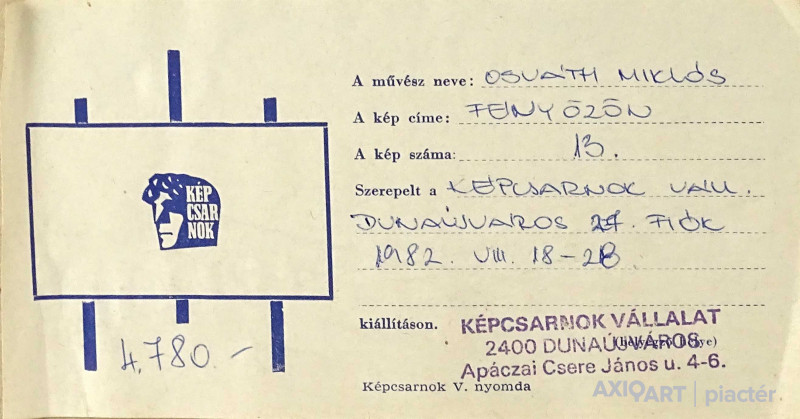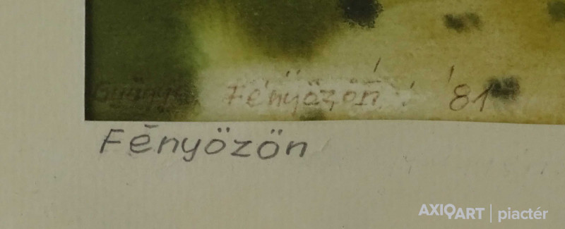 [1Y030/Z036] Papír akvarell, üveglap mögött, natúr léckeretben. Akasztási lehetőséggel rendelkezik. Hátoldalán a Képcsarnok Vállalat papírcímkéje látható. Jelezve jobbra lent: OSVÁTH MIKLÓS A kép címe balra lent: FÉNYÖZÖN '81 Magasság: 86 cm Szélesség: 65 cm Súly: 3.8 kg Osváth Miklós Szeged, 1935 - 2004, Budapest Festő. A budapesti Képző- és Iparművészeti Gimnáziumban tanult Ridovics László, Csebi Pogány István és Ujvári Lajos növendékeként. Ezt követően szabadiskolákban képezte magát tovább. Fischer Ernő volt egyik mestere. A Magyar Képzőművészeti Főiskolán tanult 1957-1962 között. Grafikusként az Állami Könyvterjesztő Vállalatnál dolgozott 1963-78 között, majd a Fővárosi Moziüzemi Vállalatnál volt osztályvezető (1978-1982). Több európai országban járt tanulmányúton, de eljutott Ázsiába és Afrikába is. Főként akvarellfestőként ismert. Hazai egyéni kiállításokon, így Nagyadáton (1981), Nyíregyházán (1982, 1986), Dunaújvárosban (1983), Nagykanizsán (1984), Gyöngyösön (1985) és Budapesten (1987) mutatta be munkáit. Forrás: kieselbach.hu