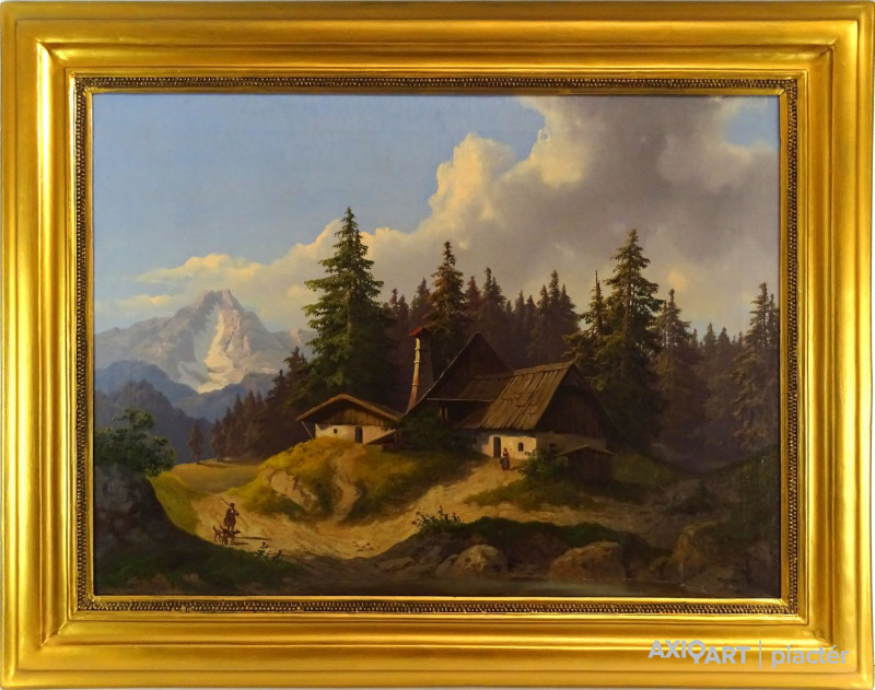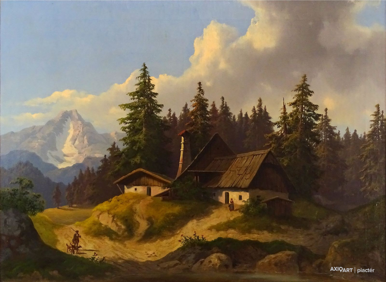 Osztrák festő XIX. század közepe: Menedékház az alpoknál