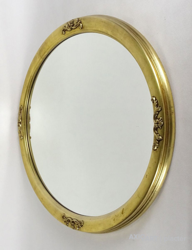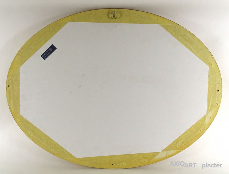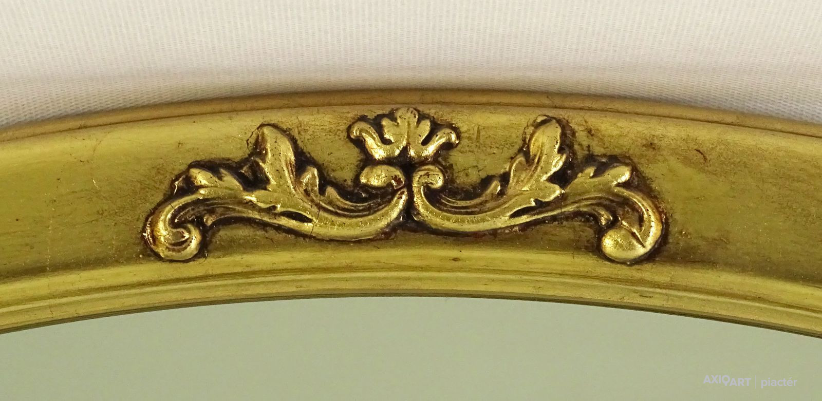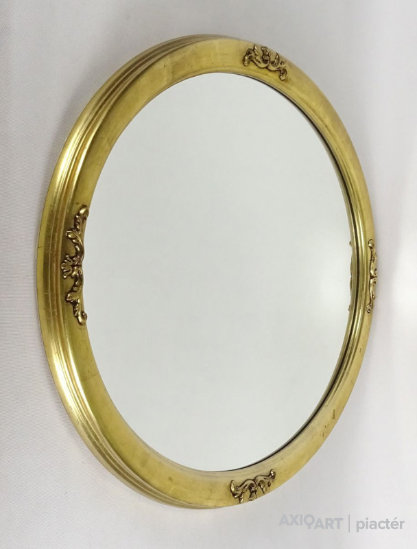 Gyönyörű, aranyozott, ovális alak tükör. Nem antik. Hátoldalán falra akasztási lehetőséggel. Jelenleg az fekvő helyzetben áll a tükör de az akasztó áthelyezhető. Hátoldalán keretezői címke, lásd fotó.