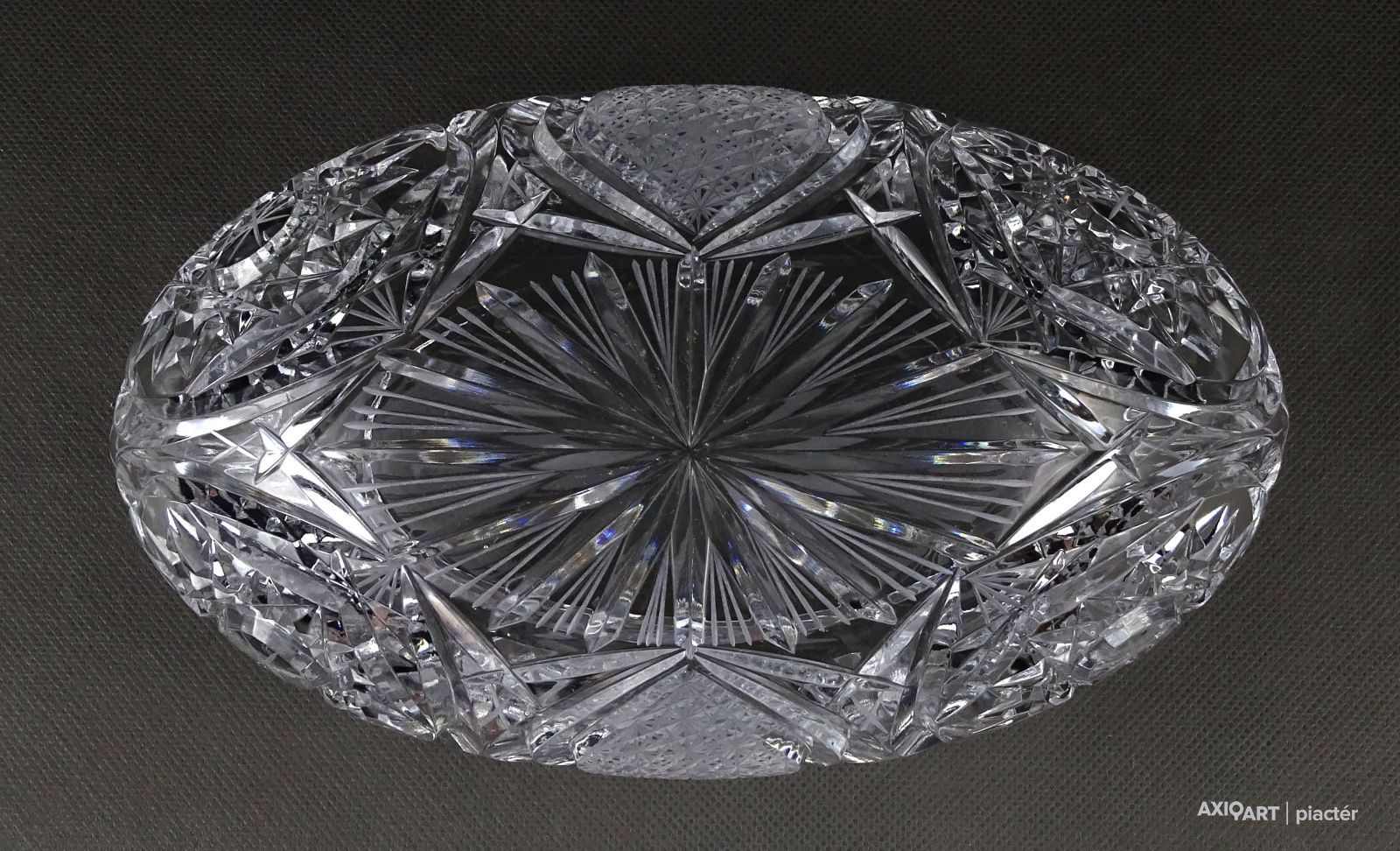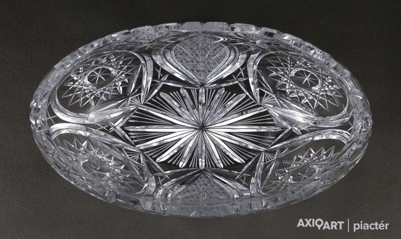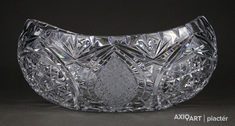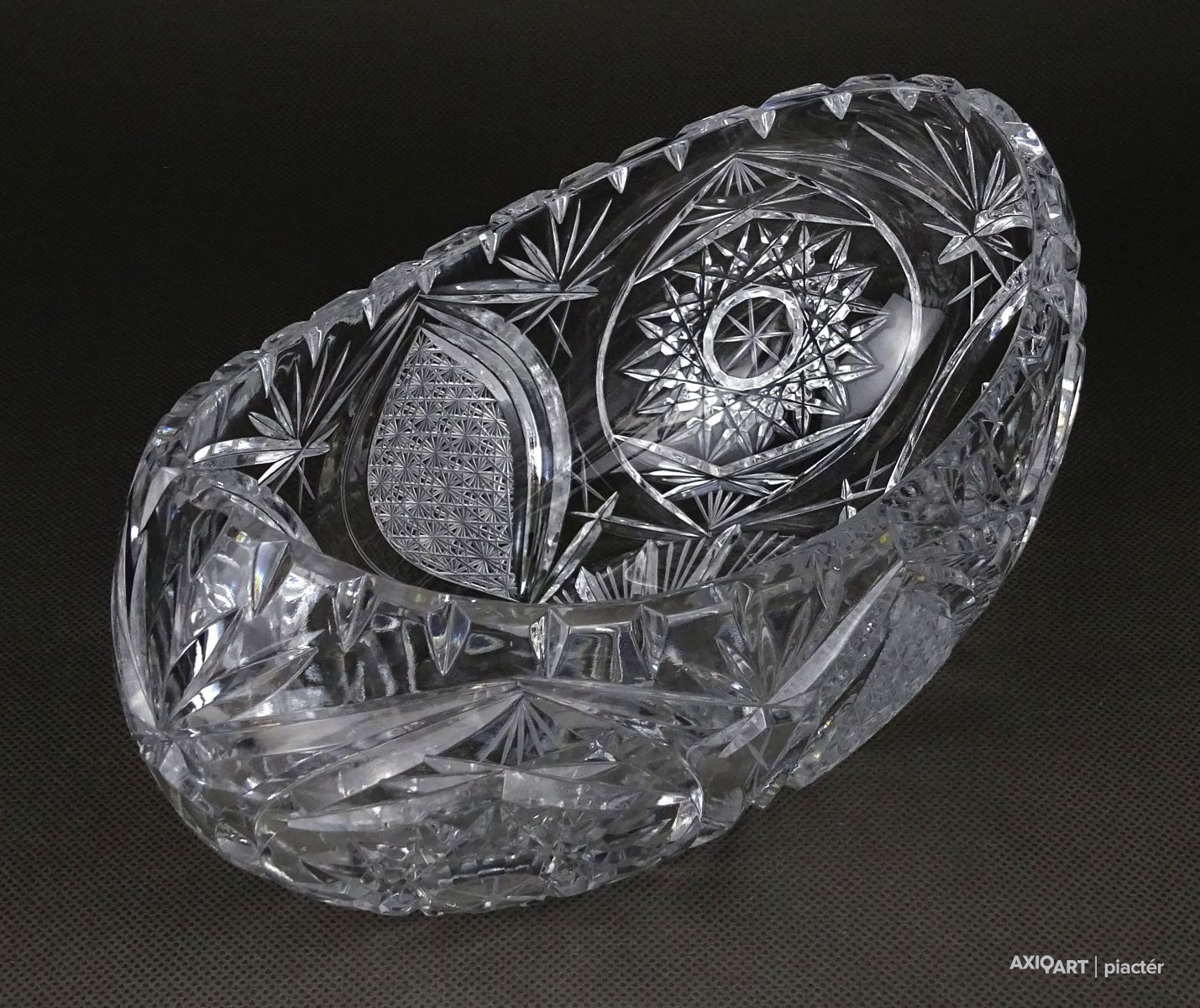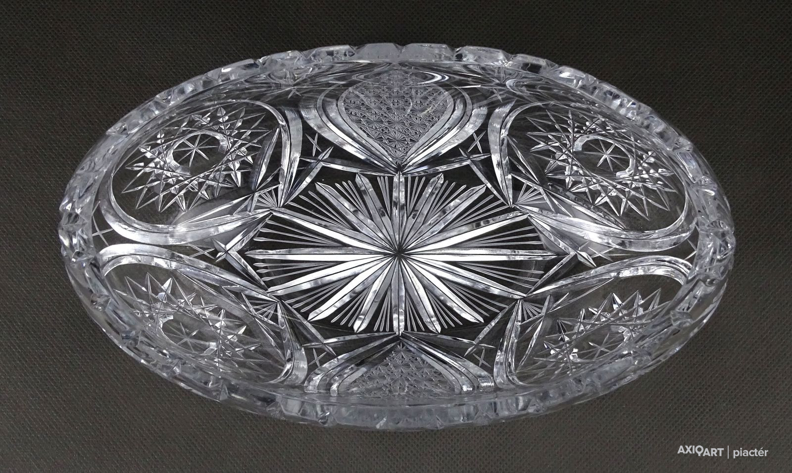 Csiszolatokkal gazdagon díszített, nagy méretű, vastagfalú gyönyörű ovális alakú kristály gyümölcstál, kínáló tál, gyümölcskínáló tál.