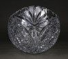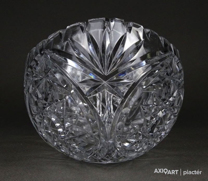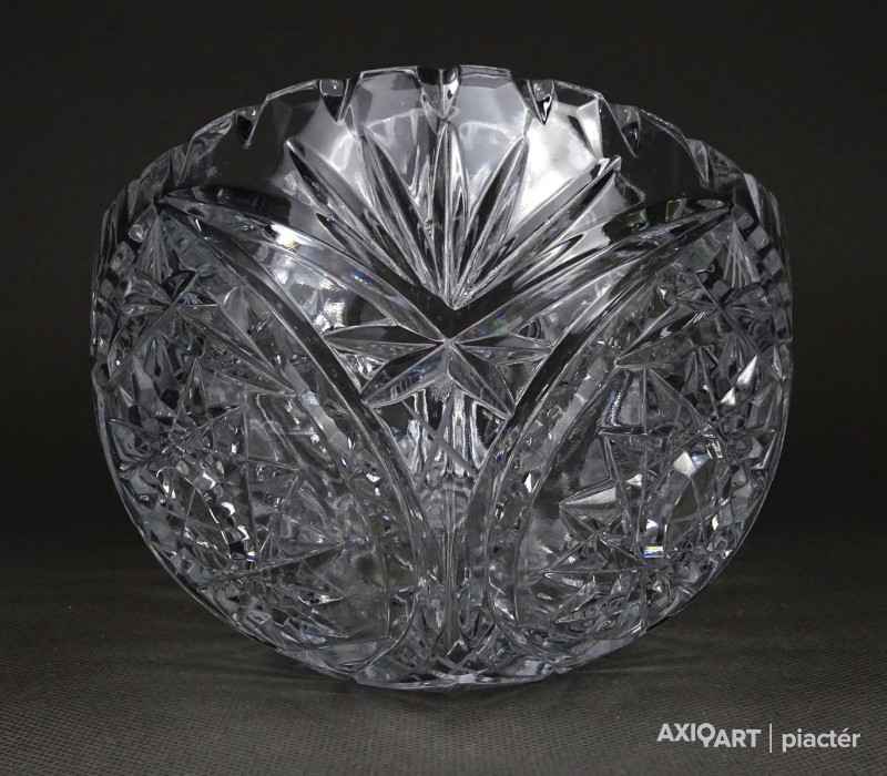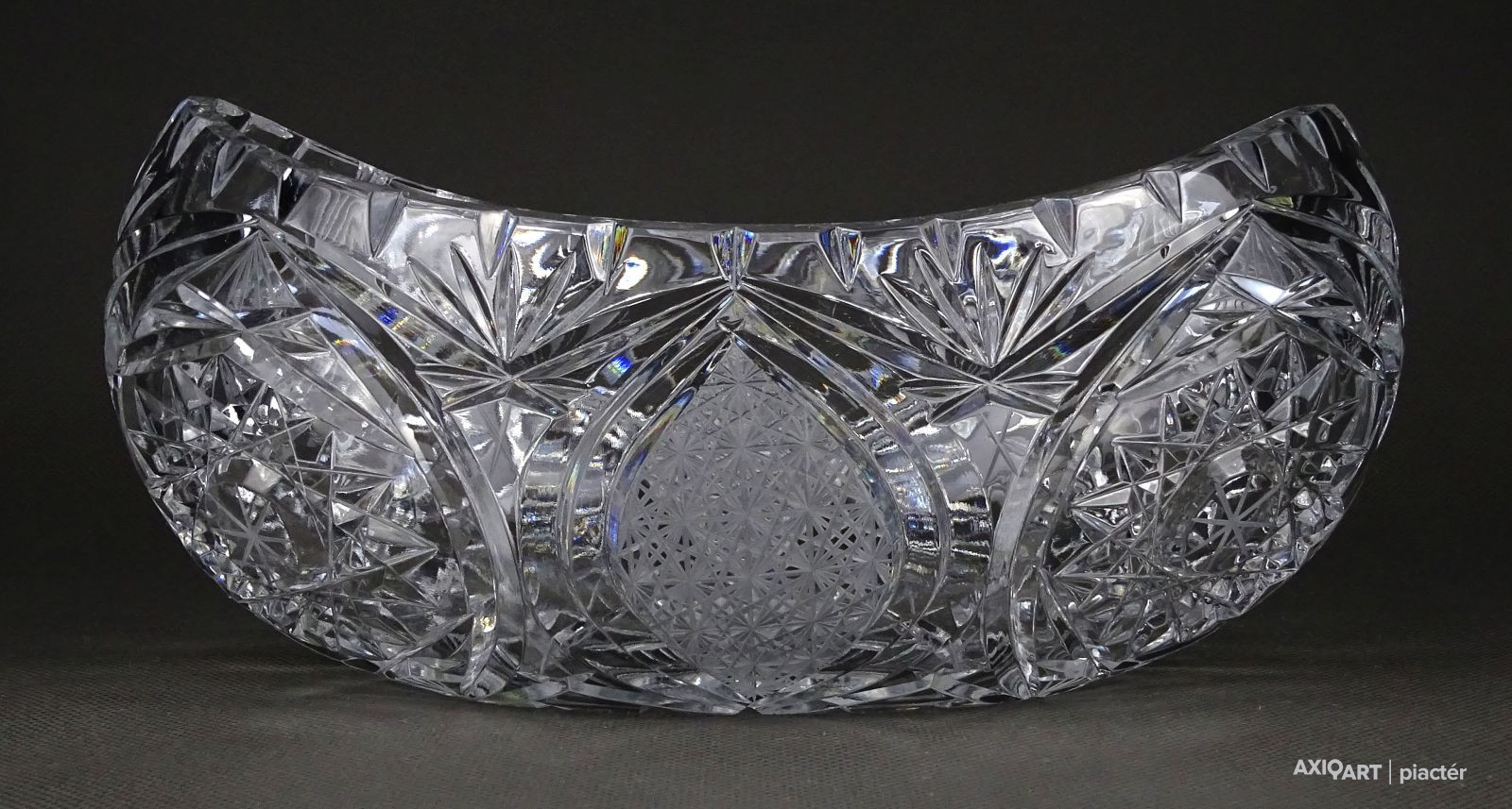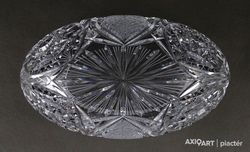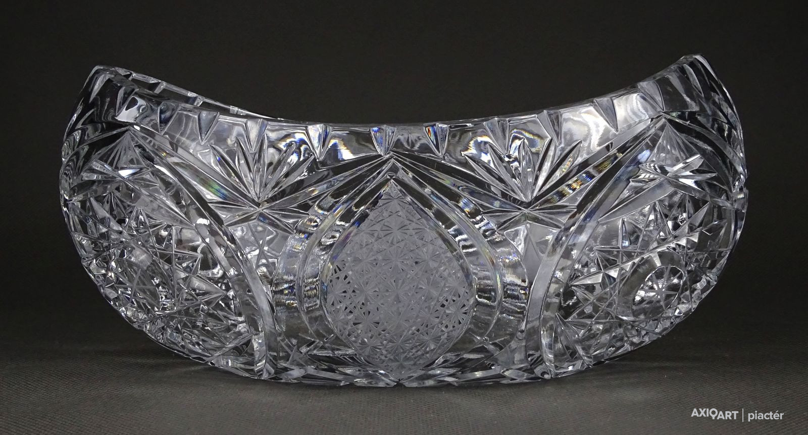 Csiszolatokkal gazdagon díszített, nagy méretű, vastagfalú gyönyörű ovális alakú kristály gyümölcstál, kínáló tál, gyümölcskínáló tál.