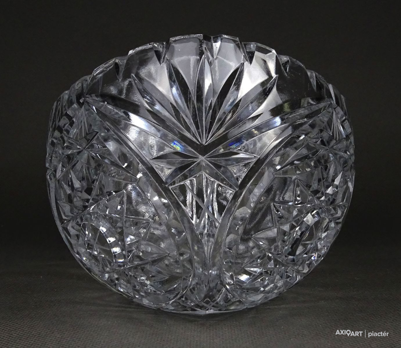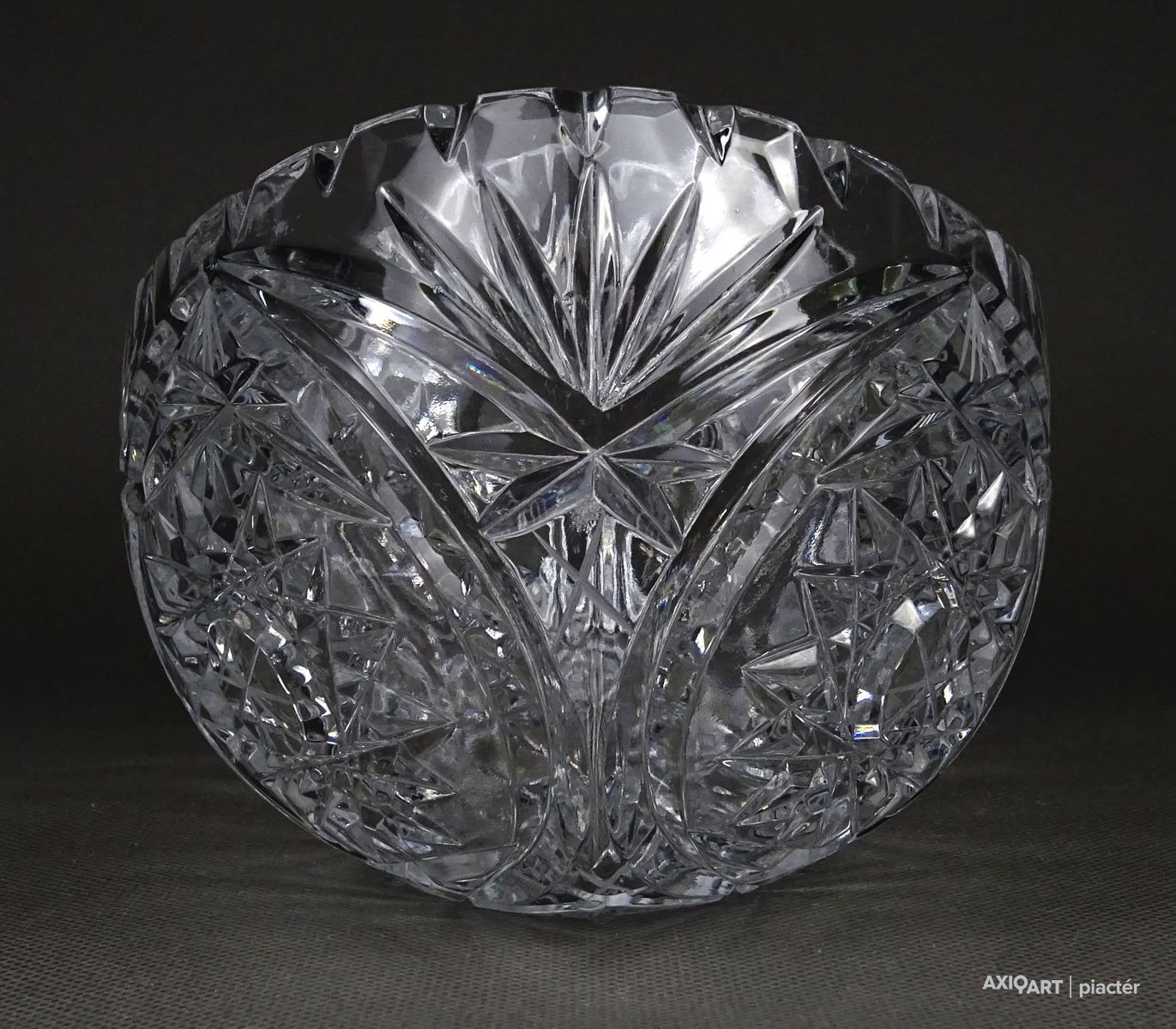 [1P266/X102] Csiszolatokkal gazdagon díszített, nagy méretű, vastagfalú gyönyörű ovális alakú kristály gyümölcstál, kínáló tál, gyümölcskínáló tál. Magasság: 10 cm Szélesség: 12.5 cm Hosszúság: 20.5 cm Súly: 1.08 kg