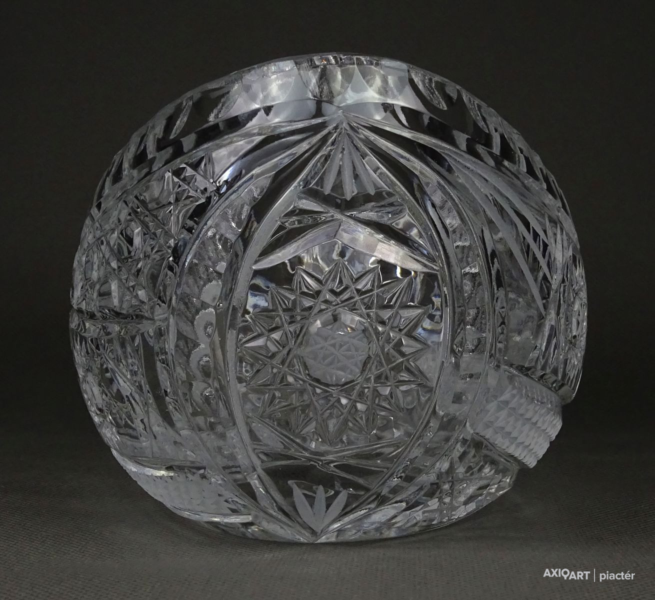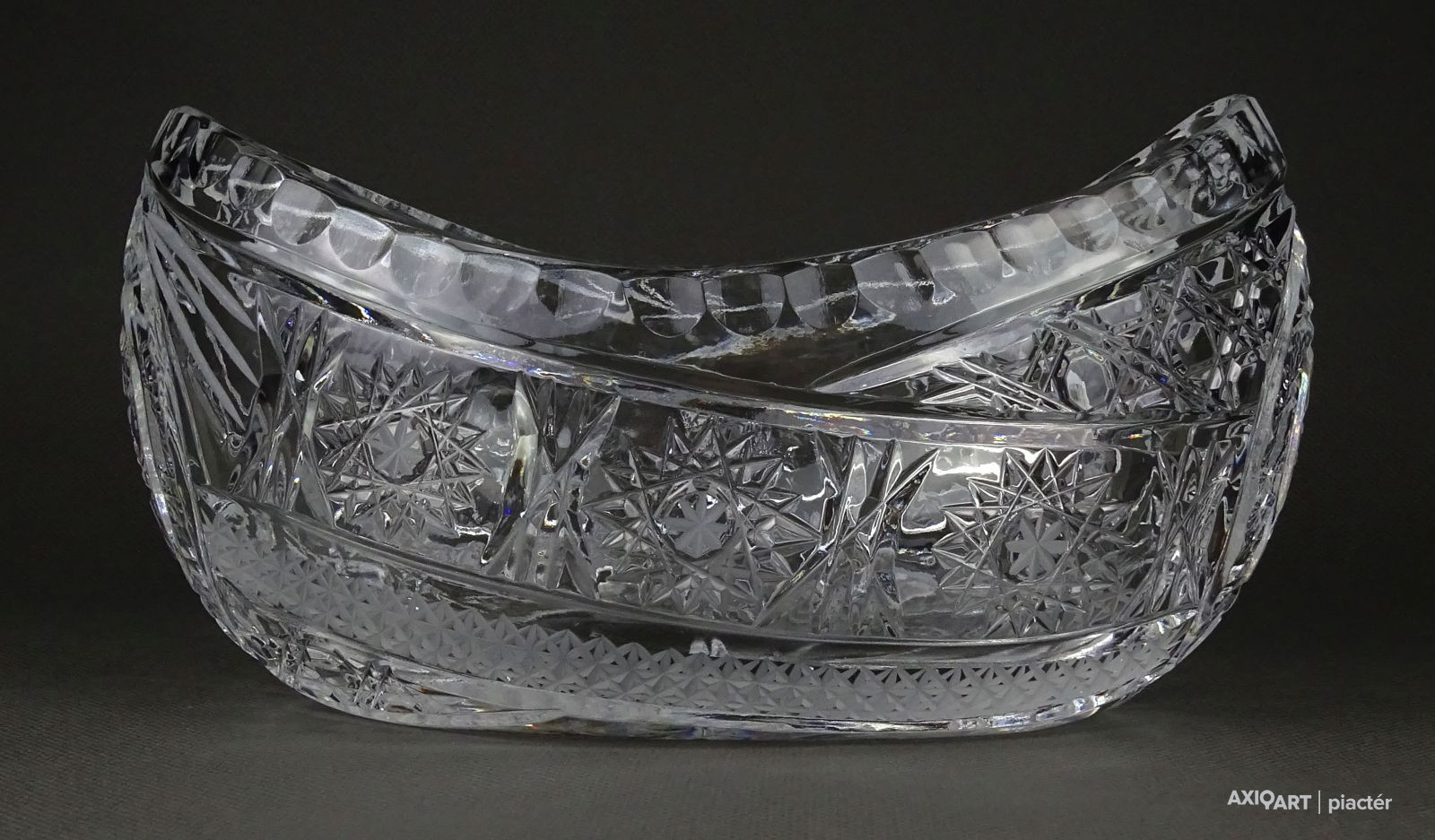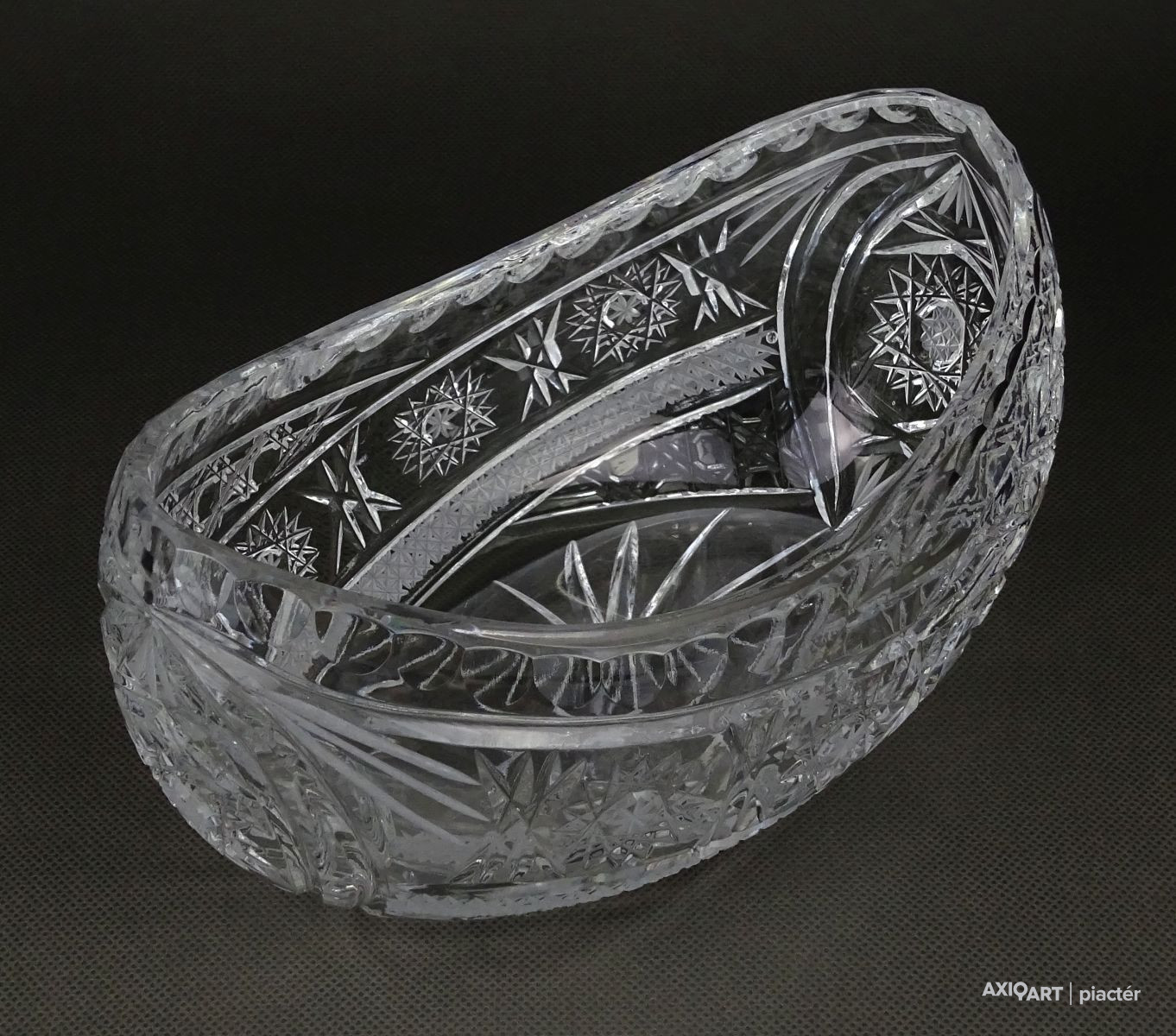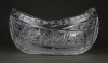 [1P195/X132] Csiszolatokkal gazdagon díszített, nagy méretű, vastagfalú gyönyörű ovális alakú kristály gyümölcstál, kínáló tál, gyümölcskínáló tál. Magasság: 10.5 cm Szélesség: 12.5 cm Hosszúság: 20 cm Súly: 1.535 kg