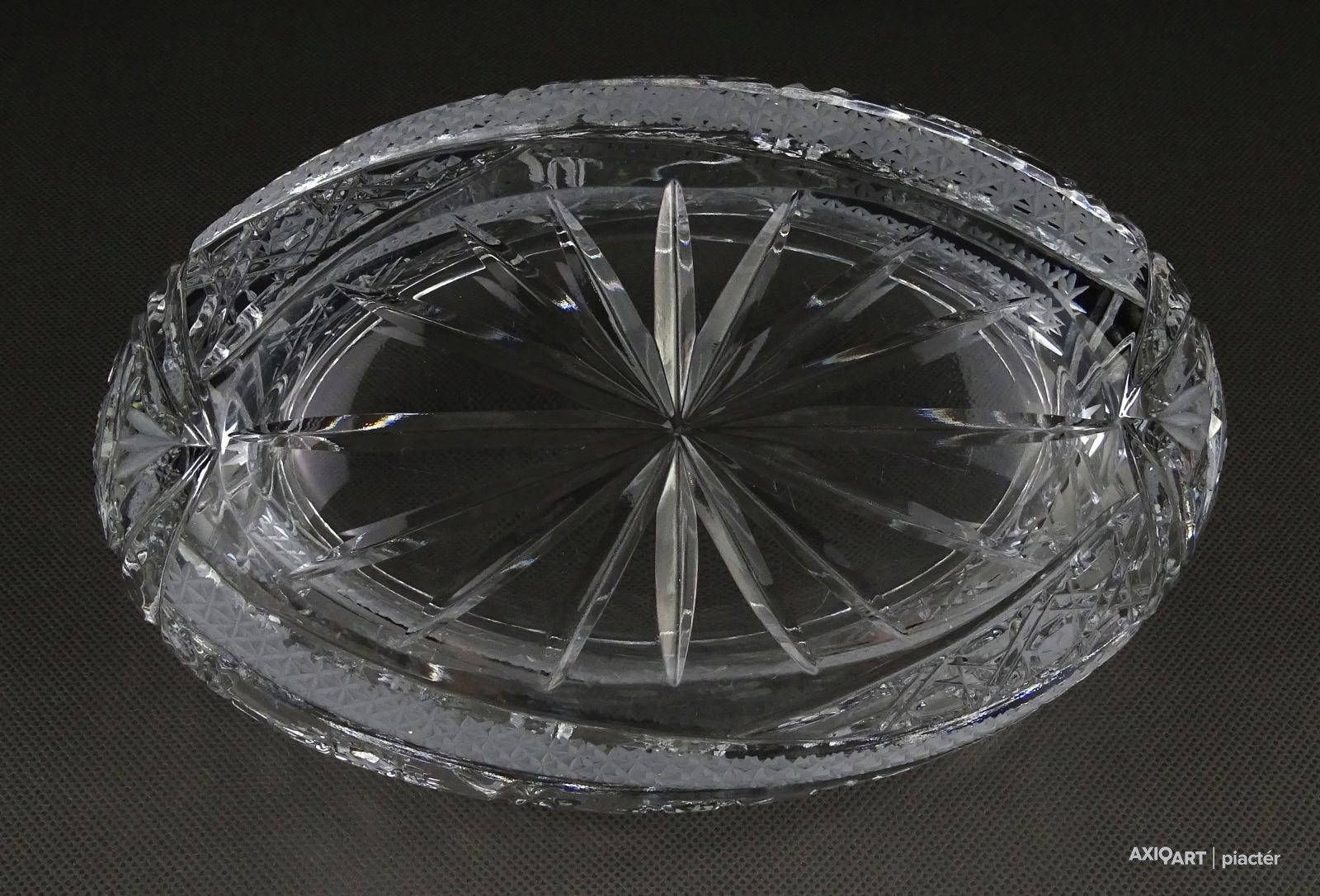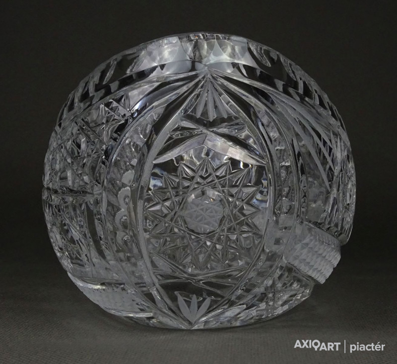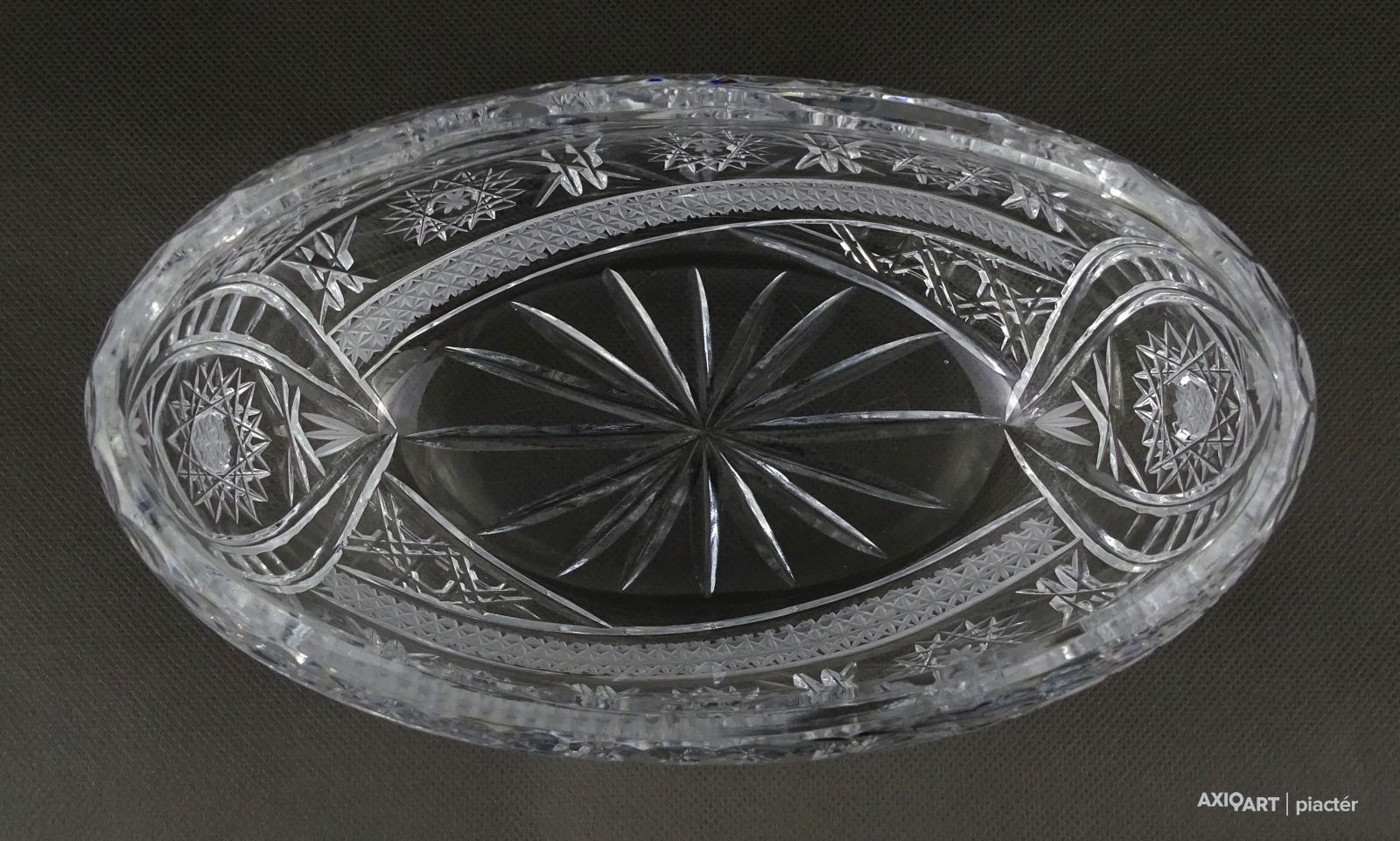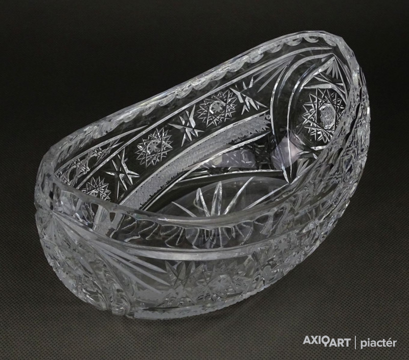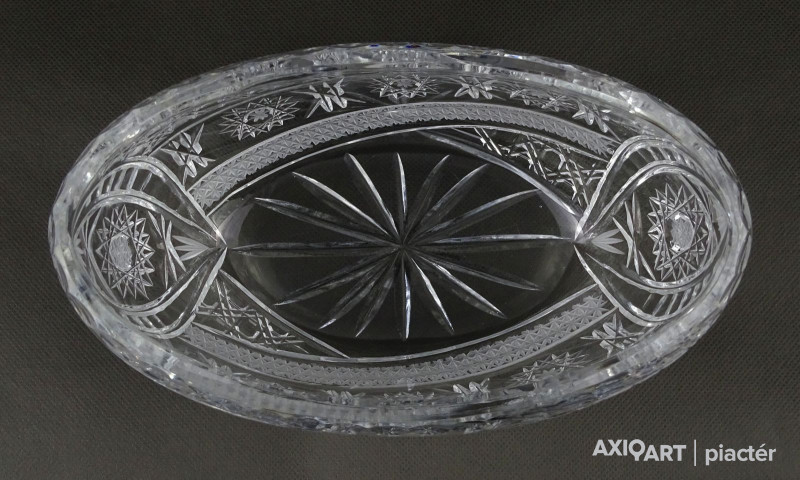Csiszolatokkal gazdagon díszített, nagy méretű, vastagfalú gyönyörű ovális alakú kristály gyümölcstál, kínáló tál, gyümölcskínáló tál.