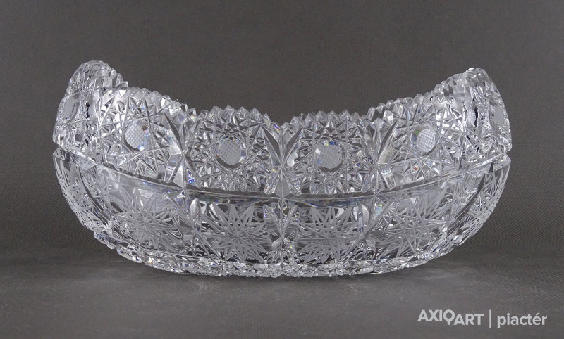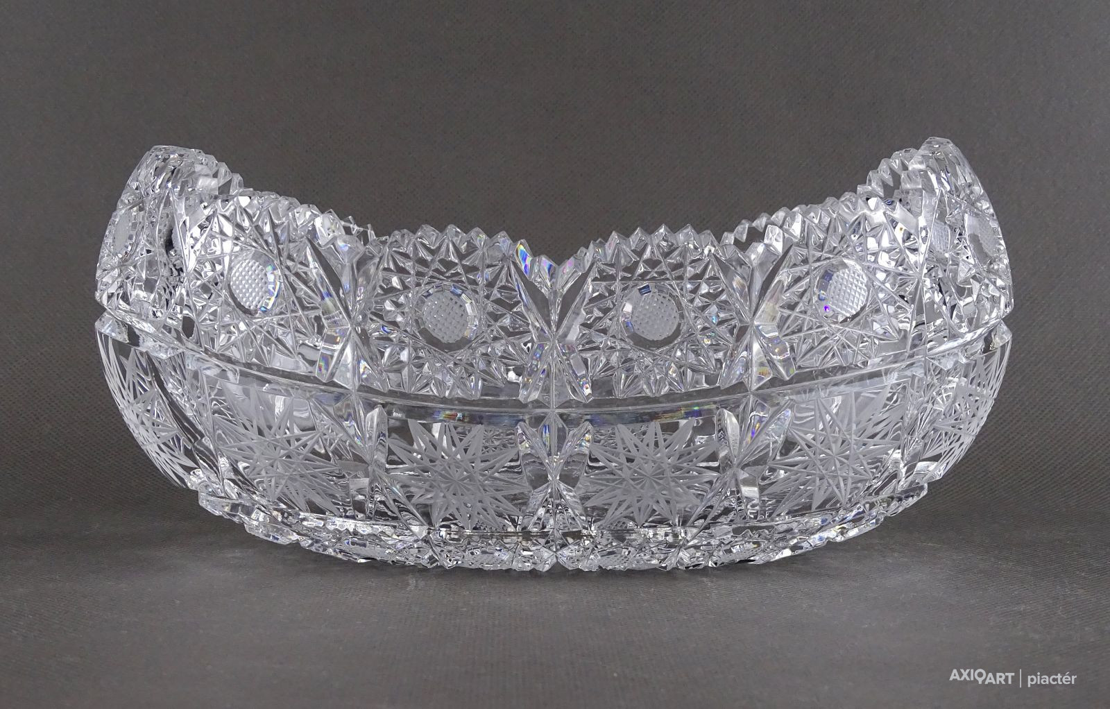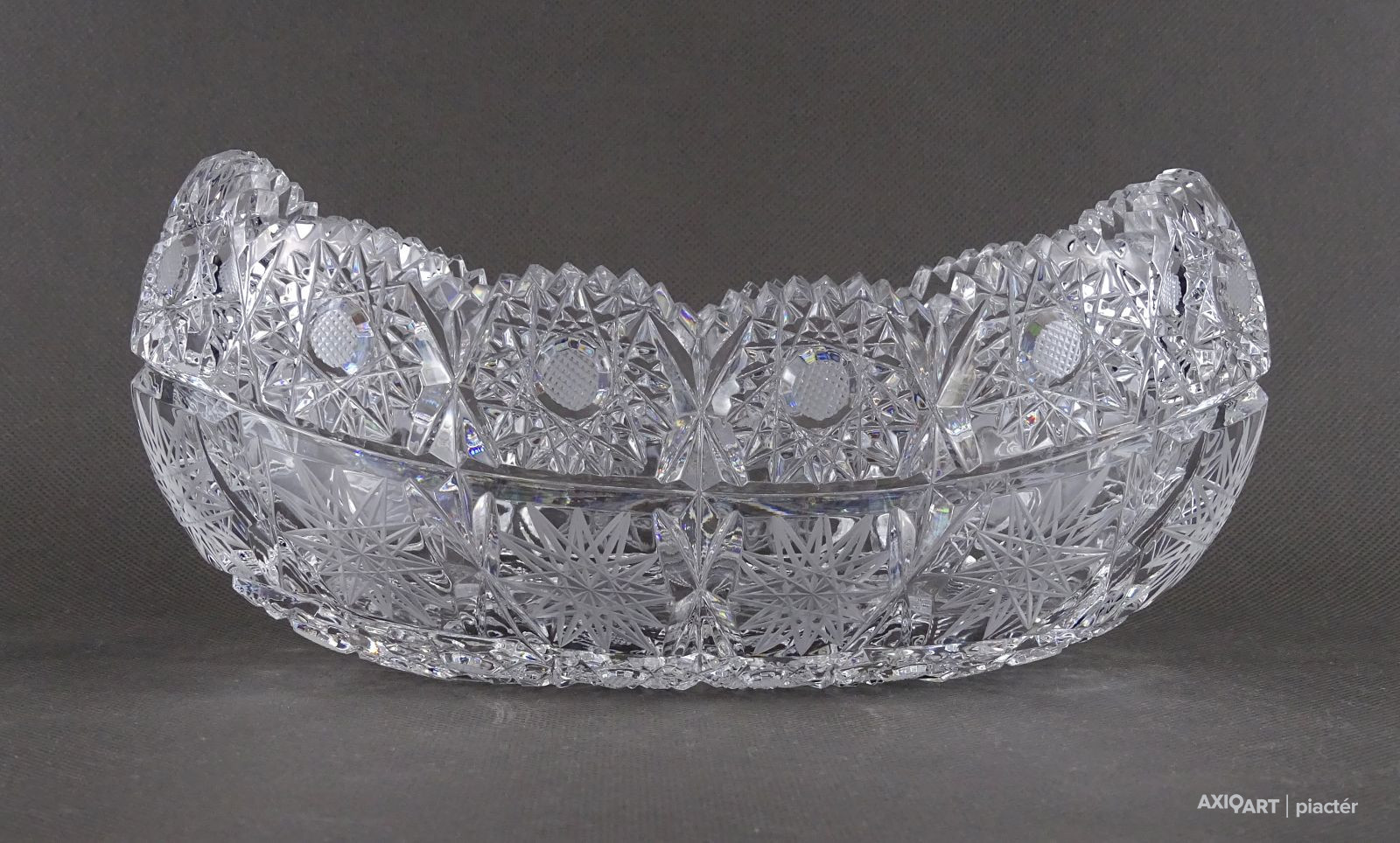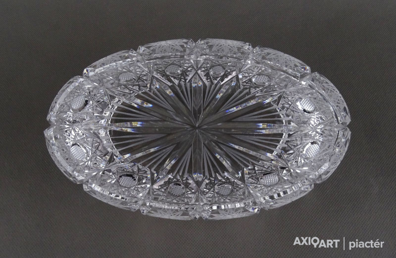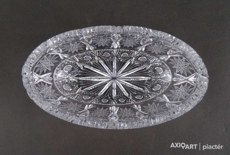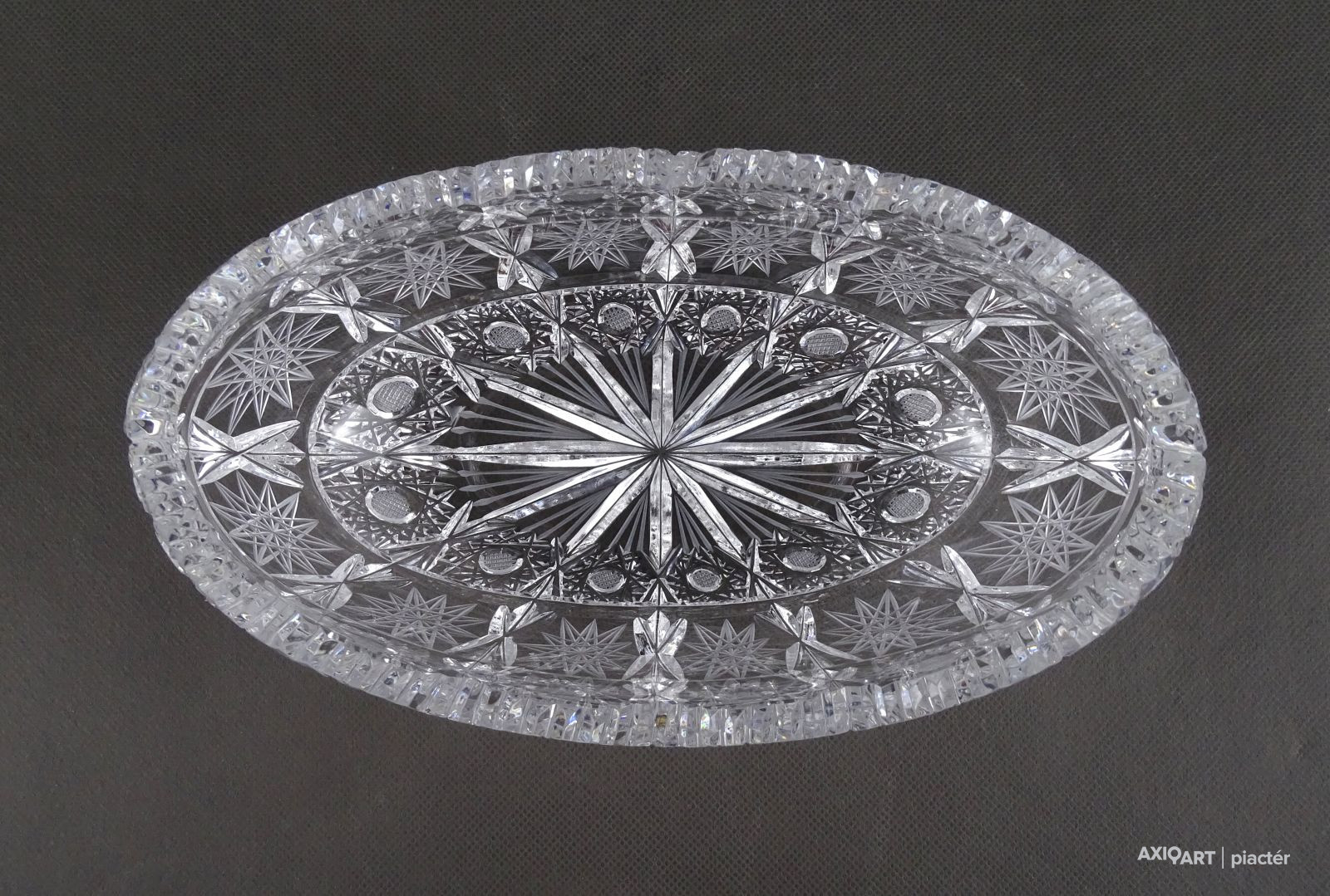 Csiszolatokkal gazdagon díszített, nagyméretű, vastagfalú gyönyörű ovális alakú kristály gyümölcstál, kínáló tál, gyümölcskínáló tál.