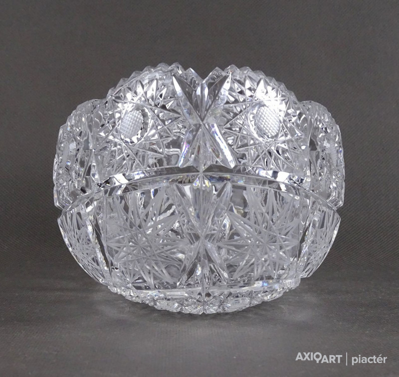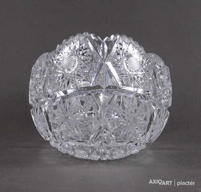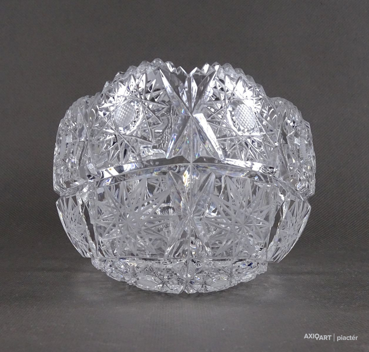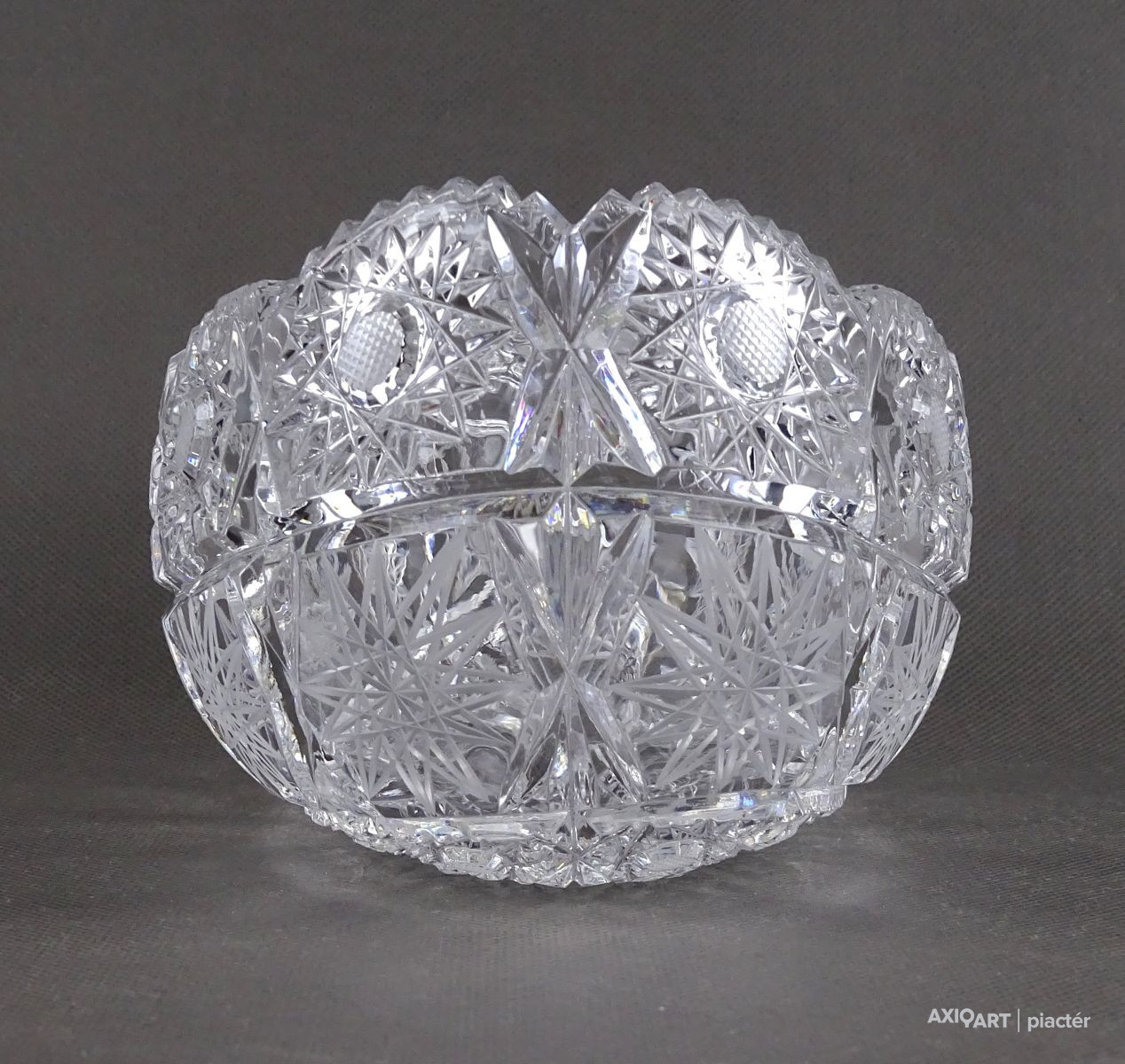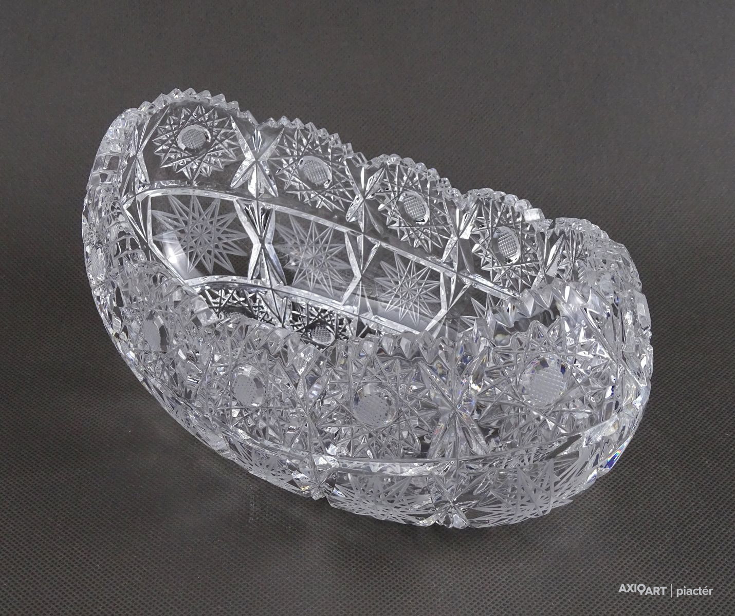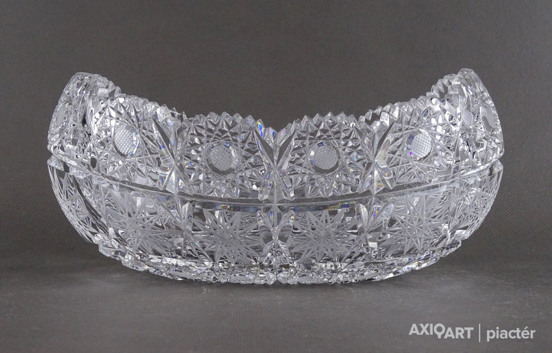 Csiszolatokkal gazdagon díszített, nagyméretű, vastagfalú gyönyörű ovális alakú kristály gyümölcstál, kínáló tál, gyümölcskínáló tál.
