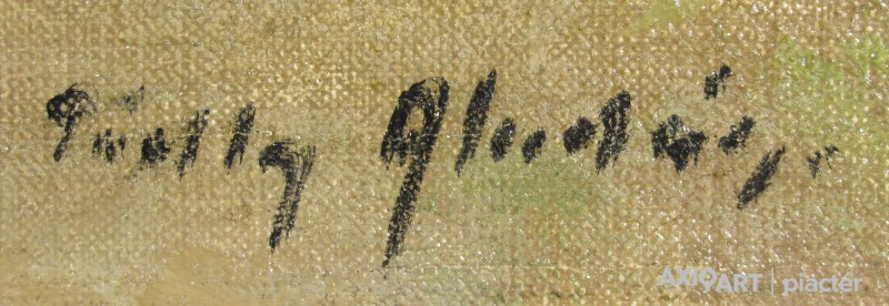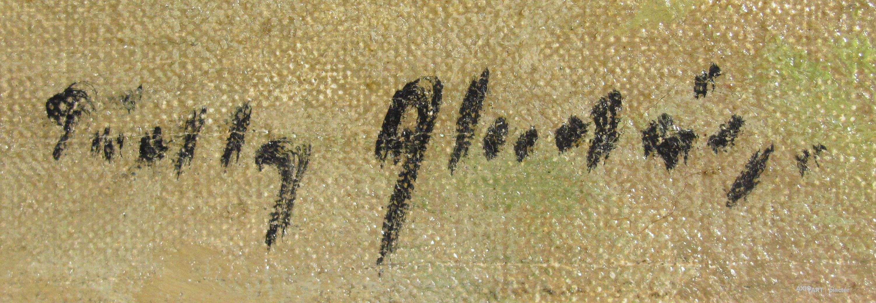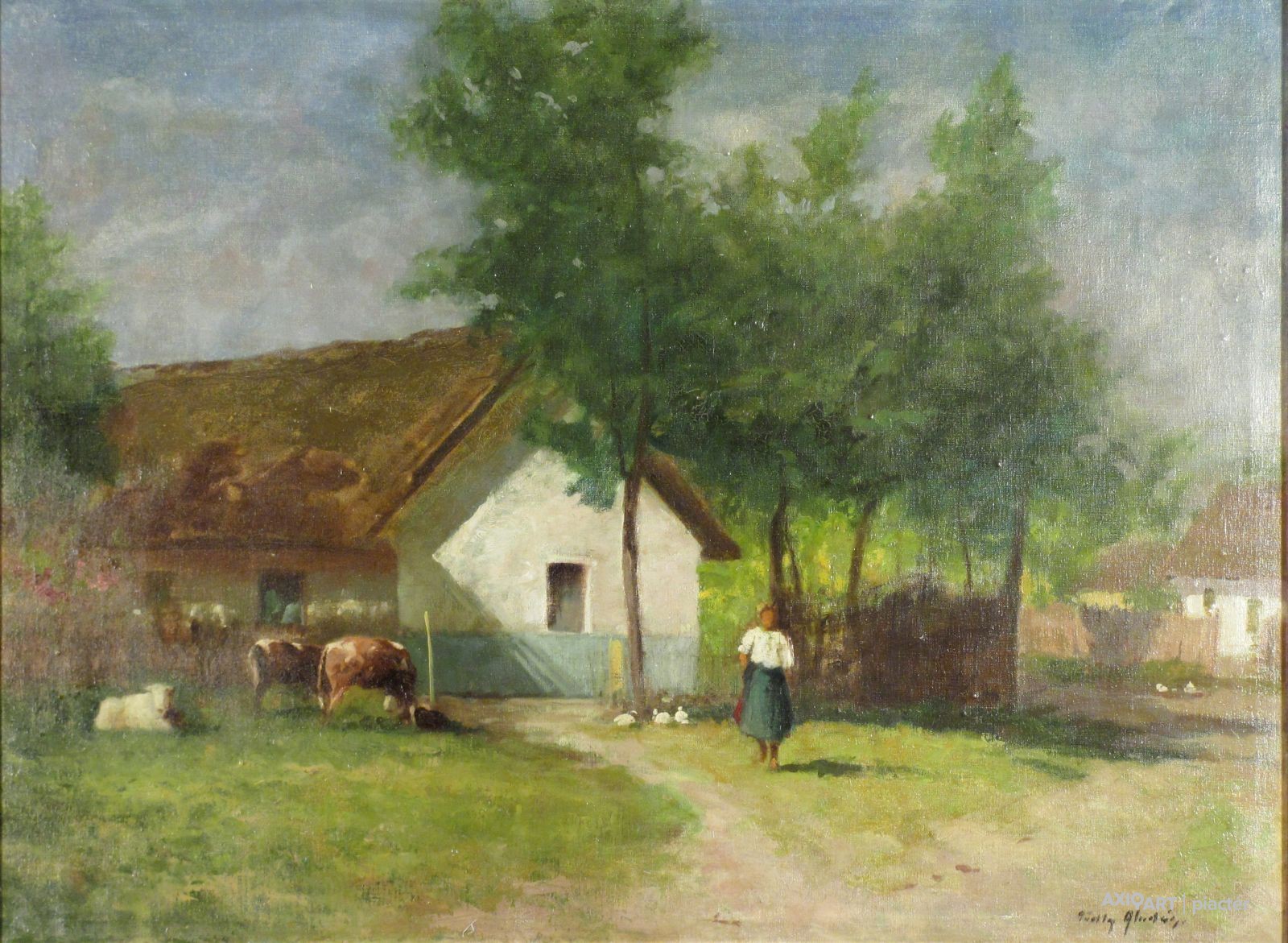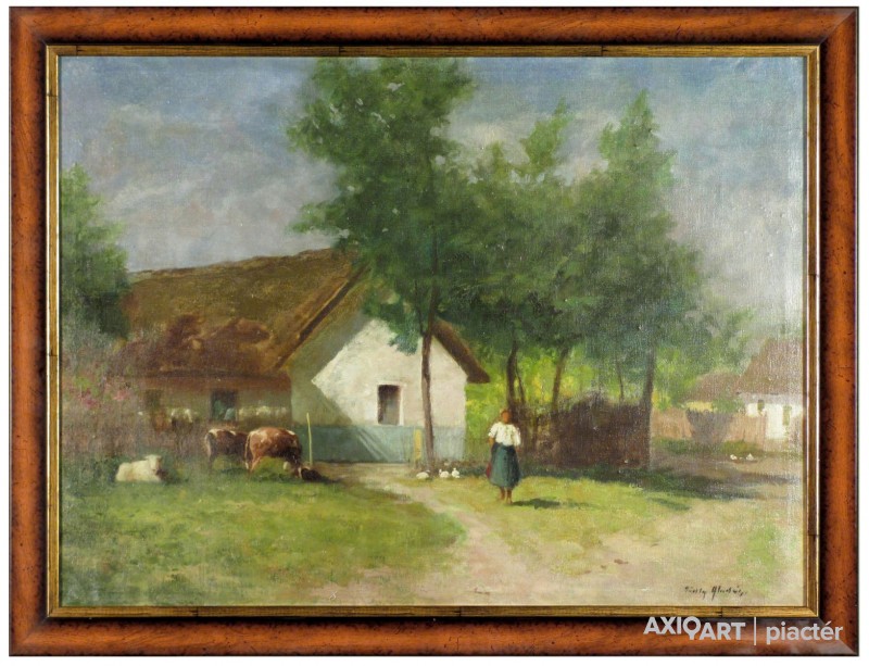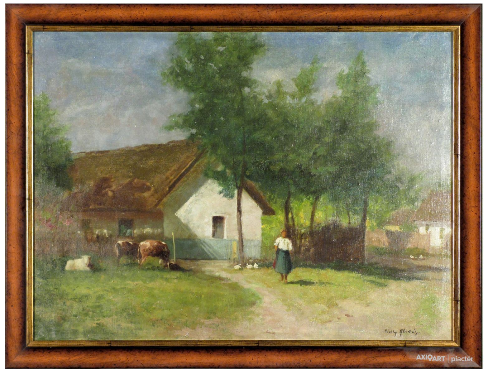 [FKC876/Bp92/46] A kép mérete: 100 x 81 cm keret nélkül. Készült: Olaj, Vászon A kép Ujváry Ignác (Pest, 1860, Kisoroszi, 1927) alkotása. Jelezve balra lent "Újváry I." A festmény jó állapotban van. Keret: Ép Magyar festők és grafikusok életrajzi lexikona I-II. Festő. Budapesten Lotz Károly mellett, a Benczúr-mesteriskolában, majd Münchenben és Párizsban tanult. Eleinte nagyobb kompozíciókkal szerepelt a fővárosi tárlatokon (Szent István szentté avatása), később visszavonulva Kisorosziba, erőteljes, friss tájfestményekkel lépett fel (virágos rét, Eresz alatt, stb.). 1928-ban a Műcsarnokban hagyatéki kiállítást rendeztek műveiből. Tanára volt a budapesti Iparművészeti Iskolának. Több díjat kapott. 1891-ben a Rökk-díjat, 1894-ben a Műbarátok-díját, 1895-ben pedig az Ipoly-díjat nyerte. Tagja volt a Magyar Képzőművészek Egyesületének. Néhány munkája a Magyar Nemzeti Galéria tulajdona. (Éber, ML, VNML) Magyar festők és grafikusok életrajzi lexikona I-II. Műgyűjtők és kereskedők kézikönyve Festő. Budapesten Lotz Károly mellett, a Benczúr-mesteriskolában, Münchenben és Párizsban tanult. Eleinte nagyobb kompozíciókkal szerepelt (Szent István szentté avatása), majd visszavonulván Kisorosziba, erőteljes, friss tájképekkel lépett fel. Tanára volt a fővárosi Iparművészeti Iskolának. 1891-ben Rökk-díjat, 1894-ben a Műbarátok díját, 1895-ben az Ipoly-díjat nyerte. Néhány képe a MNG tulajdona. (Éber) Művészeti lexikon I-II. Festő, szül. Budapest 1860. szept. 20. U. o. végezte tanulmányait s eleinte nagyobb kompozíciókkal szerepelt (Szent István szentté avatása), később visszavonulván Kisorosziba, erőteljes, friss tájképekkel lépett fel (Virágos rét, Eresz alatt). Tanára az Iparművészeti Iskolának. Művészeti lexikon I-IV. Festő. Bp.-en Lotz Károly tanítványaként, majd a Benczúr-mesteriskolában, később Münchenben és Párizsban végezte tanulmányait. Eleinte nagyobb kompozíciókkal szerepelt a bp.-i tárlatokon (Sz. István szentté avatása), később Kisorosziba visszavonulva erőteljes ecsetkezelésű, friss tájképeit állította ki. Több művésszel együtt részt vett a Feszty-körkép festésében. Az Iparművészeti Iskola tanára volt. Számos díjat nyert. Néhány képét a Nemz. Gal. őrzi. 1928-ban a Műcsarnok hagyatéki kiállítást rendezett műveiből. Magyar festők és grafikusok adattára Korai képei nagyobb történelmi kompozíciók, legjobb művei azonban Kisorosziban festett tájai. 1928-ban rendezték meg hagyatéki kiállítását a Műcsarnokban. Zsellérudvar, Őszi est, Hajóépítés a Dunaparton c. munkáit a Magyar Nemzeti Galéria őrzi. - Irod.: Lyka Károly: Ujváry Ignác, Magyar Művészet, 1927.