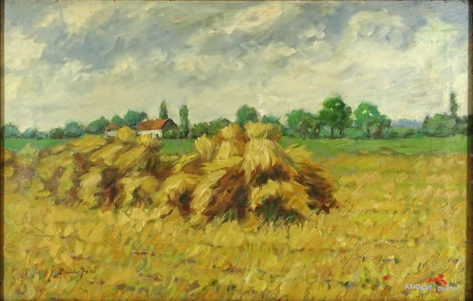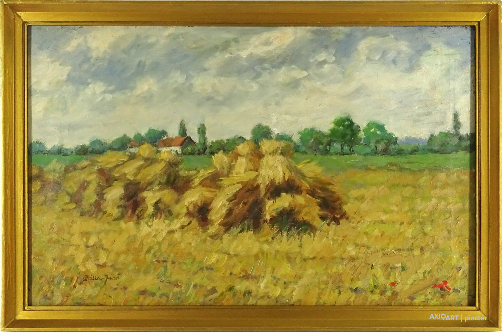 [1Q705/036] Olaj vászon festmény aranyozott keretben. Azonnal falra akasztható állapotban van. Balra lent jelzés: PÁLLA JENŐ Hátoldalán régi címke, rajta felirat: PÁLLA JENŐ BÚZAKERESZT (OLAJ 44 X 68) Magasság: 49.5 cm Szélesség: 73.5 cm Súly: 1.87 kg