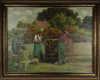 [FK2668/Bp301/4] A kép mérete: 50,5 x 80,5 cm keret nélkül. Készült: Olaj, Vászon A kép Moldován István (Kolozsvár, 1911) alkotása. Jelezve Jobbra lent "Moldován István" A festmény jó állapotban van. Keret: Ép A festmény hátoldalán a Képcsarnokvállalat raglapja láltható. Magyar festők és grafikusok életrajzi lexikona I-II. Festő. Tanulmányait Kolozsvárott, a Szépművészeti Főiskolán kezdte 1930-ban. A következő esztendőben a nagybányai Szépművészeti Iskolában Thorma János és Krizsán János korrektúráján képezte magát. 1931-ben a budapesti Képzőművészeti Főiskola hallgatója lett. Réti István, később Szőnyi István volt a mestere. Már mint főiskolás sok díjat és kitüntetést nyert. 1948-ban megkapta a római ösztöndíjat, de lemondva róla, Erdélybe ment. 1948-1950 között Erdélyben élt, és népművészetben gazdag vidékein festett. 1943-ban Kolozsvárott, 1946-ban Gyöngyösön, 1955-ben, 1959-ben és 1962-ben a Kulturális Kapcsolatok Intézetében, illetve a Csók Galériában rendezett egyéni bemutatókat. Ezen kívül több Európai országban, az USA-ban, Kanadában és Indiában is bemutatta munkáit. Eleinte sajátos atmoszférájú, lírai tájképeket, eleven színvilágú képmásokat festett, később mondernebb, erőteljesebben szerkesztett művekkel jelentkezett. A Pécsi Tanárképző Főiskola számára mozaikot készített. Erdély szerelmese volt. A székely népművészet gazdag formavilágának hatása döntő jelentőségűvé vált sokoldalú művészetében. Műv. díjak: a Szinyei Társaság elismerő oklevele, a Főváros festészeti-díja, "Kolozsvár a képzőművészetben" II. díj, állami ösztöndíj, római ösztöndíj, a Képzőművészek Szövetsége Észak-Magyarországi festészeti díja, SZOT festészeti díj. Több murális művet (mozaik) alkotott. A Magyar Nemzeti Galéria több alkotását őrzi. (M. L.: Műv. 1967/6, RI-NM) Magyar festők és grafikusok életrajzi lexikona I-II. Műgyűjtők és kereskedők kézikönyve Festő. Tanulmányait a kolozsvári Szépművészeti Főiskolán kezdte 1930-ban. A nagybányai szabadiskolában is megfordult. Itt Thorma János és Krizsán János korrektúráján képezte magát. 1931-ben Budapesten a Képzőművészeti Főiskola hallgatója lett. Réti István, később Szőnyi István volt a mestere. Már mint főiskolás sok díjat nyert. 1948-ban megkapta a római ösztöndíjat, de lemondva róla, Erdélybe ment. 1948-1950 k. Erdélyben élt, és népművészetben gazdag vidékein festett. 1943-ban Kolozsváron, 1946-ban Gyöngyösön, 1955-ben, 1959-ben és 1962-ben a Kulturális Kapcsolatok Intézetében, illetve a Csók Galériában rendezett önálló kiállítást. Ezen kívül több Európai országban, az USA-ban, Kanadában és Indiában is bemutatta műveit. Eleinte sajátos atmoszférájú, lírai tájképeket, eleven színvilágú képmásokat festett, később mondernebb, erőteljesebben szerkesztett művekkel jelentkezett. A Pécsi Tanárképző Főiskola számára mozaikot készített. Erdély szerelmese volt. A székely népművészet gazdag formavilágának hatása döntő jelentőségűvé vált sokoldalú művészetében. 1942-ben megkapta a Szinyei Társaság elismerését, és a Főváros festészeti-díjat,1943-ban elnyerte a "Kolozsvár a képzőművészetben" c. díjat. 1947-ben állami ösztöndíjat,1948-ban a római ösztöndíjat, 1972-ben a Képzőművészek Szövetsége Észak-Magyarországi festészeti díját kapta meg. A MNG több művét őrzi. (M. L.: Műv.-1976/6) Magyar festők és grafikusok adattára Tanulmányait Kolozsvárott a Képzőművészeti Főiskolán, majd Nagybányán Thorma János és Krizsán János irányítása mellett kezdte, 1931-től Budapesten megszakításokkal a Képzőművészeti Főiskolán Réti István és Szőnyi István növendékeként fejezte be. 1949-ben és 1950-ben ösztöndíjjal dolgozott Erdélyben, majd hosszú tanulmányutakra indult Nyugat-Európába, az Egyesült Államokba, s a Szovjetunióba. Először Kolozsvárott lépett a nyilvánosság elé 1943-ban, majd 1946-ban Egerben és Gyöngyösön, 1947-ben Miskolcon, 1948-ban Hatvanban, 1955, 1961 és 1981-ben a Csók Galériában, 1959-ben a KKI-ben, 1960-ban Nagykanizsán, 1963-ban Kiskunfélegyházán, 1966-ban Debrecenben, 1969 és 1975-ben Békéscsabán, 1971-ben a Mednyánszky Teremben, 1973-ban Gyöngyösön és Debrecenben, 1977-ben Egerben, 1979-ben Veszprémben, 1983-ban Miskolcon, 1984-ben Csepelen, 1986-ban a Vigadó Galériában rendezett önálló kiállítást. Külföldi kiállításai: Moszkva, Varsó, India, Szófia, Párizs, Bukarest, Belgrád, New York, Montreál és Toronto. Eddig közel kétezer színes táblaképet festett, de szívesen foglalkozik mozaikkészítéssel is. 1964-ben a Pécsi Pedagógiai Főiskola, 1968-ban a Salgótarjáni Kórház, 1969-ben a názáreti templom és 1970-ben a Videoton Vállalat díszterme részére mozaikot készített. - Erdély szerelmese. A székely népművészet gazdag formavilágának hatása döntő jelentőségűvé vált festészetében. Olyan formanyelvet alakított ki magának, amely színvilágában és summázó formaalakításában sajátos erdélyi zamat érződik, ugyanakkor korszerűen modern is konstruktivista stílusa. Munkásságát 1942-ben a Szinyei Társaság elismerésével és a Fővárosi festészeti-díjjal, 1943-ben Római-ösztöndíjjal, 1947-ben Állam ösztöndíjjal (Románai), 1963-ben a SZOT festészeti-díjával, 1972-ben a Képzőművészek Szövetsége Észak-Magyarországi festészeti-díjával tüntették ki. - Irod.: Bíró Béla: Kolozsváry Moldován István. Erdélyi Helikon, 1943.; Felvinczi Takács Zoltán: Kolozsváry Moldován István. Kolozsvár, 1943.; Dutka Mária: Magyar Nemzet, 1961.; Maksay László: Moldován István. Művészet, 1965.; D. Fehér Zsuzsa. Moldován István, Bp. 1971.; Theisler G