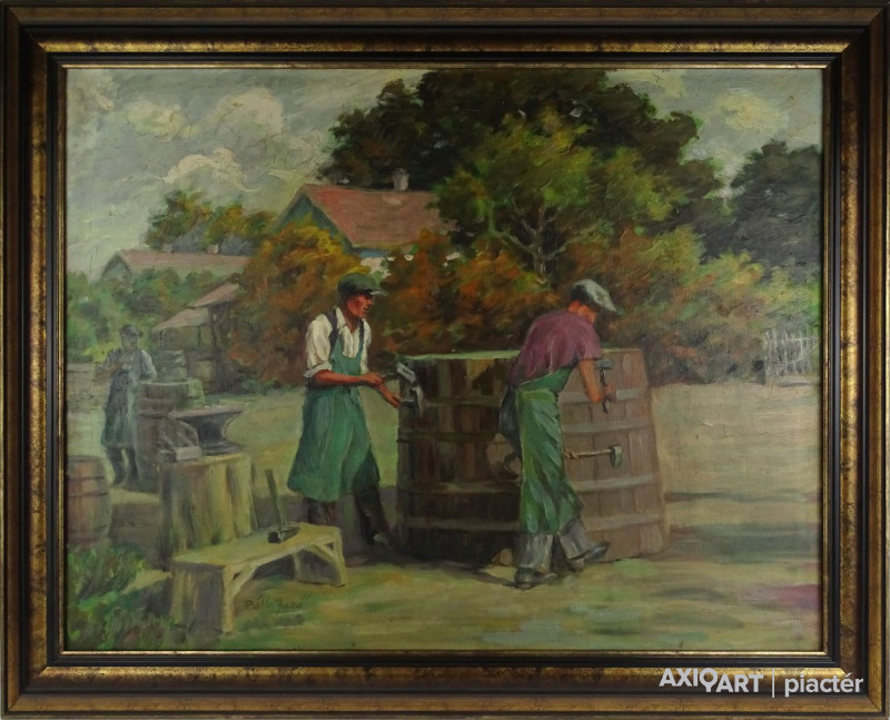 [FK0037/Z018] A kép mérete: 50 x 70 cm keret nélkül. Készült: Olaj, Vászon A kép Paizs László (Szentpéterúr, 1935) alkotása. Jelezve Jobbra lent "P. L." A festmény jó állapotban van. Keret: Ép A festmény hátoldalán a Képcsarnokvállalat címkéje található. Magyar festők és grafikusok életrajzi lexikona I-II. Festő. Tanulmányait a budapesti Iparművészeti Főiskolán végezte 1959-ben. Z. Gács György, Rákosy Zoltán és Szentiványi Lajos növendéke volt. A '60-as évek első felében hagyományosabb felfogású olajképeket festett, mozaikokat, freskókat, utóbb a pop-art körébe tartozó, a francia Arman munkáival rokon műveket alkotott. 1961 óta kiállító művész. Egyéni (Fényes Adolf Terem, Csók Galéria, Műcsarnok, Magyar Nemzeti Galéria, Halászbástya, Bástya Galéria, Vigadó Galéria, Budapest Galéria, Győr, Szombathely, Szeged, Zalaegerszeg, Duisburg, Aix-en-Provence, stb). és vegyes (Ernst Múzeum, Műcsarnok, Óbuda Galéria, Magyar Nemzeti Galéria, Csók Galéria, Vigadó Galéria, Székesfehérvár, Kaposvár, Pécs, Hódmezővásárhely, Firenze, Milano, Padova, Nápoly, Velence, Düsseldorf, Aachen, Genf, stb) tárlatokon vett részt. 1980-ban Munkácsy-díjjal jutalmazták, 1988-ban Érdemes Művész kitüntető elismerésben részesült. Munkáit őrzi a Magyar Nemzeti Galéria, a Fővárosi Képtár, a szombathelyi képtár, a pécsi Janus P. Múzeum, a székesfehérvári István Király Múzeum és a dunaszerdahelyi Kortárs Magyar Galéria. (H.B.: Műv, 1972/4, K.Gy.: Műv. 1977/2, K.G.: Műv. 1978/10, M.L.: Műv, 1983/5, R.G.: Műv, 1987/9, Sz.Gy.: Új Műv. 1995/4, MK) Magyar festők és grafikusok életrajzi lexikona I-II. Műgyűjtők és kereskedők kézikönyve Festő. Tanulmányait a bp.-i Iparművészeti Főiskolán végezte. Mozaikokat ferskókat, utóbb a pop-art körébe tartozó, a francia Arman műveivel rokon műveket alkotott. Mozaikok: a Szegedi Megyei Tanács, a Pécsi Óvoda, a Gödöllői Agrártudományi Egyetem. Freskók: Budapest - Csatárka úti Gyermekotthon. 1971-ben a Fényes Adolf Teremben volt kiállítása, 1983-ban pedig a szegedi Móra Ferenc Múzeumban nagyszabású tárlatokon mutatta be munkáit. 1988-ban érdemes művész kitüntető elismerésben részesült. (MK) Magyar festők és grafikusok adattára Az Iparművészeti Főiskolán végzett 1959-ben. Mozaikokat (Szeged, Megyei Tanács; Pécs, Óvoda; Gödöllő, Agrártudományi Egyetem), freskókat (Budapest, Csatárka úti Gyermekotthon), újabban a pop art körébe tartozó, a francia Arman műveivel rokon műveket alkotott. 1971-ben a Fényes Adolf Teremben nyílt kiállítása. 1983 februárjában a szegedi Móra Ferenc Múzeumban megrendezett nagyszabású tárlaton mutatta be alkotásait. 1988-ban érdemes művész kitüntető elismerésben részesült. - MK Művészeti lexikon I-IV. (Szentpéterur, 1935. dec. 26.- ): festő. Az Iparművészeti Főiskolán 1959-ben végzett Rákosy Zoltán, Z. Gách György és Szentiványi Lajos növendékeként. Épületdiszítő mozaikokat, (Szeged, Megyei Tanács, 1961; Pécs, Óvoda, 1964), műanyagfreskókat (Bp., Csatárka úti Gyermekotthon, 1964) és gobelinterveket készít. Kortárs magyar művészeti lexikon I-III. Festő, szobrász, grafikus. 1959: MIF, mesterei: Z. Gács György, Rákosy Zoltán, Szentiványi Lajos. 1980: Munkácsy-díj; 1988: érdemes művész. Főiskolás éveinek második felében, majd azt követően számos murális munka kivitelezésében vett részt, Fónyi Géza, Konecsni György, Z. Gács György, Rákosi Zoltán és Domanovszky Endre mellett dolgozva. A 60-as évek első felének hagyományosabb fölfogású olajképeket festett. 1964-ben a Velencei B.-n megismerkedett az amerikai pavilonban a pop art Európában akkor még újnak számító törekvésével, és részben ez inspirálta, hogy 1967-ben textil, fém, bőr anyagú "varrottas" képeket küldjön az FKS éves tárlatára; a megnyitó előtt többek között az ő munkáit is eltávolították a falról. A 70-es években pop art-os objekteket (A trónörököspár politikai gyilkosság áldozata lett, 1970, plexiüveg, újság, szarvasbogarak), majd konstruktív, átlátszó plexiüveg plasztikákat készített belső fénytörő határfelületekkel. A 80-as években készültek az anyagában színezett, konstruktív, nagyméretű poliészter szobrai, majd színes poliészter táblaképeket alkotott, mesterségesen roncsolt felületekkel, mintha régészeti leletek vagy atomtámadás utáni festmény-szurrogátumok lennének. Ekkor kezdett organikus plaszikájú bronzszobrokat is mintázni. A 90-es években, a táblaképek és szobrok mellett nagyméretű, egyedi grafikákat készített, formavilágában némileg a roncsolt táblaképekből kiindulva, de szinte kizárólag az emberi alakból elvonatkoztatott torzókat megjelenítve. Ek: 1966: Művészklub, Győr; 1971: Fényes A. T.; 1972: Bercsényi 28-30 G.; 1973: BME B-épület; 1976: Csók G.; 1977: G. Hildebrandt, Duisburg (NSZK); 1979: Bástya G., Halászbástya; Helyőrségi Műv. H., Nagyatád; József A. Műv. Közp., Szeged; Göcsej M., Zalaegerszeg; 1982: Bezzegh G., Küsnacht (CH); 1983: Móra F. M., Szeged; 1987: Műcsarnok (kat.); MNG; 1988: Pandora G., Badacsonytomaj; 1989: Parktheatter, Iserlohn (NSZK); Qualitas G.; Hevesi S. Színház, Zalaegerszeg; 1990: Vasarely Fondation (Ferdinánd Judittal, Fóth Ernővel), Aix-en-Provence (FR); 1994: Vigadó G.; 1997: Pest Center G.; 1998: Budapest G. (kat.); 1999: Pest Center G. (kat); G. Arcis, Sárvár; MMA, Bp.; 2001: SZK, Szhely; Ernst M. (kat.) Vcsk: 1961, 1964, 1966: FKS, Ernst M.; 1962: 9. Magyar Képzőműv. kiállítás, Műcsarnok; 1967: Mai magyar festészet, Új-Delhi; 1969: Vas megyei művészek, Savaria M., Szhely; V. Orsz. Grafikai B., Miskolc; 1971: Új művek, Műcsarnok; 1972: Fiatal művészek Budapestről. Likovni Salon, Újvidék (YU); 1972, 1973: Balatonboglár