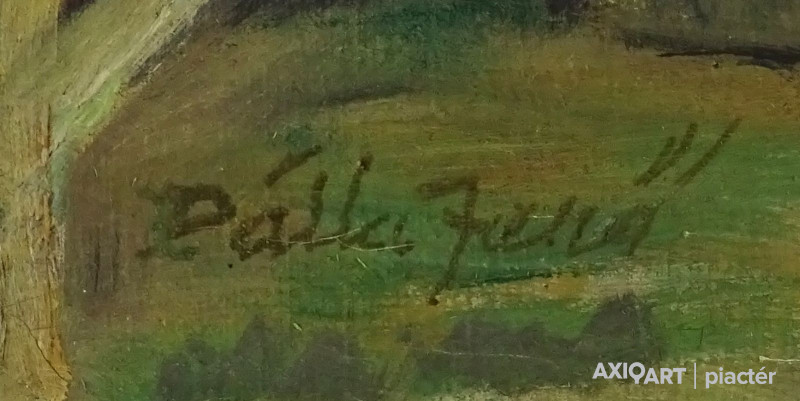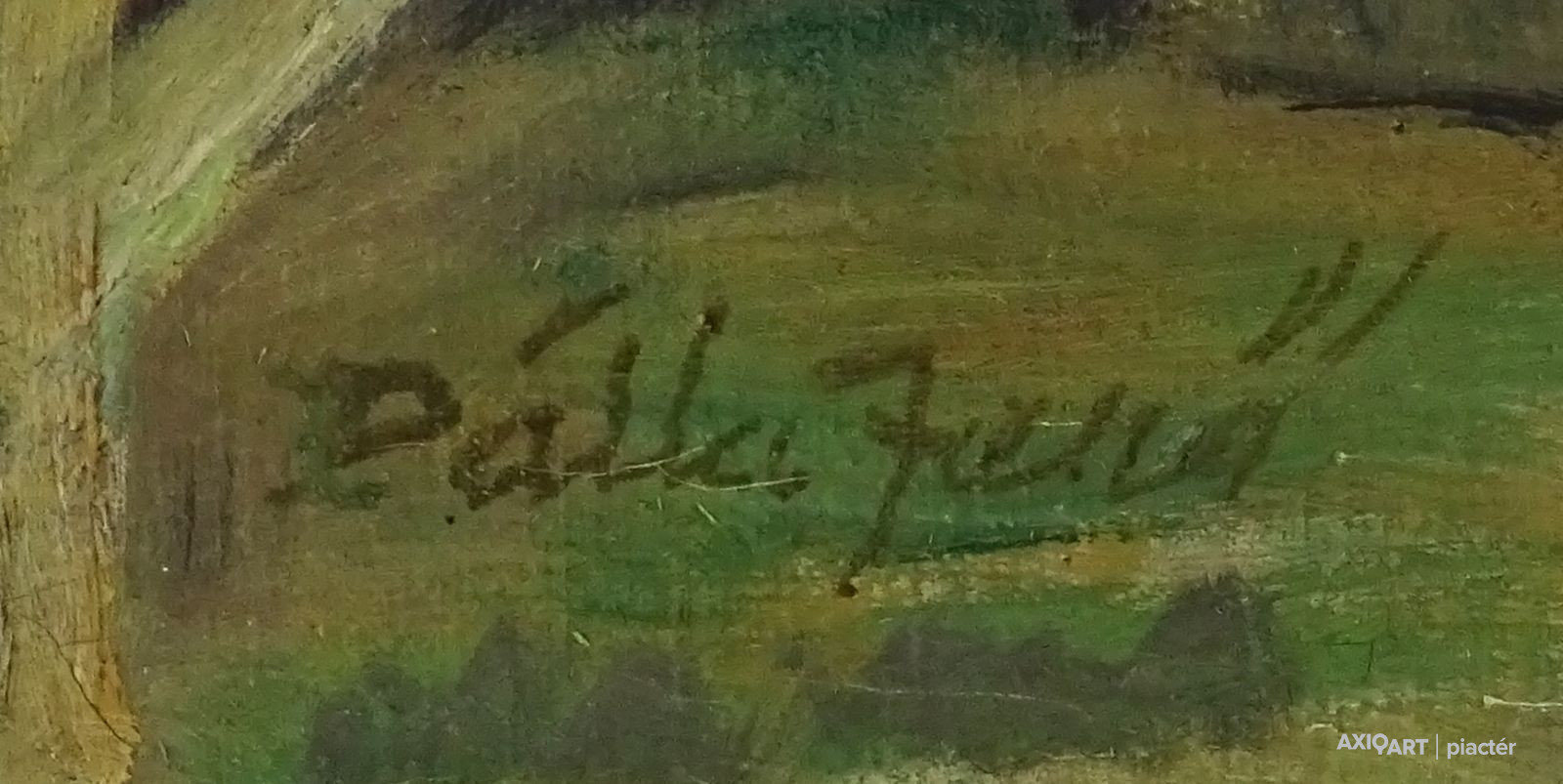 [1T394/021] Olaj vászon festmény aranyozott keretben. Azonnal falra akasztható állapotban van. Akasztási lehetőséggel rendelkezik. Balra lent jelzés: PÁLLA JENŐ Magasság: 74.5 cm Szélesség: 94.5 cm Súly: 3.79 kg