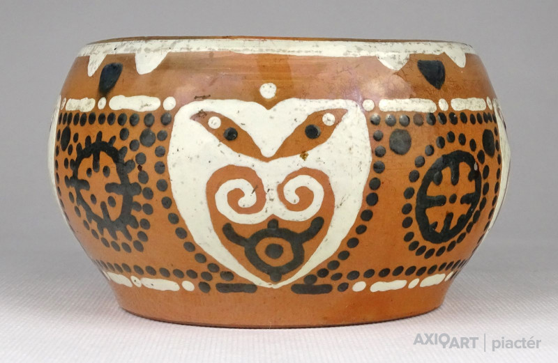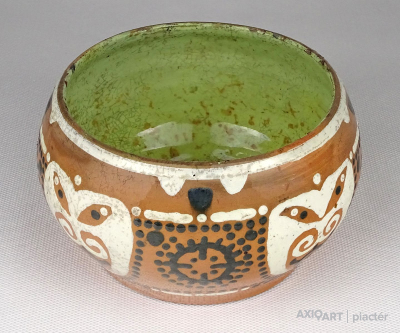 [1O192/UZ-N] Antik, szép állapotú jelzett mázas kerámia váza. Oldalán kézzel festett máz alatti népi szecessziós díszítés. Alján jelzés: PJ (P.J. = Pálla Jenő) Magasság: 8 cm Szélesség: 13 cm Súly: 0.285 kg