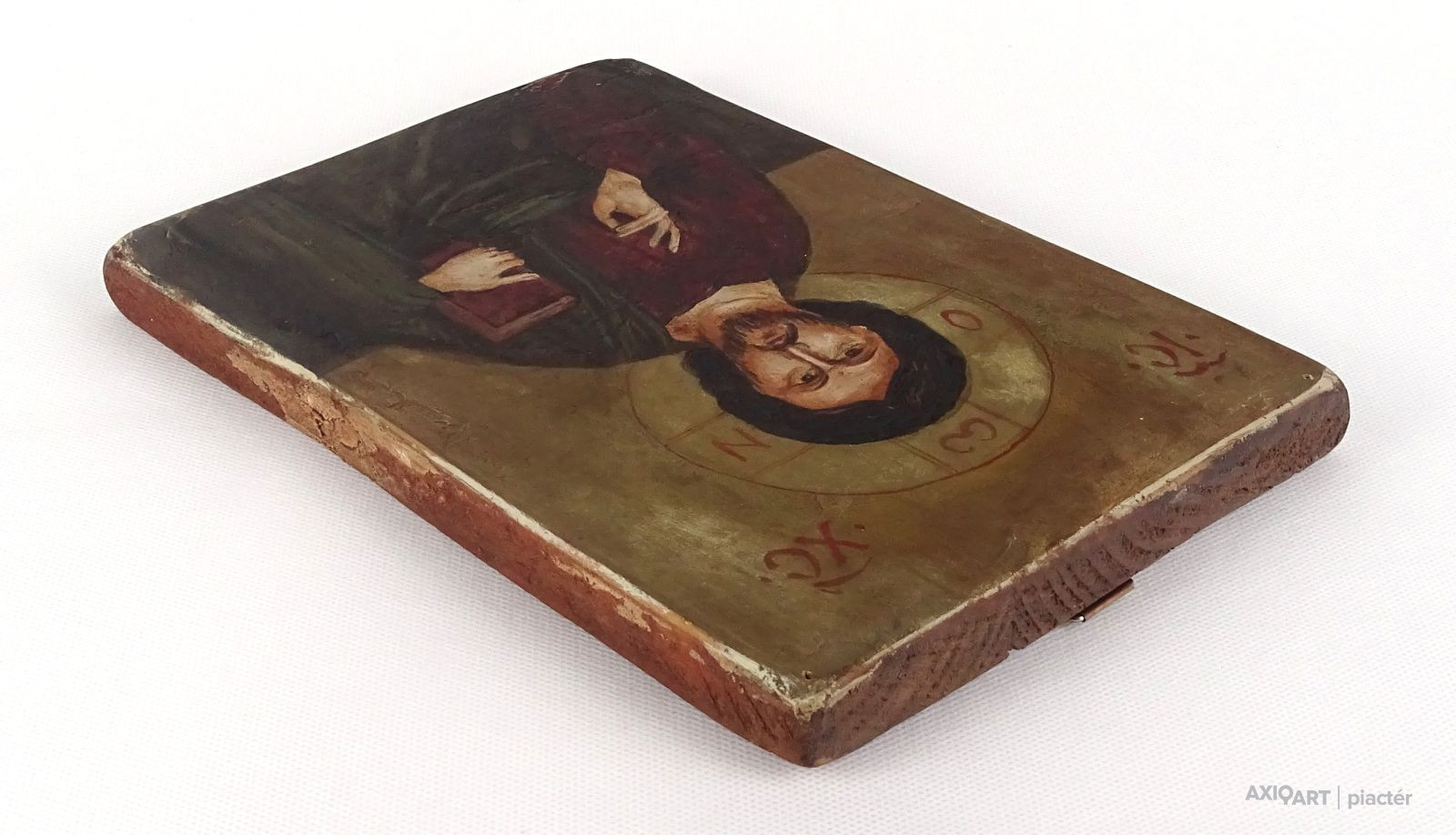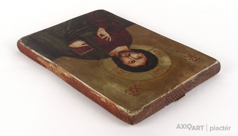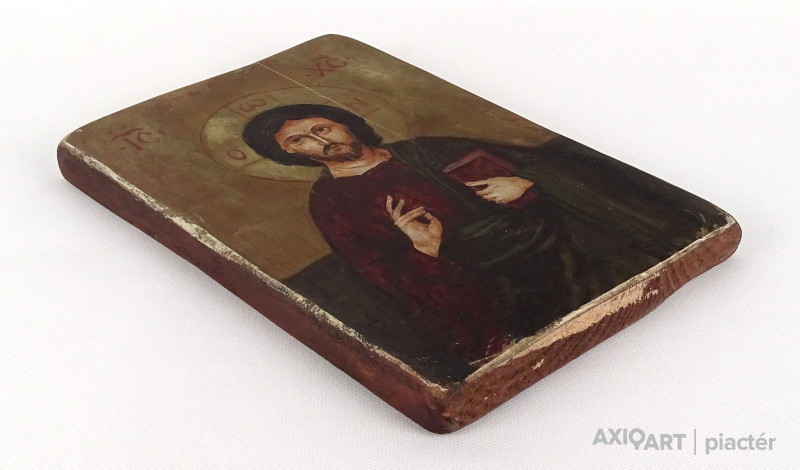 [1Q822/143] Fa táblára festett ikon. Hátoldalán falra akasztási lehetőség. Magasság: 25 cm Szélesség: 16.5 cm Súly: 0.345 kg Pantokrátor   Pantokrátor, 6. századi ikon a sínai Szent Katalin-kolostorból. Az arc két oldalán található arckifejezés a hiposztatikus uniót jelképezheti, az isteni és emberi természet egységét (teljesen Isten és teljesen ember) Krisztusban. Pantokrátor, (görögül παντοκράτωρ) jelentése 'mindenható', 'a mindenség ura'. A szó eredetileg Zeusz egyik mellékneve volt (pantokratis), és a biblia fordításában, a Septuaginta görög nyelvű könyvében jelent meg mint Jahve Zebaot egyik mellékneve. Az Újszövetségben a megnevezés a Második korinthoszi levélben egyszer, a Jelenések könyvében összesen kilencszer szerepel, és mindig az Atyaistenre vonatkozik. Máté evangéliumában (Mát 28,18) ugyan értjük a kifejezés alatt Jézust, de teljes mértékben csak a negyedik században következik be a jelentésbeli személycsere. Ma az ikonográfiában a "Krisztus Pantokrátor" az ikonok egy fajtájára, típusára vonatkozik. A motívum elsősorban a bizánci művészetben nagyon élő, a legtöbb görögkatolikus ill. ortodox templomban megtalálható. A Krisztus-ikon általában az apszis hajlatában vagy az ikonosztázionban található. Jellegzetes minden pantokrátor-ábrázolásra a szemlélőre egyenesen letekintő Krisztus, az áldást osztó jobb kéz és a nyitott evangélium a bal kézben. A pantokrátor ábrázolás Jézus Krisztus isteni mivoltát hangsúlyozza, világ fölötti megváltó uralmát.A Pantokrátor az utolsó ítélet Krisztusa, aki bíróként elfogad vagy elutasít. Az ortodox templomok ikonosztázain a Pantokrátor középen található, rendszerint a többi alaknál nagyobb méretben. Az ítélő Krisztus általában díszes trónon foglal helyet, a baljában lévő evangéliumos könyvön pedig a Máté-evangélium részlete olvasható: "Jöjjetek atyám áldottai". Jobb kezével őket áldja meg, miután a "juhokat" szétválasztotta a "kecskéktől".   Forrás: wikipedia
